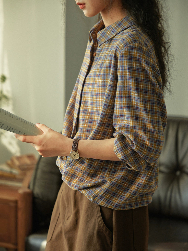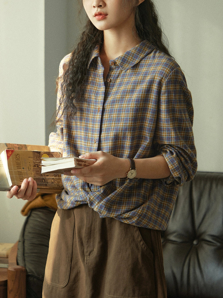 Dámská podzimní umělecká kostkovaná košile s límcem dole, 100% bavlna