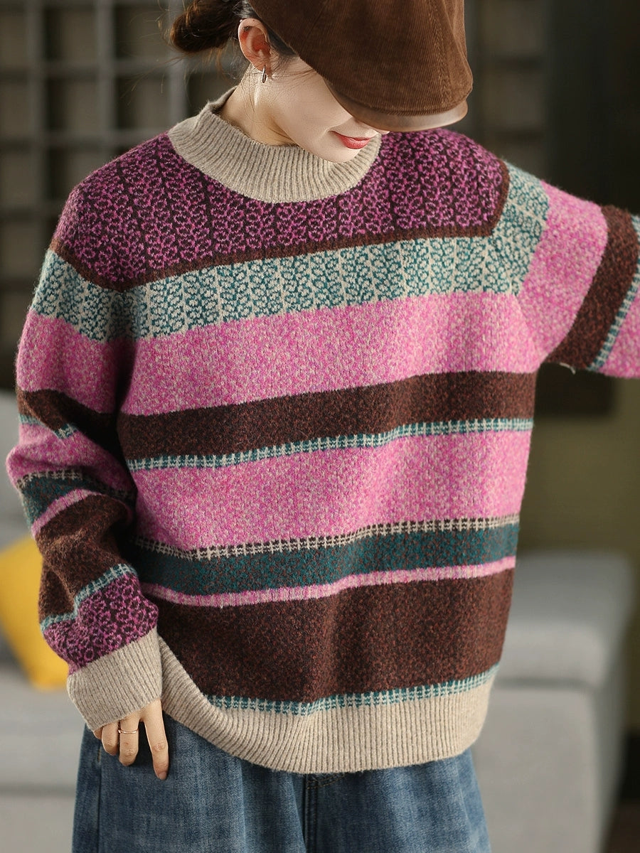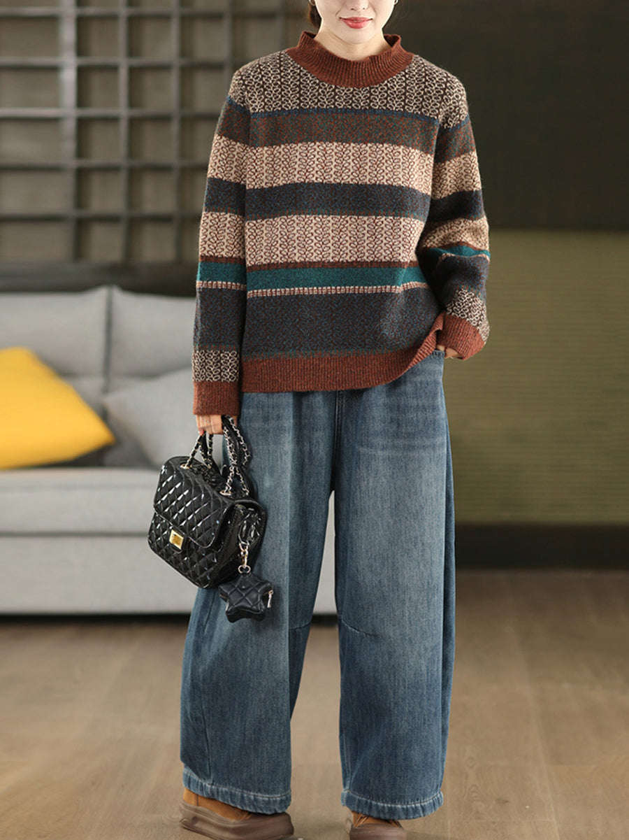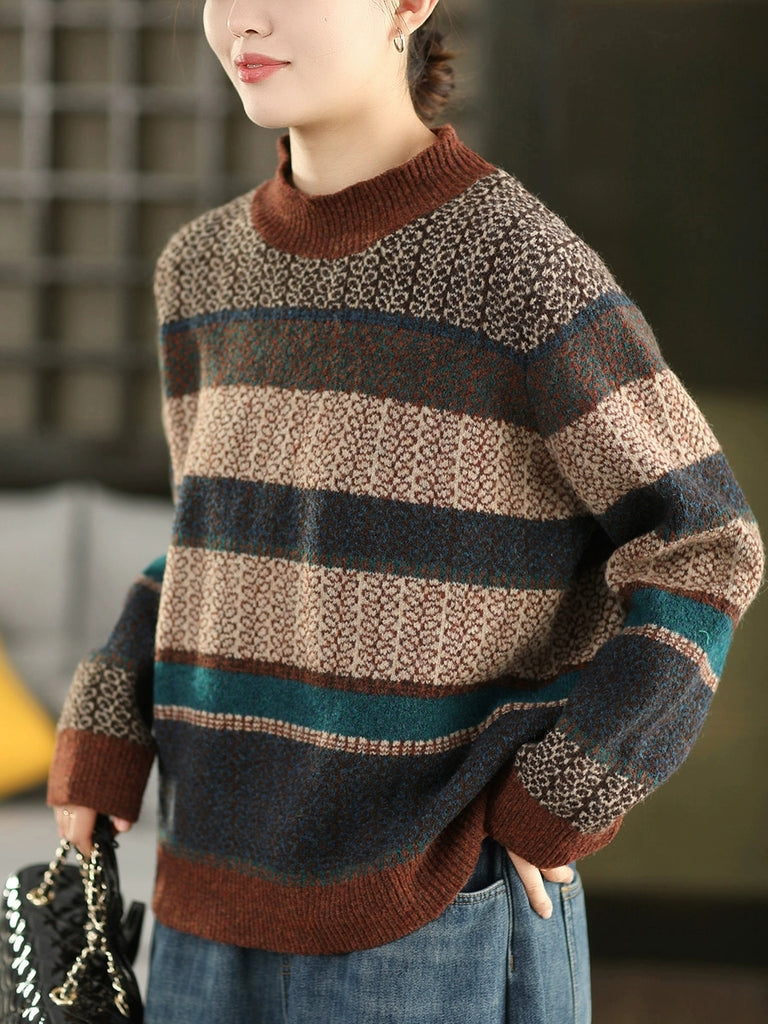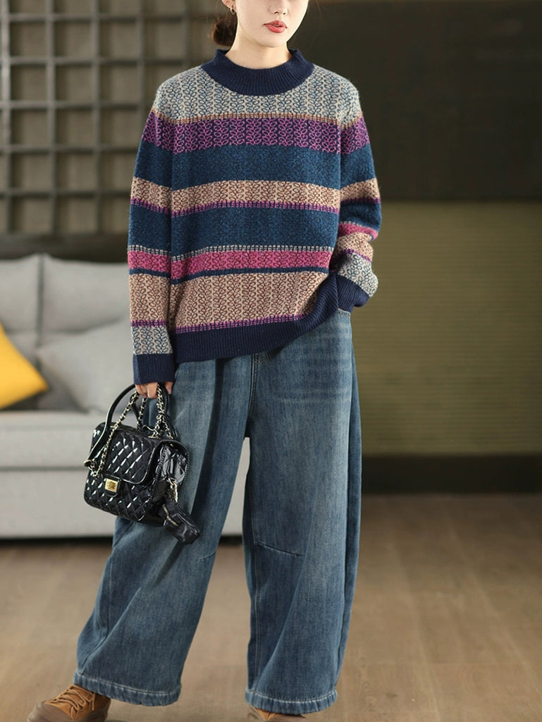 Dámský podzimní umělecký pruhovaný svetr s půlrolátkem