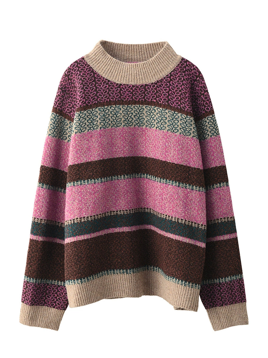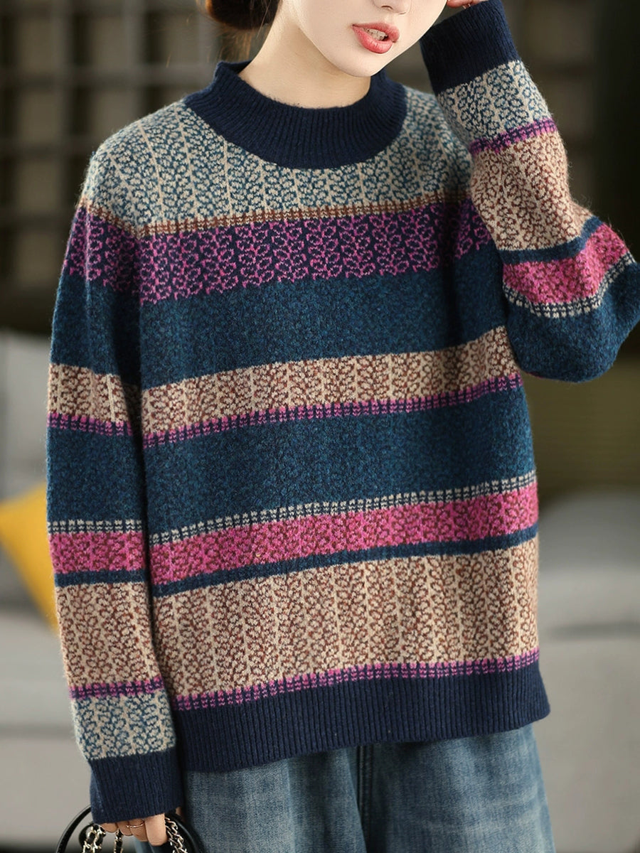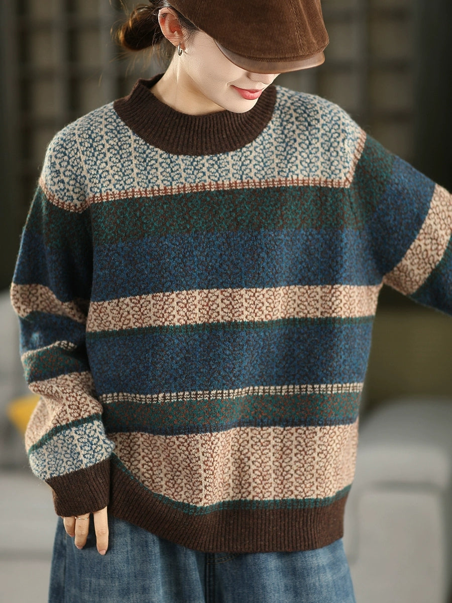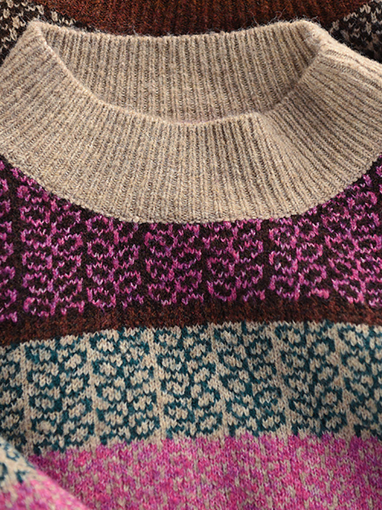 Dámský podzimní umělecký pruhovaný svetr s půlrolátkem