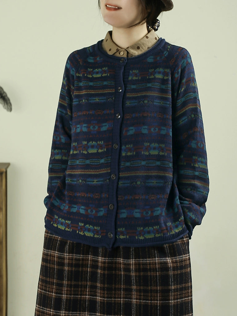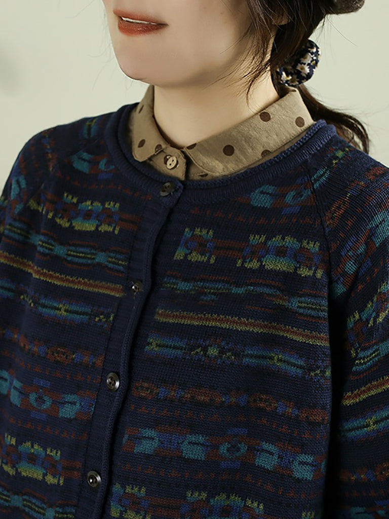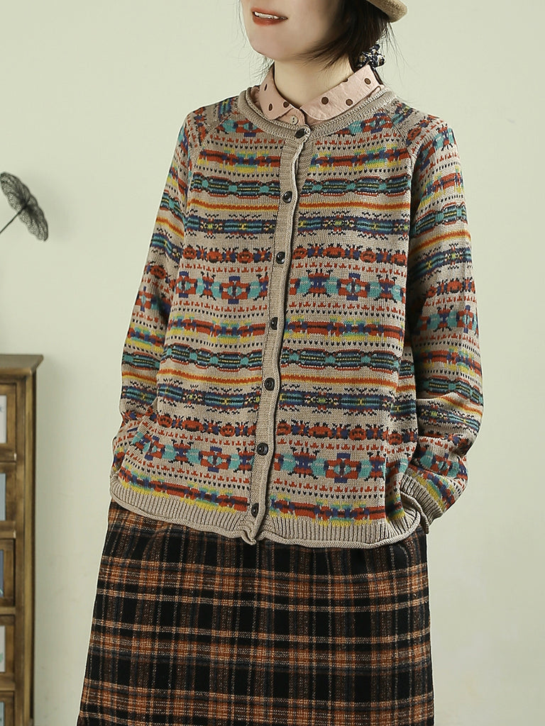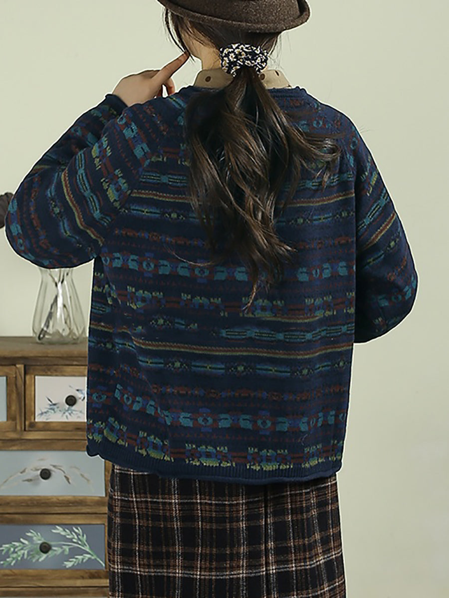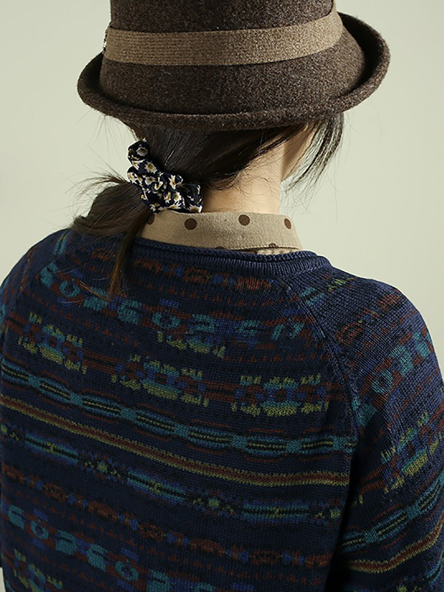 Dámský podzimní pletený svetr s uměleckými pruhy a výstřihem do O-neck
