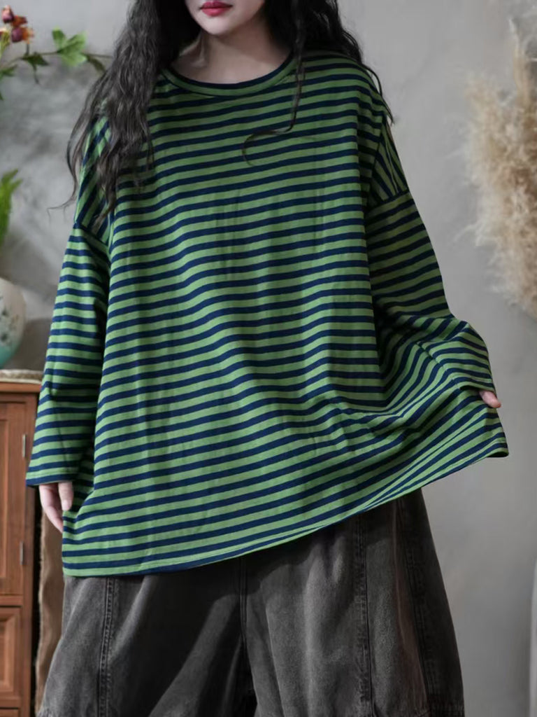 Dámská podzimní ležérní pruhovaná halenka s výstřihem do O-neck ze 100% bavlny