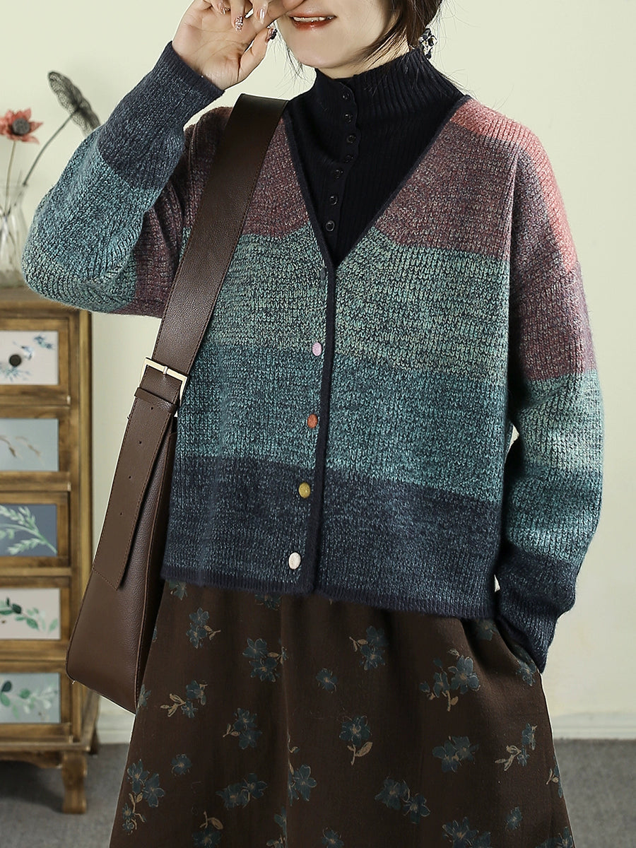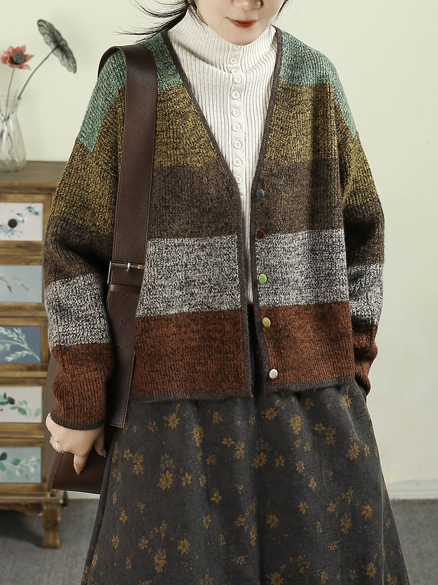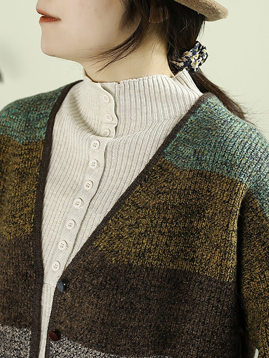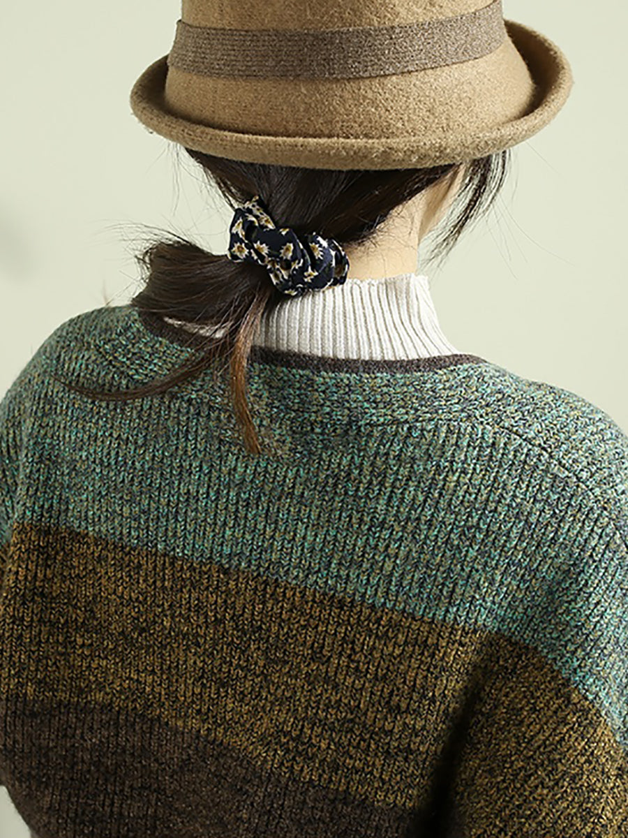 Dámský podzimní pletený svetr s barevnými bloky a výstřihem do V