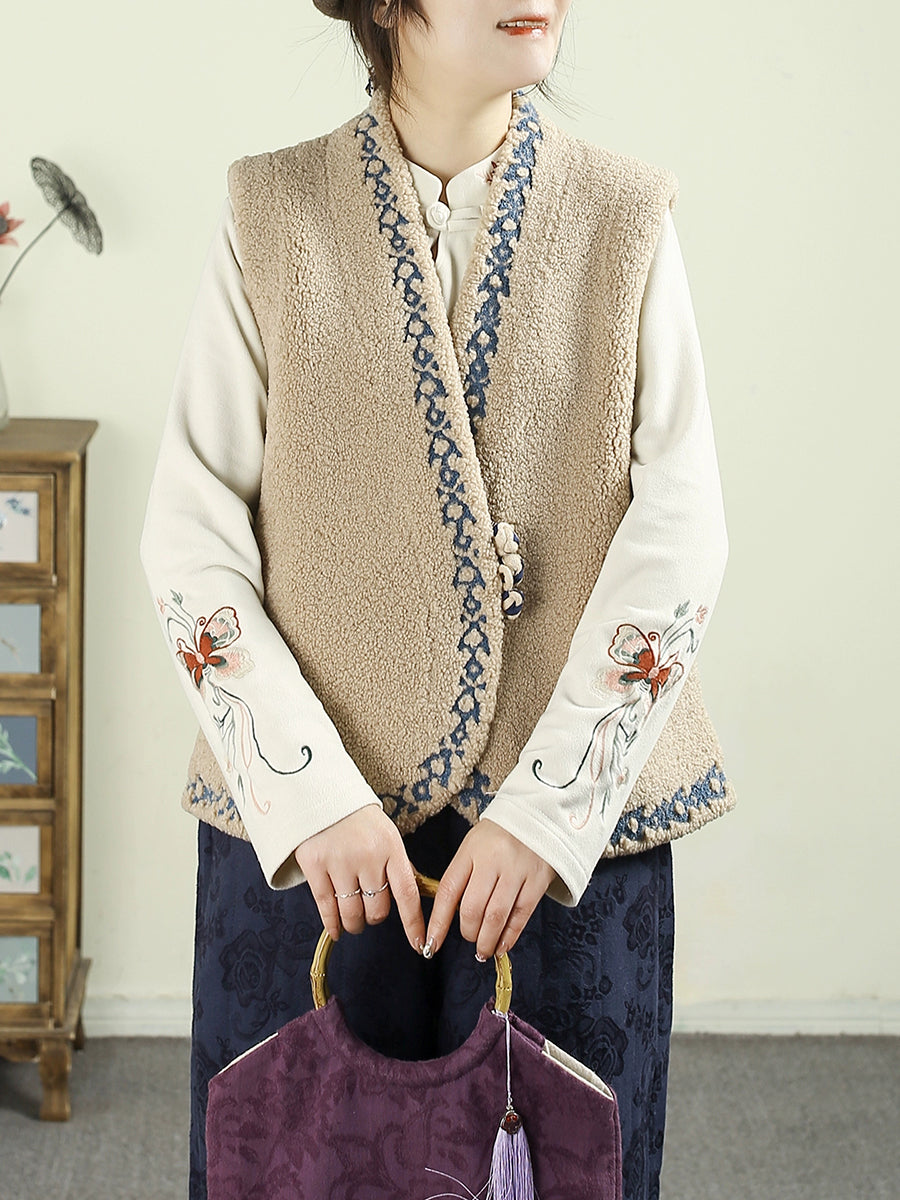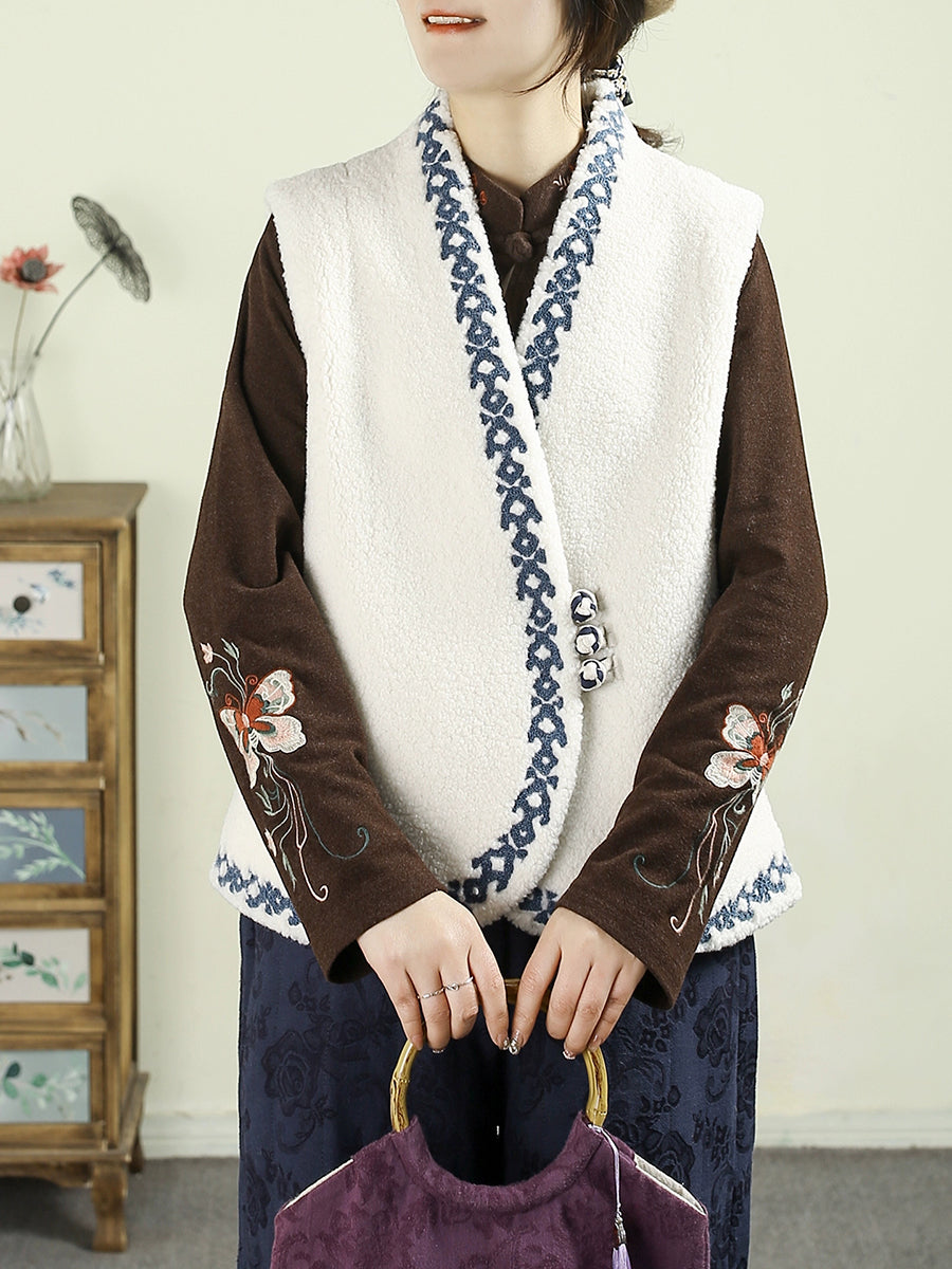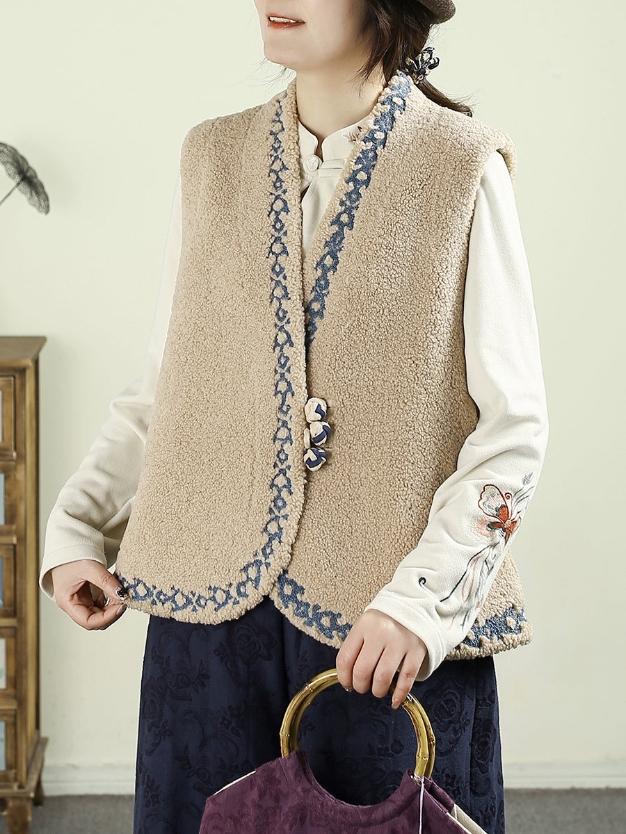 Dámská podzimní fleecová vesta s výstřihem do V a výšivkou