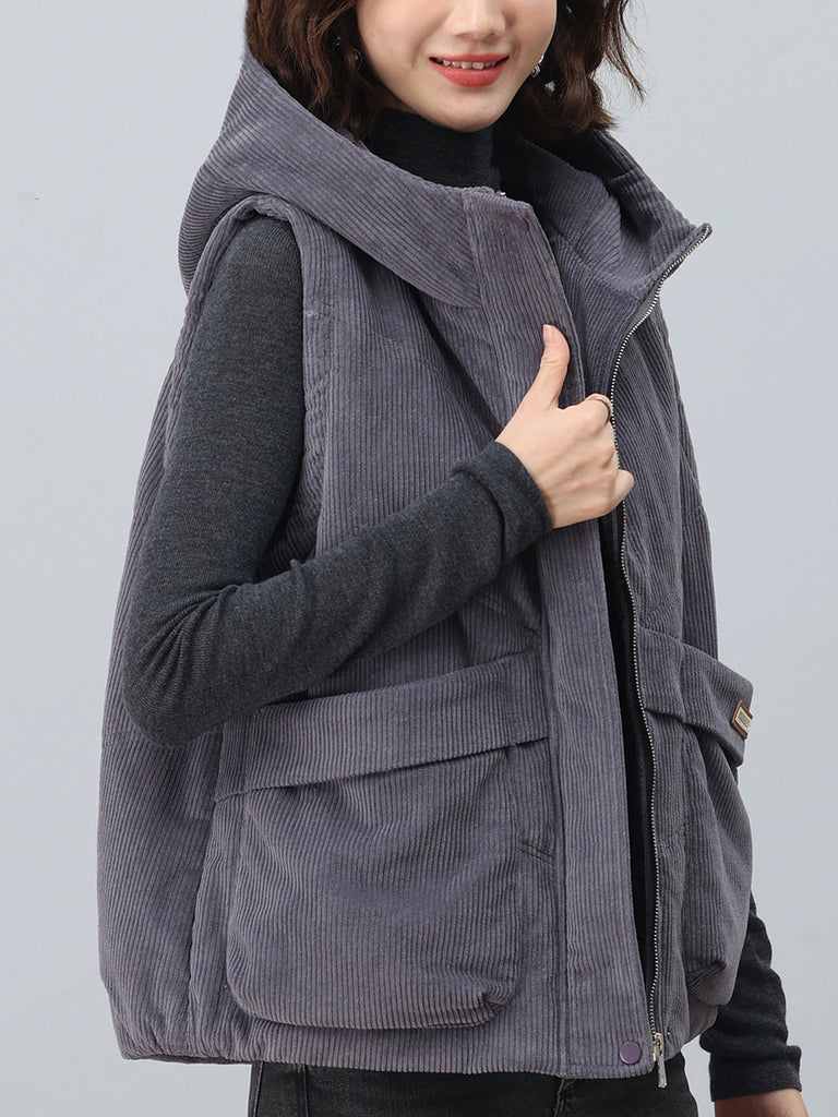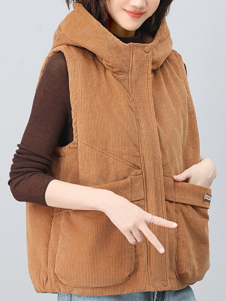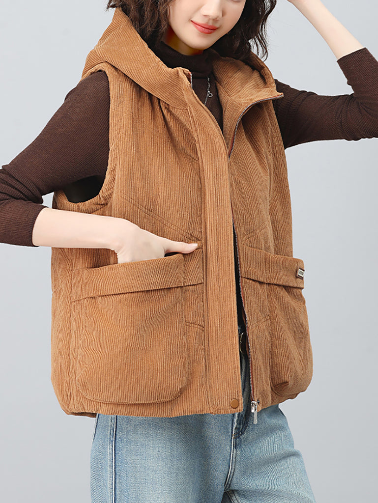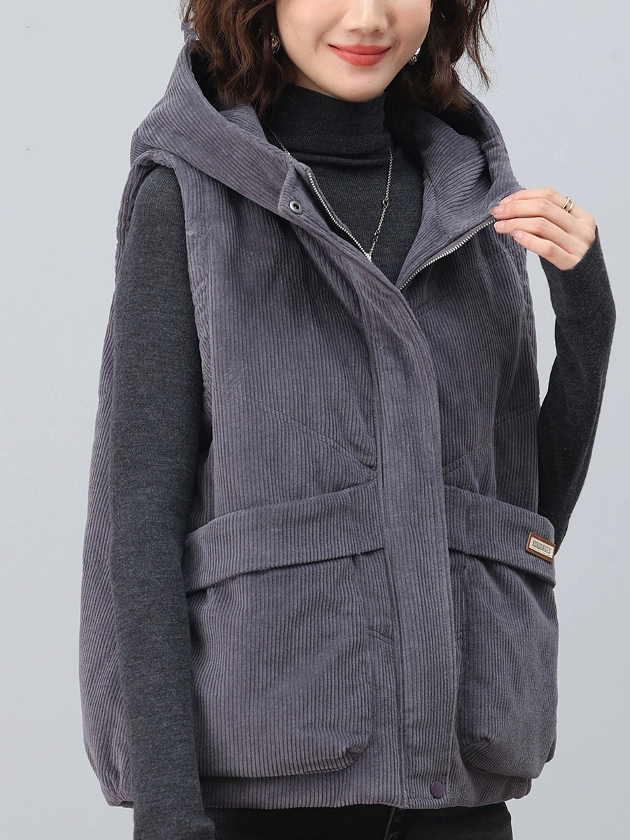 Dámská podzimní retro čistě barevná manšestrová vesta s kapucí