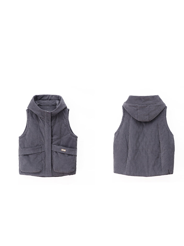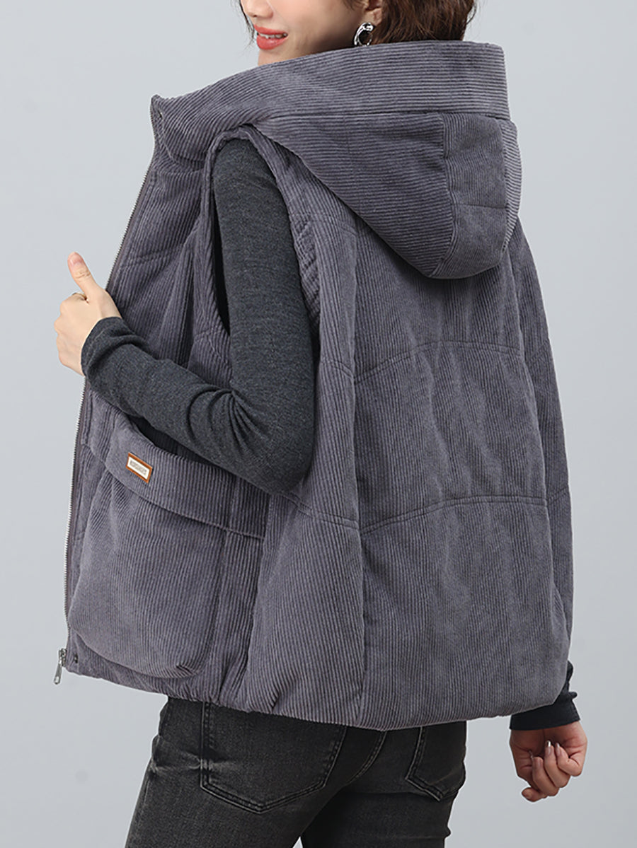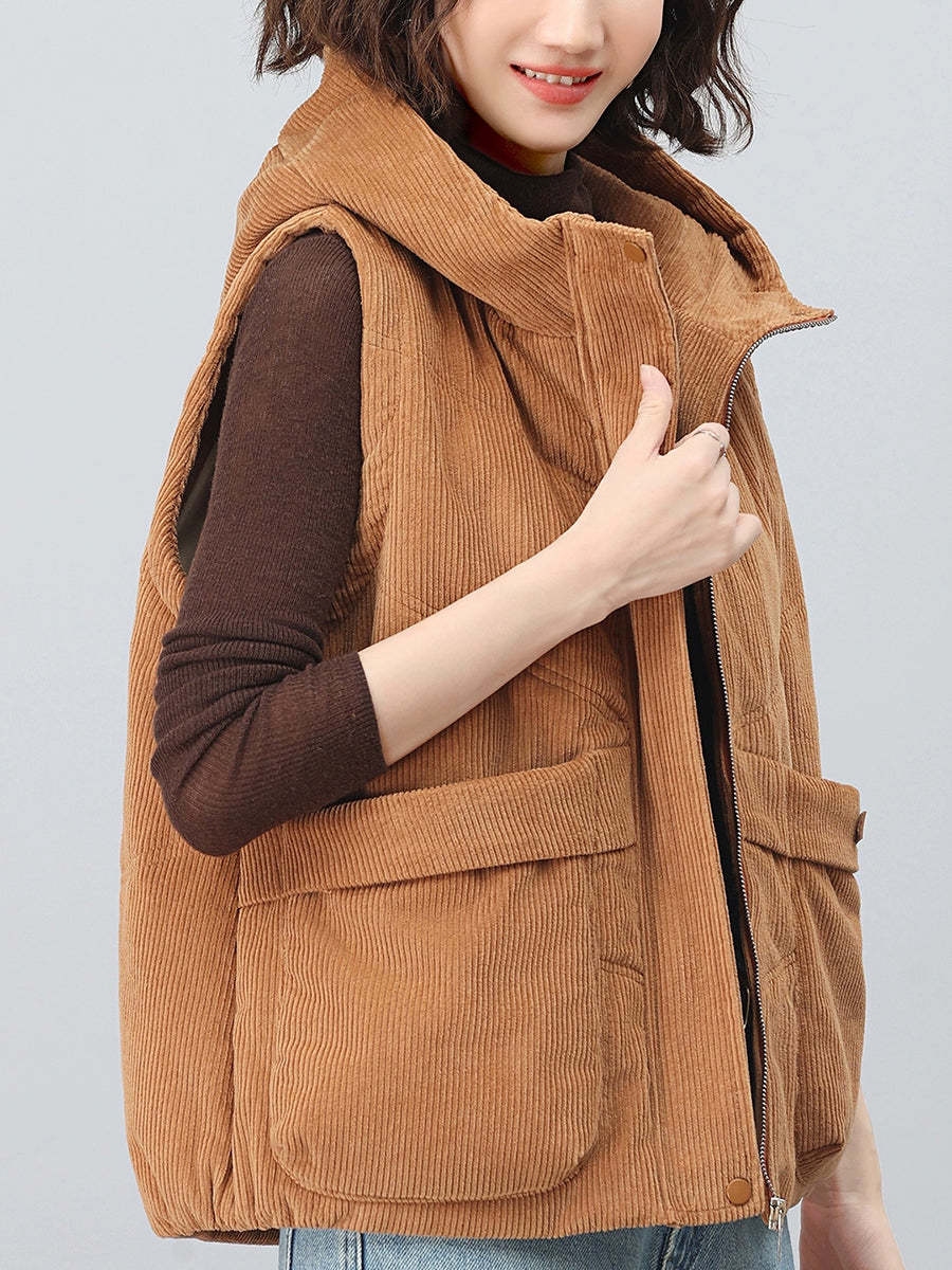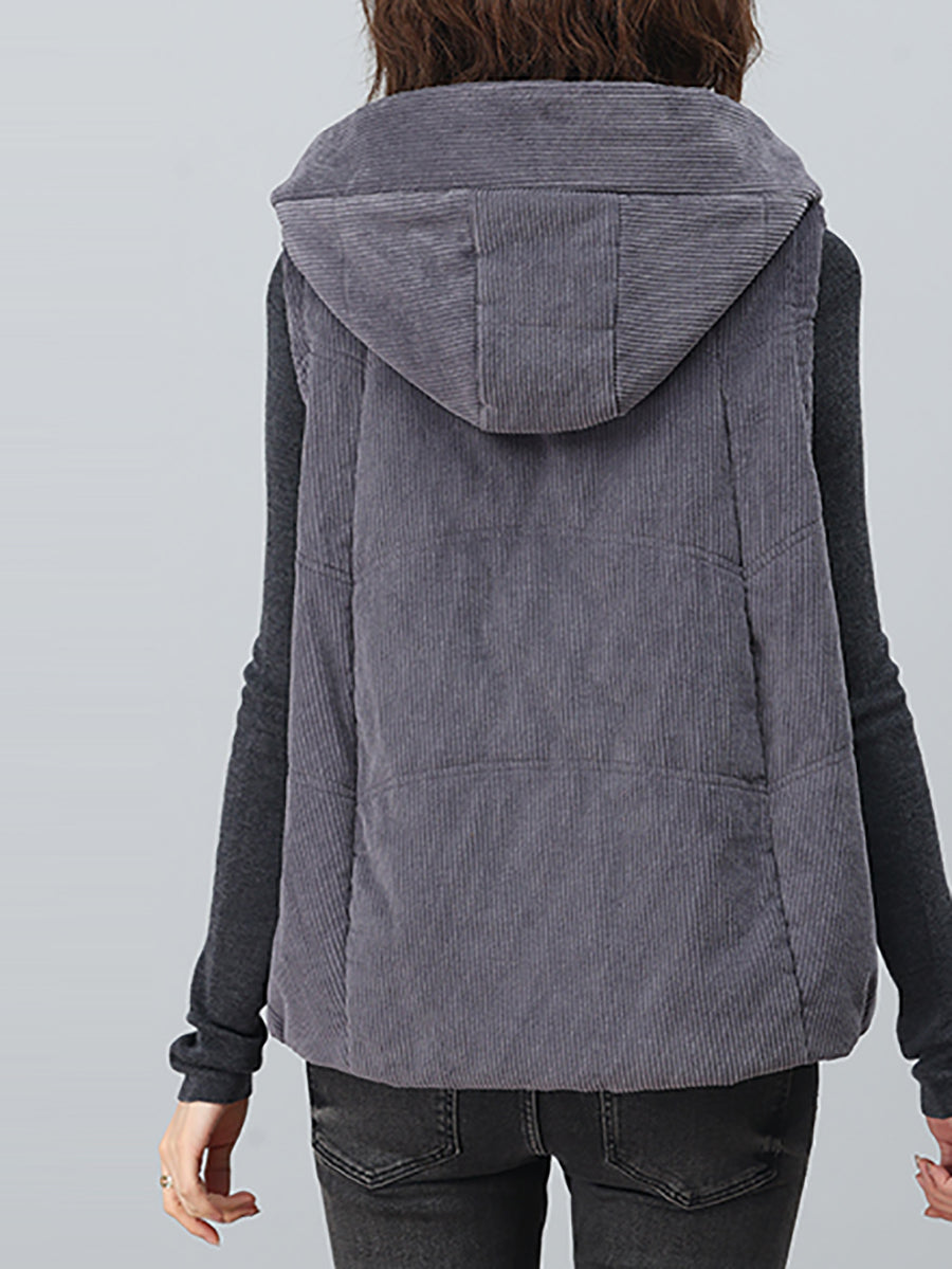 Dámská podzimní retro čistě barevná manšestrová vesta s kapucí
