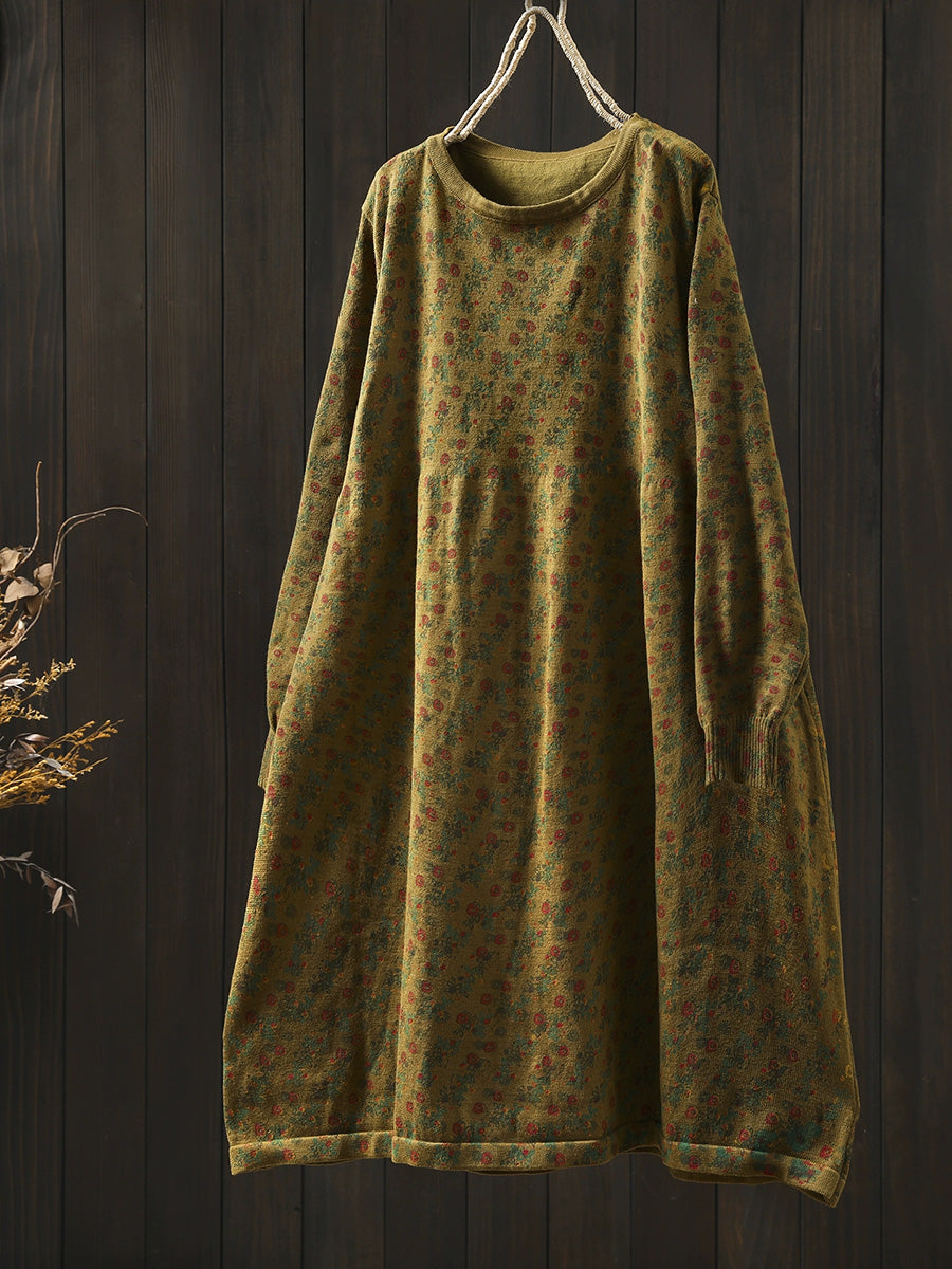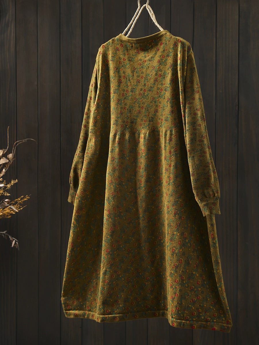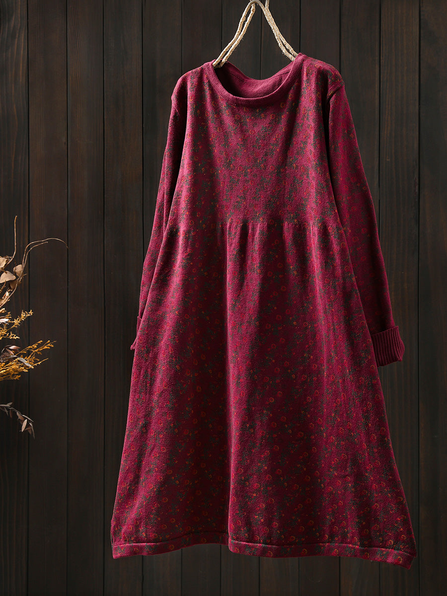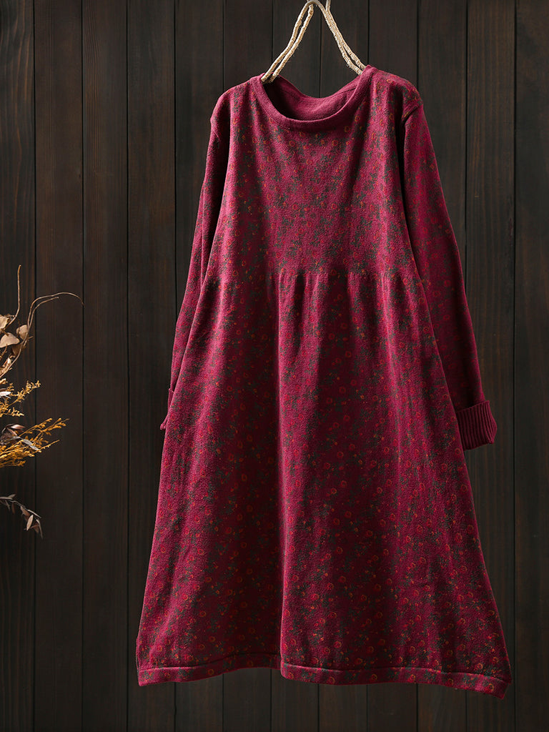 Dámské podzimní vintage květinové pletené šaty s výstřihem do O-neck