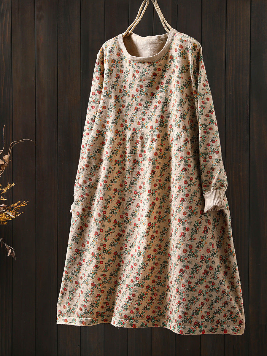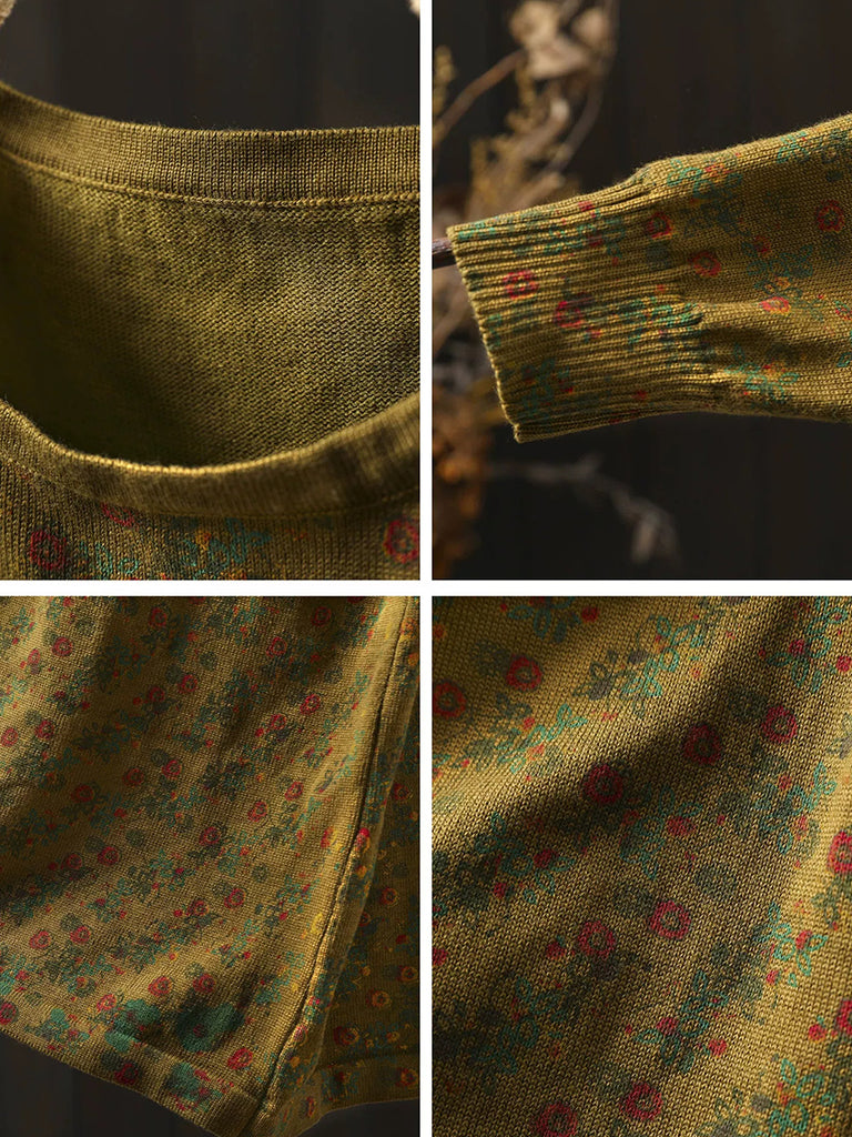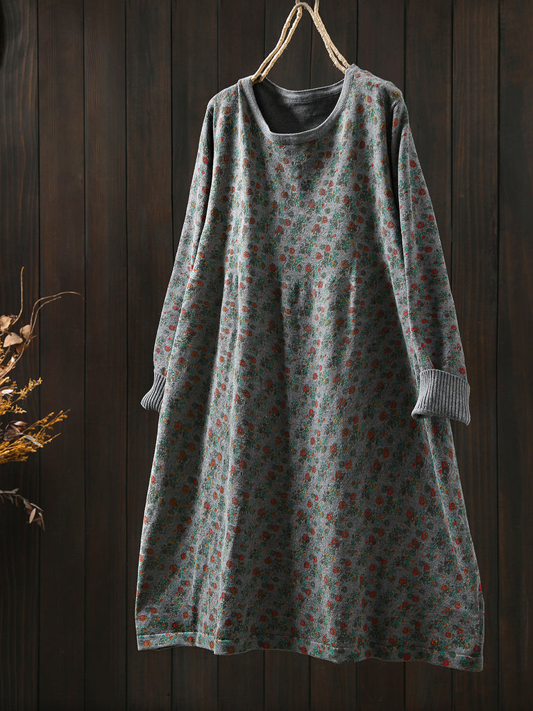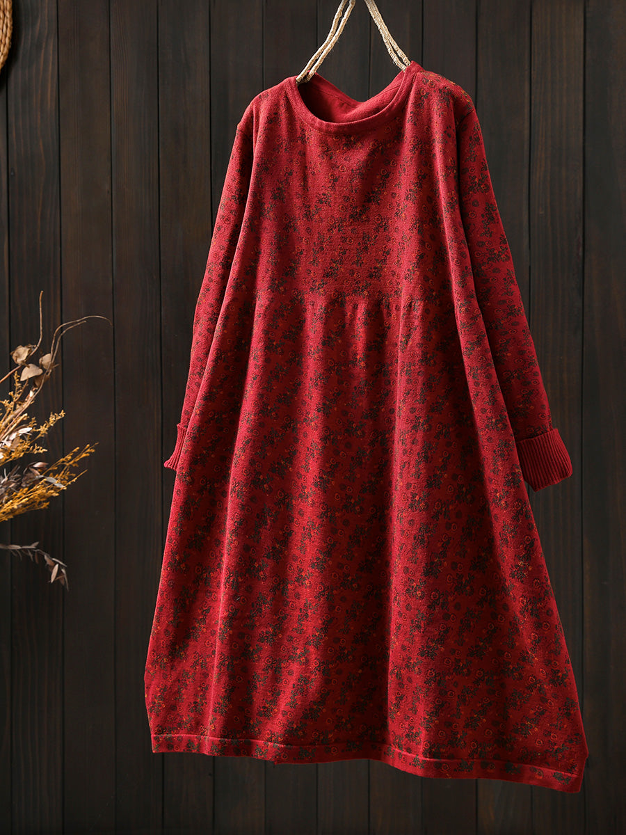 Dámské podzimní vintage květinové pletené šaty s výstřihem do O-neck
