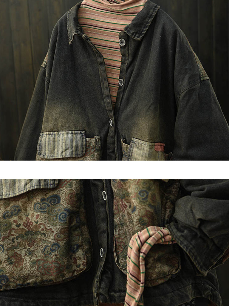 Dámský etnický květinový džínový prošívaný bavlněný kabát