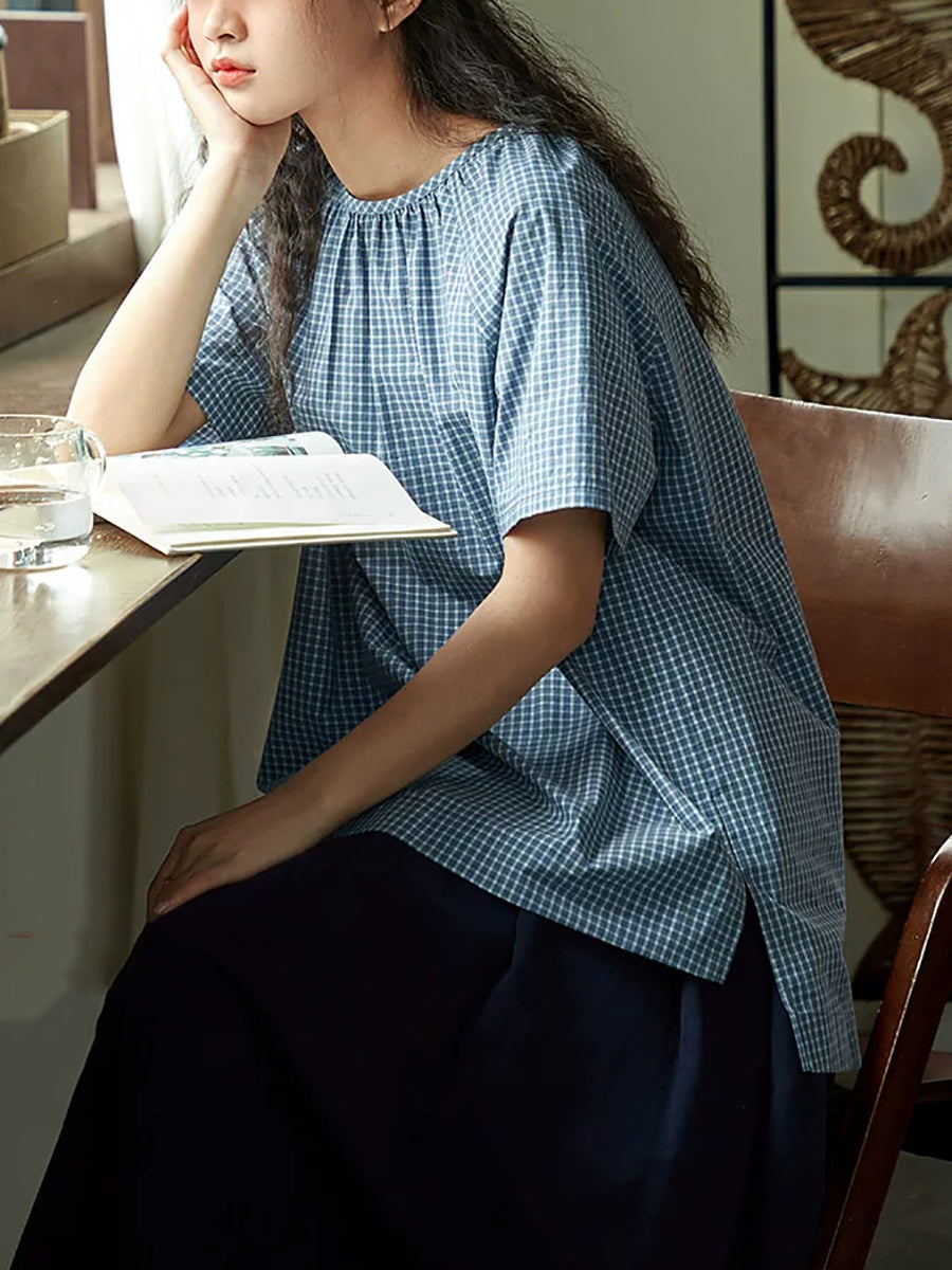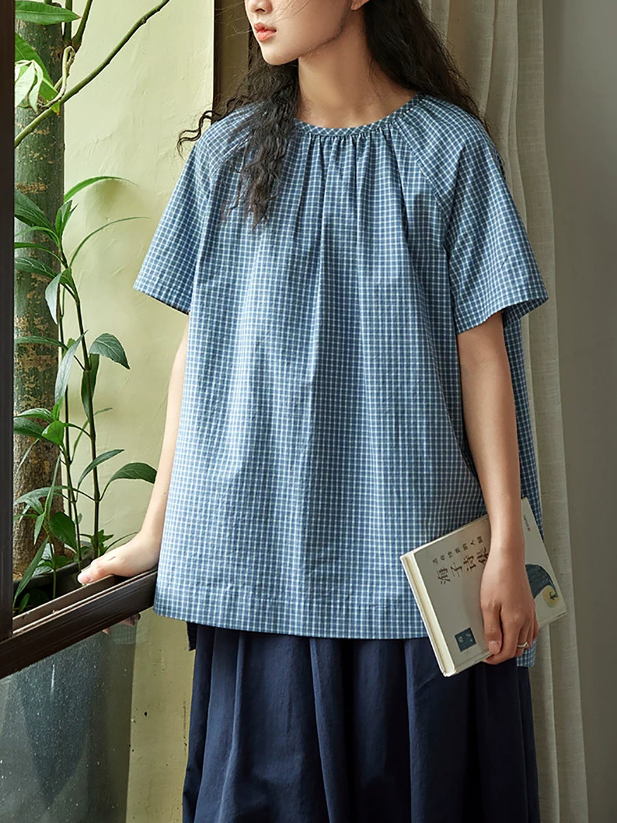 Dámská jarní umělecká kostkovaná bavlněná halenka s výstřihem do O-neck