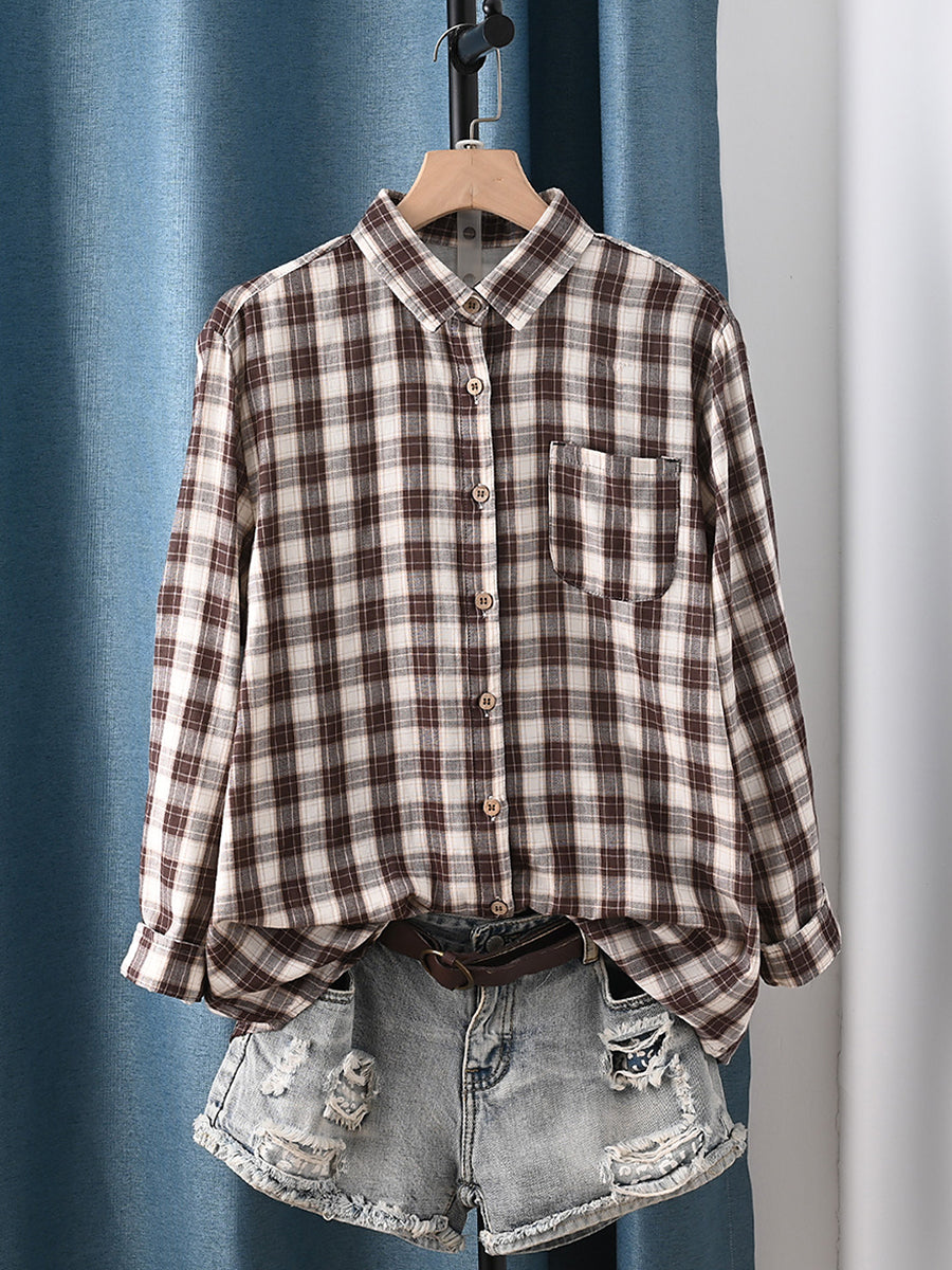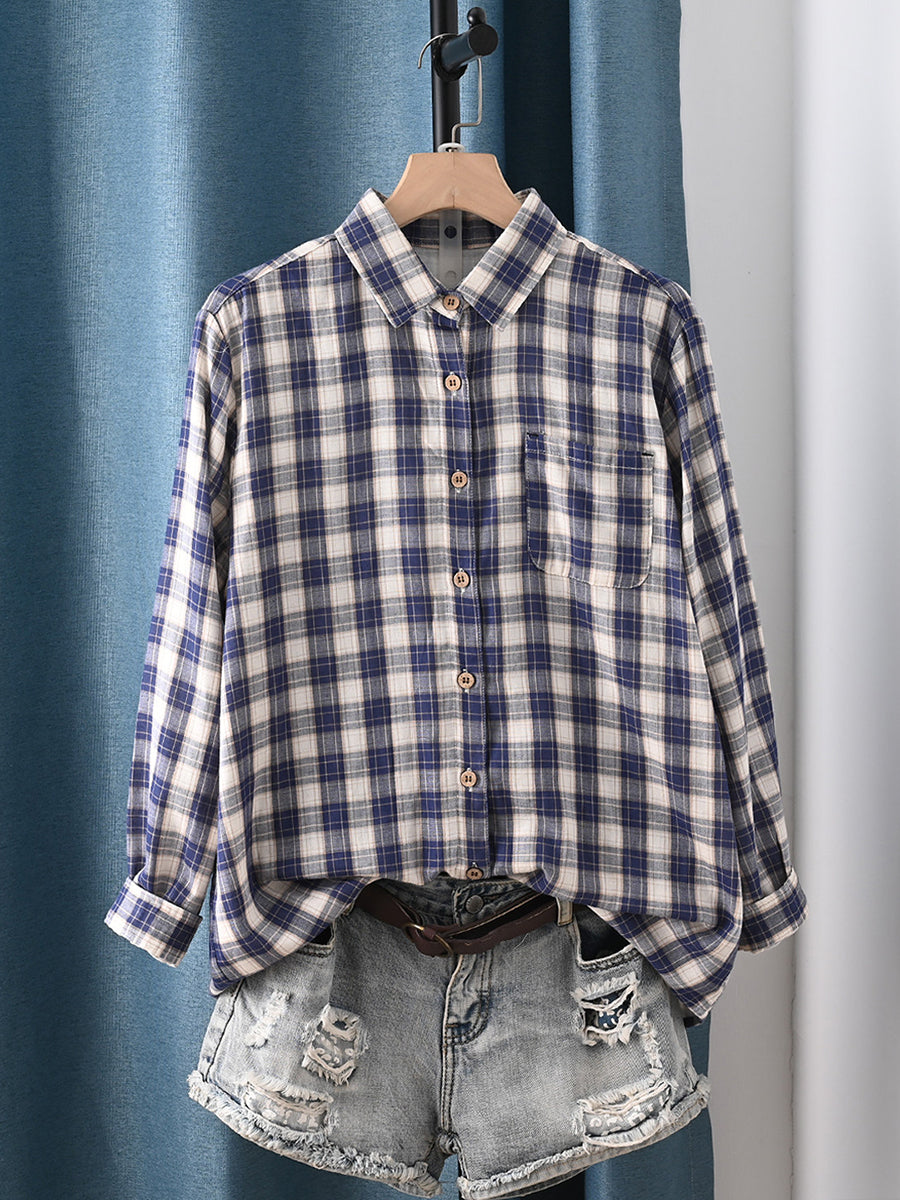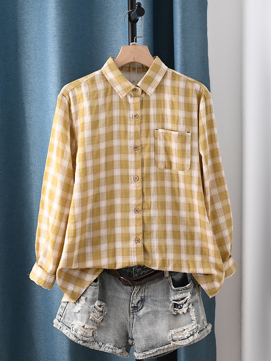 Dámská jarní umělecká kostkovaná košile s odkládacím límcem, 100% bavlna