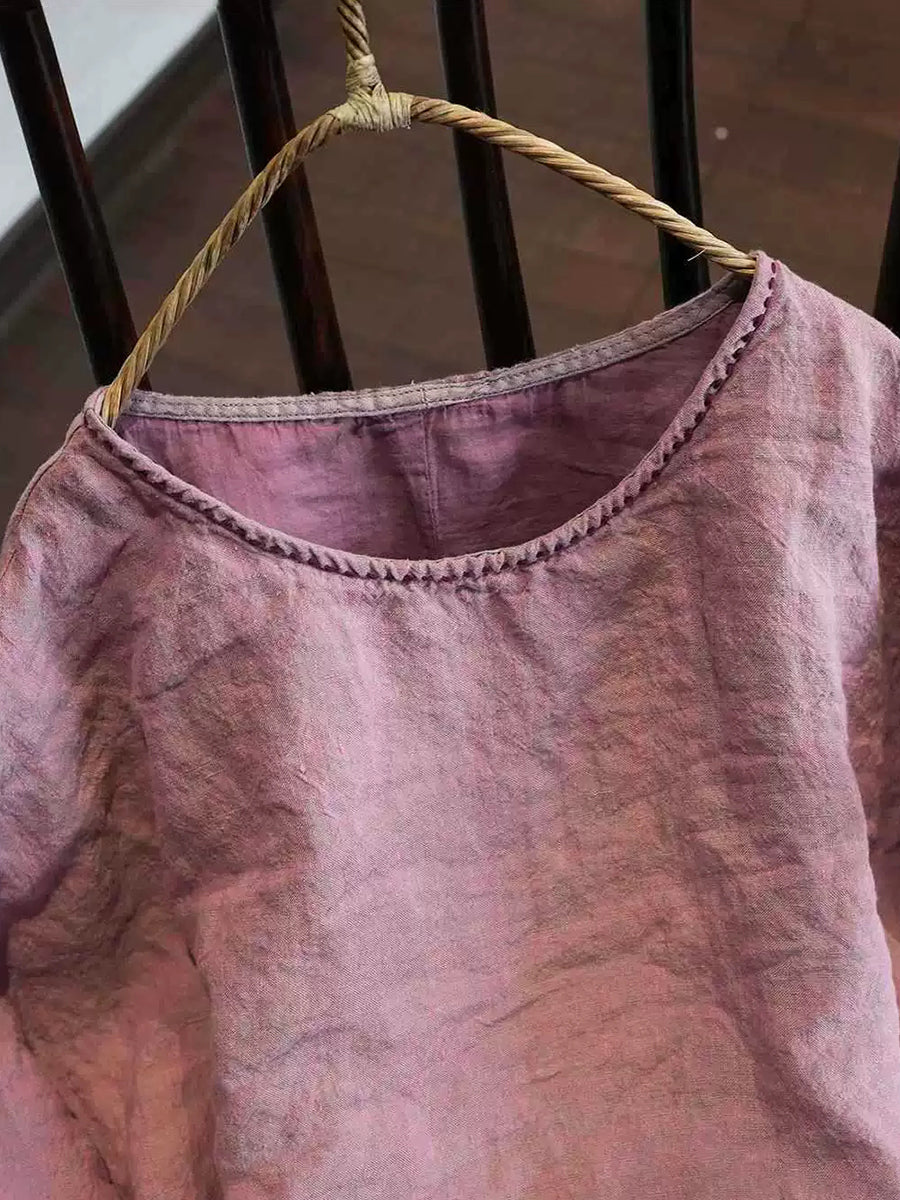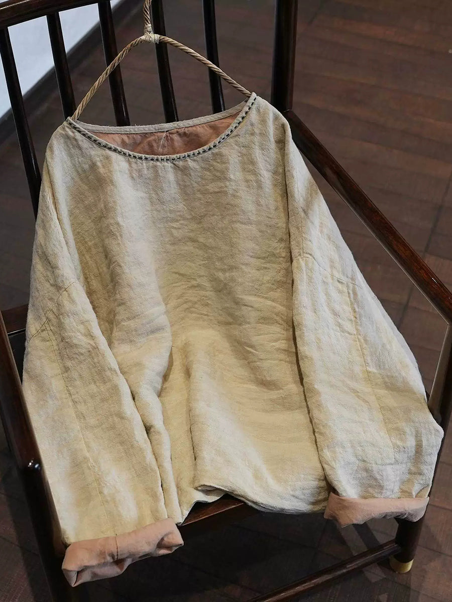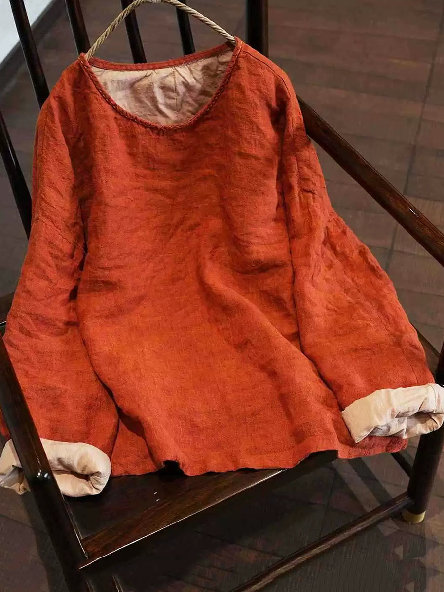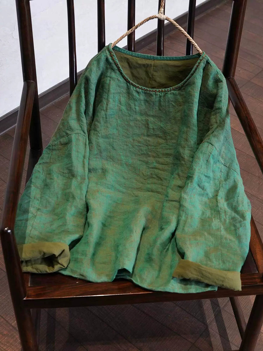 Dámská jarní umělecká čistě barevná lněná halenka s výstřihem do O-neck