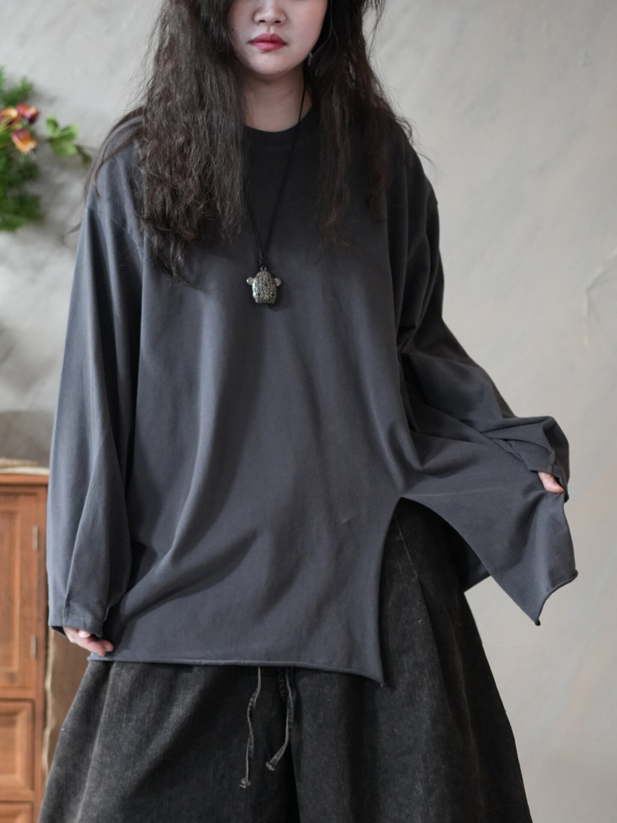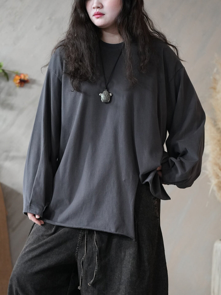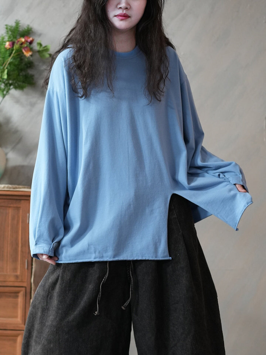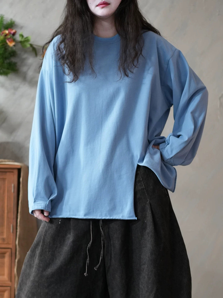 Dámská jarní umělecká čistě barevná halenka s O-krkem a rozděleným lemem