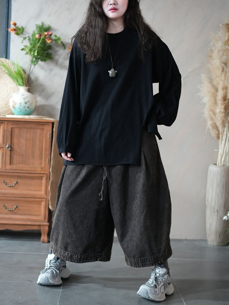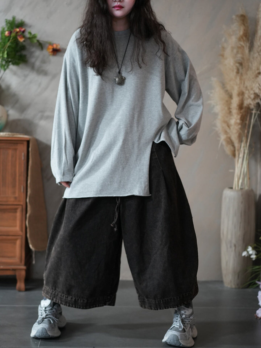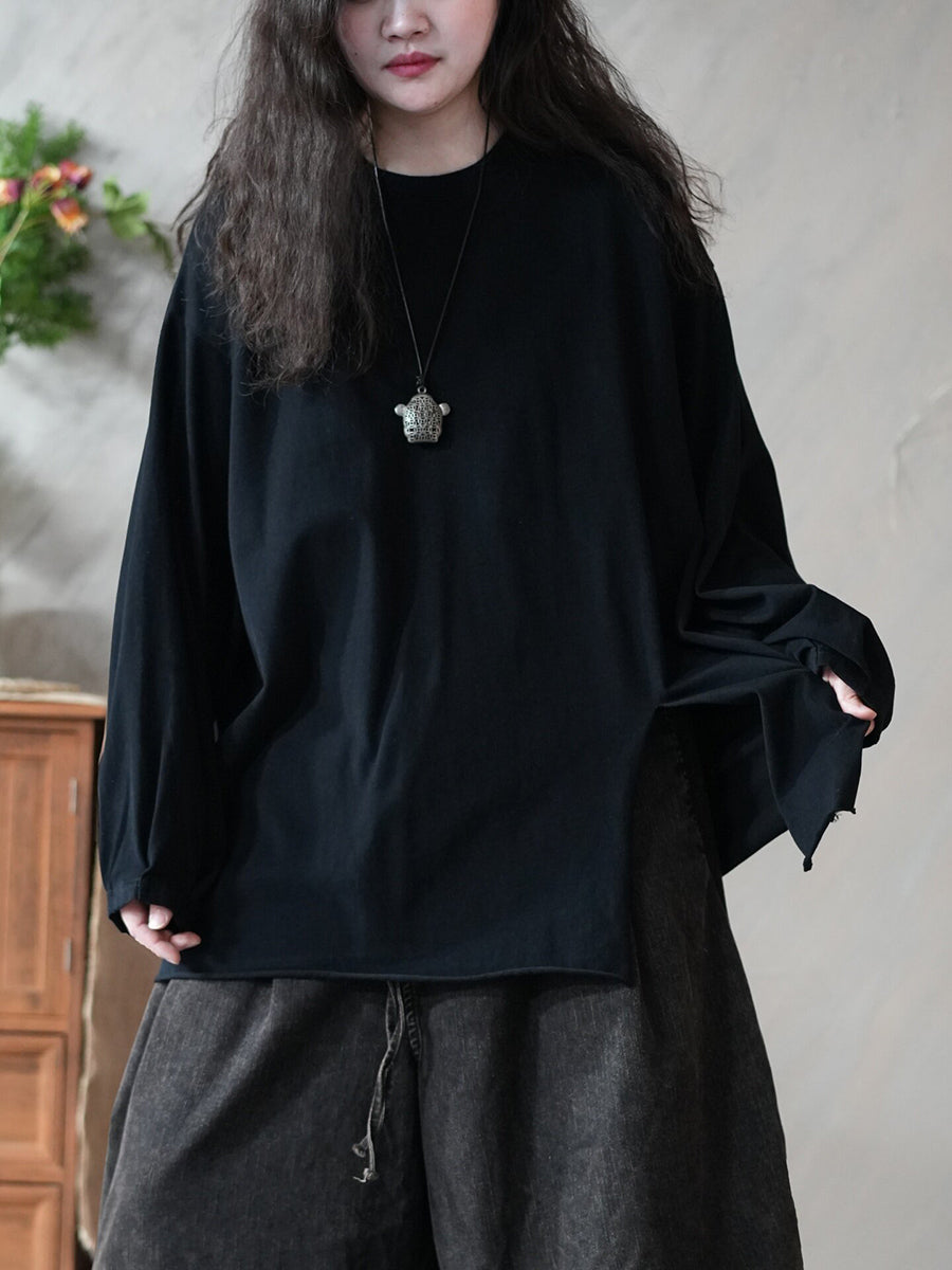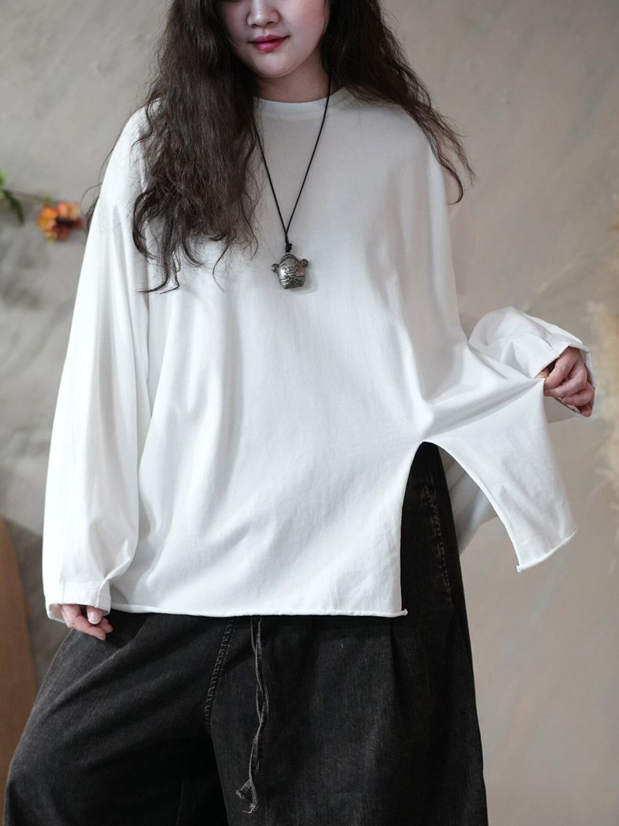 Dámská jarní umělecká čistě barevná halenka s O-krkem a rozděleným lemem