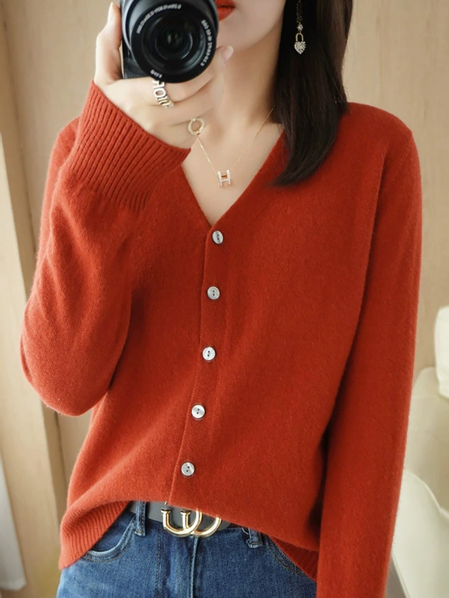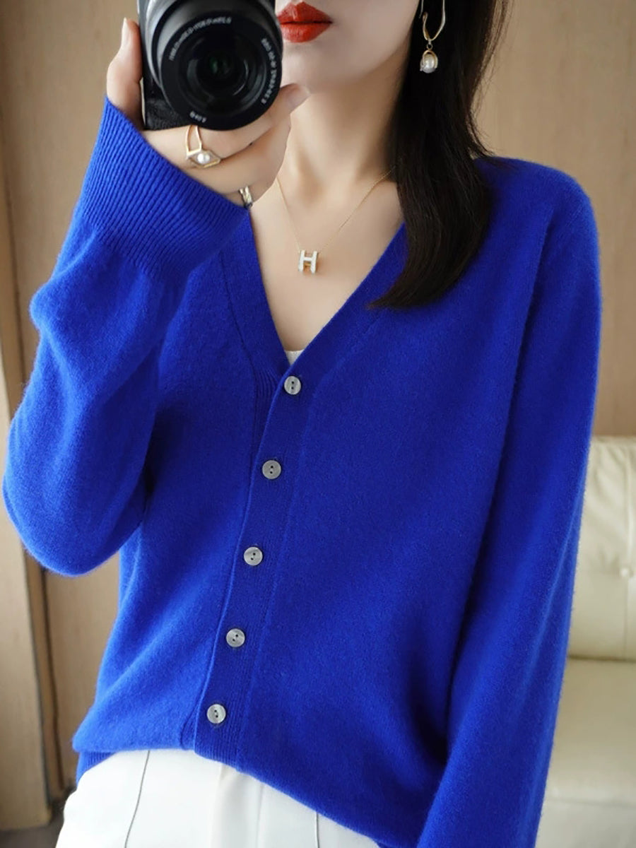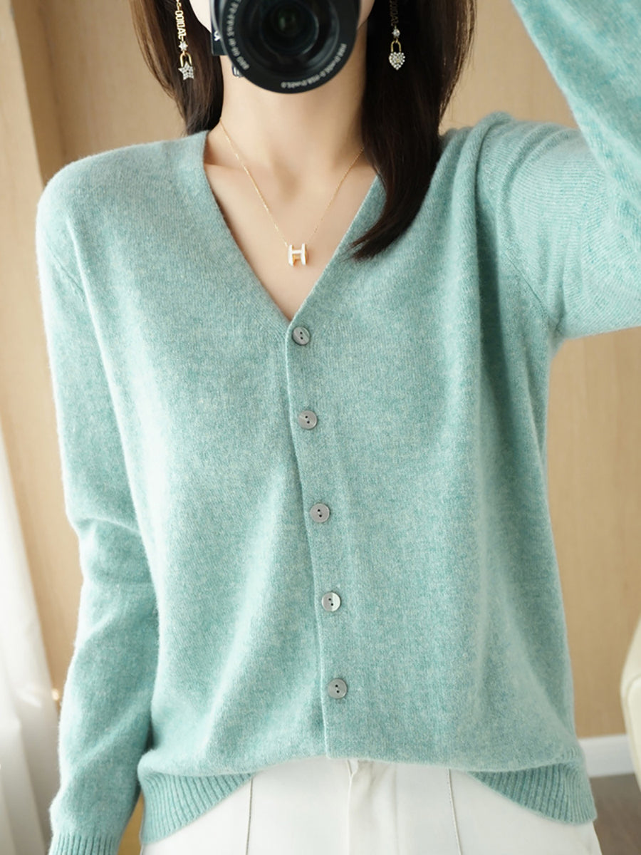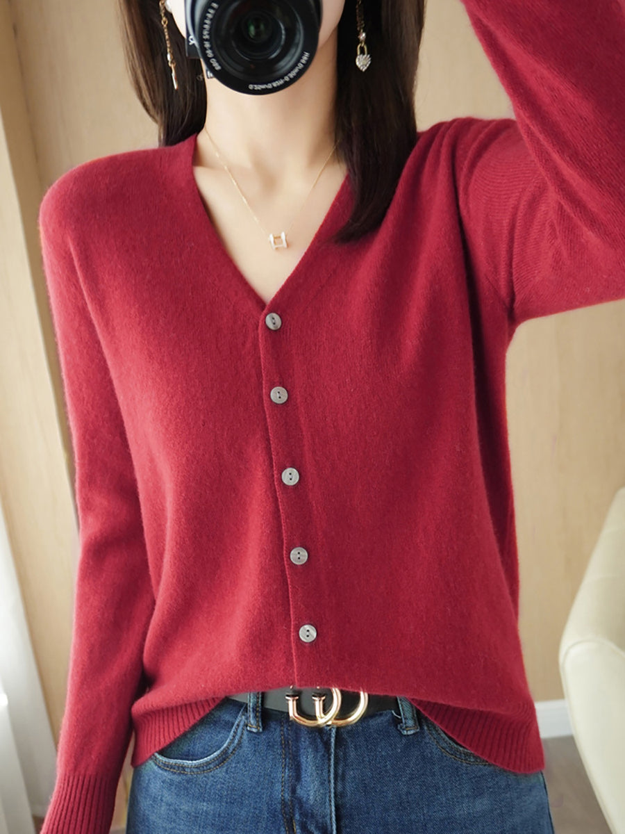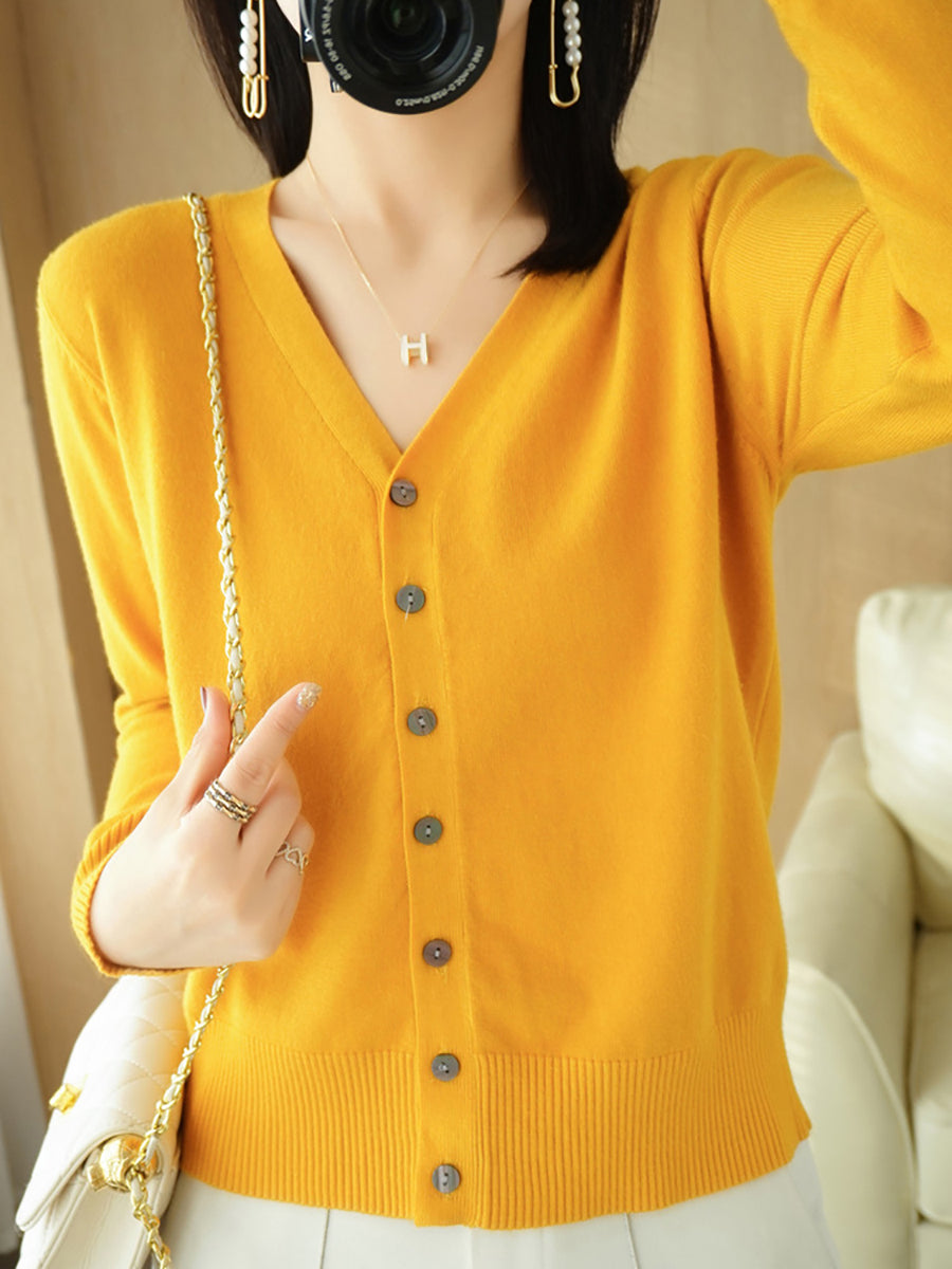 Dámský jarní ležérní čistě barevný svetr s výstřihem do V