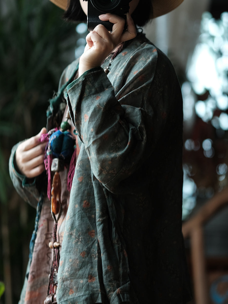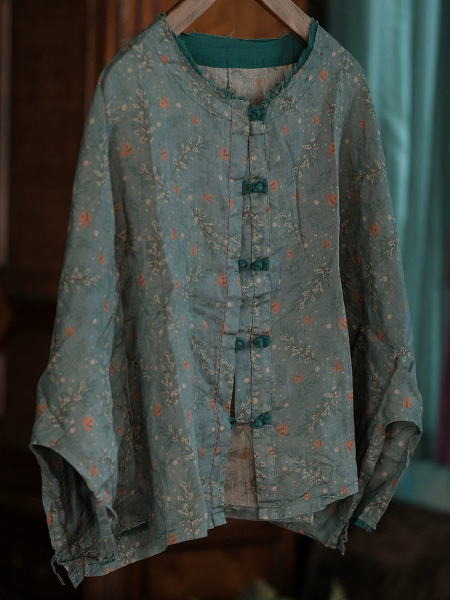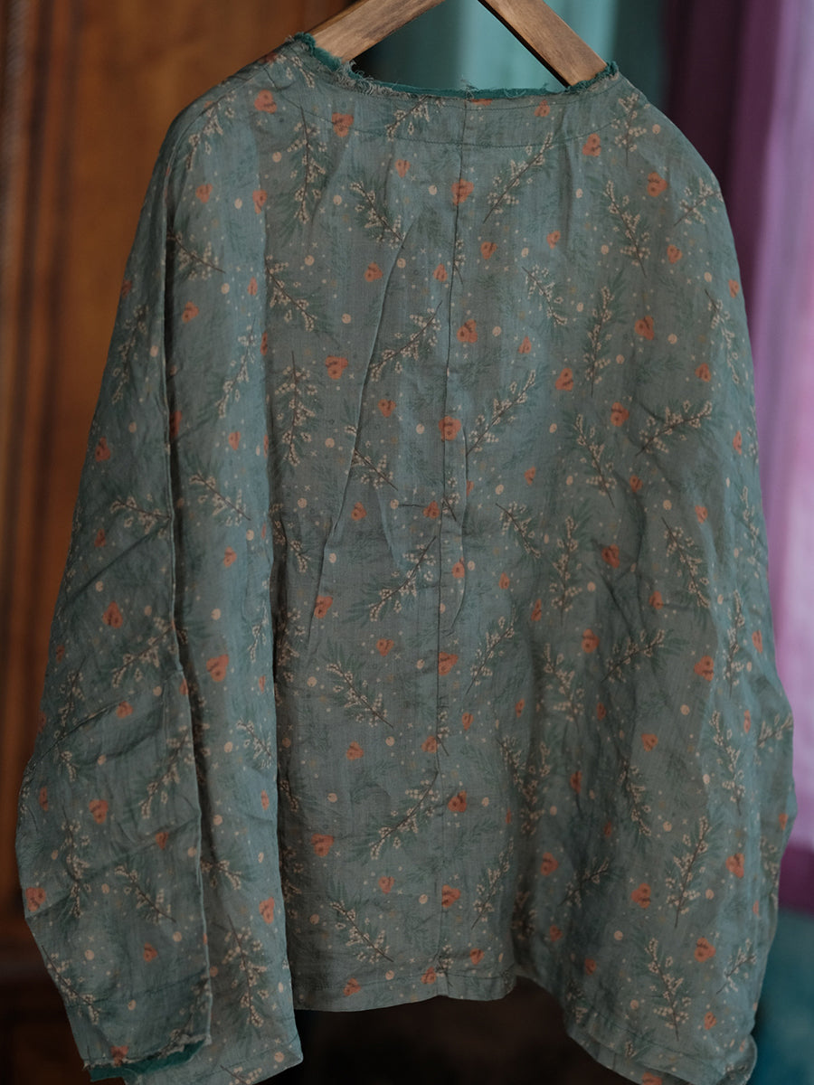 Dámská jarní retro květinová lněná košile s výstřihem do O-neck