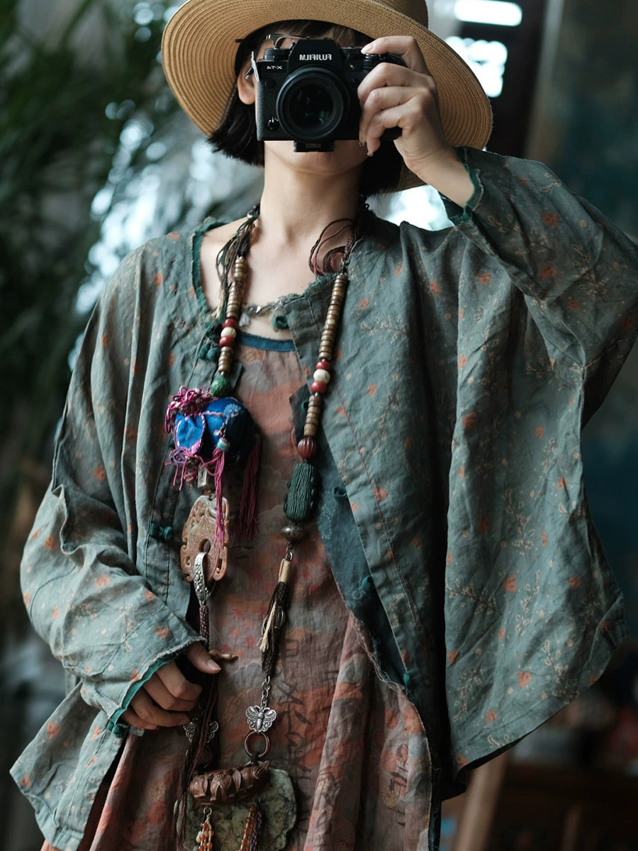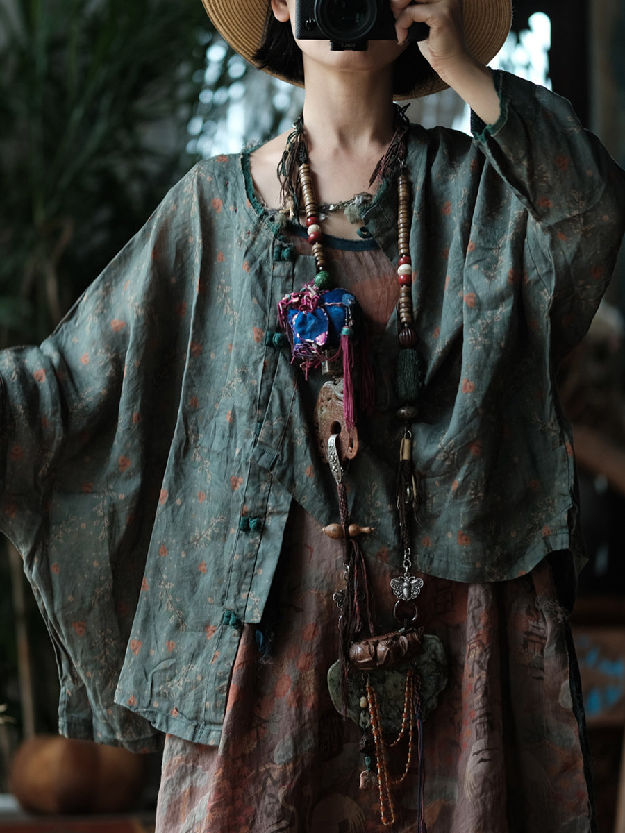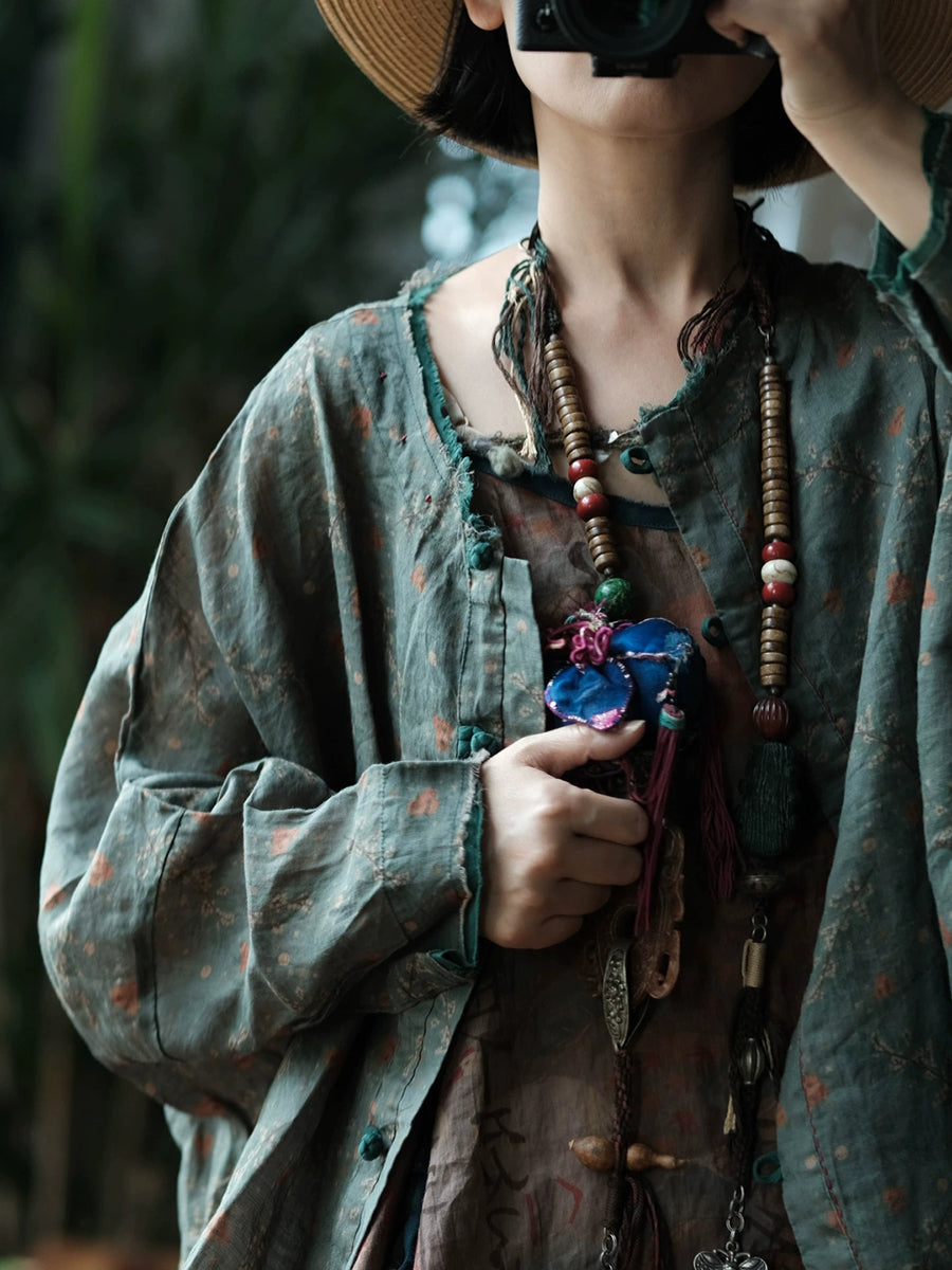Dámská jarní retro květinová lněná košile s výstřihem do O-neck