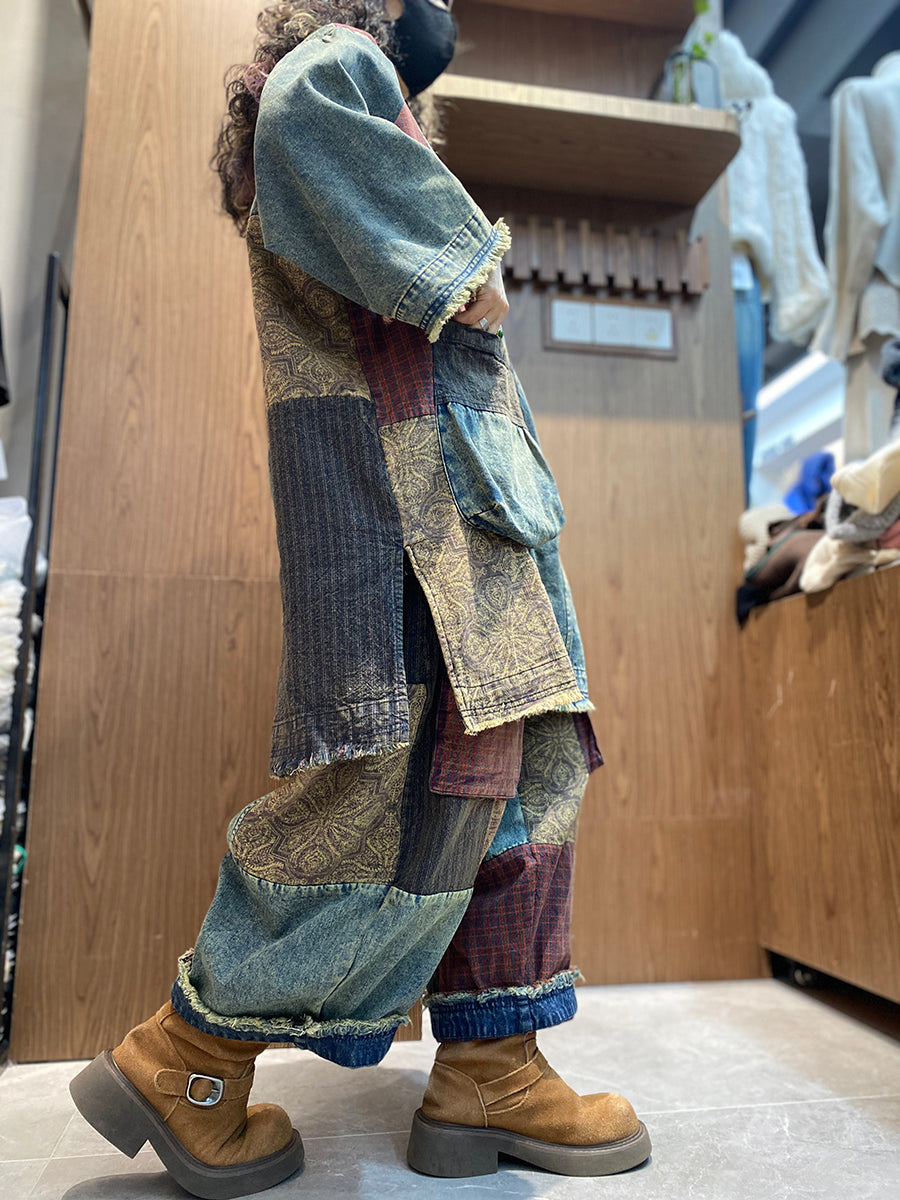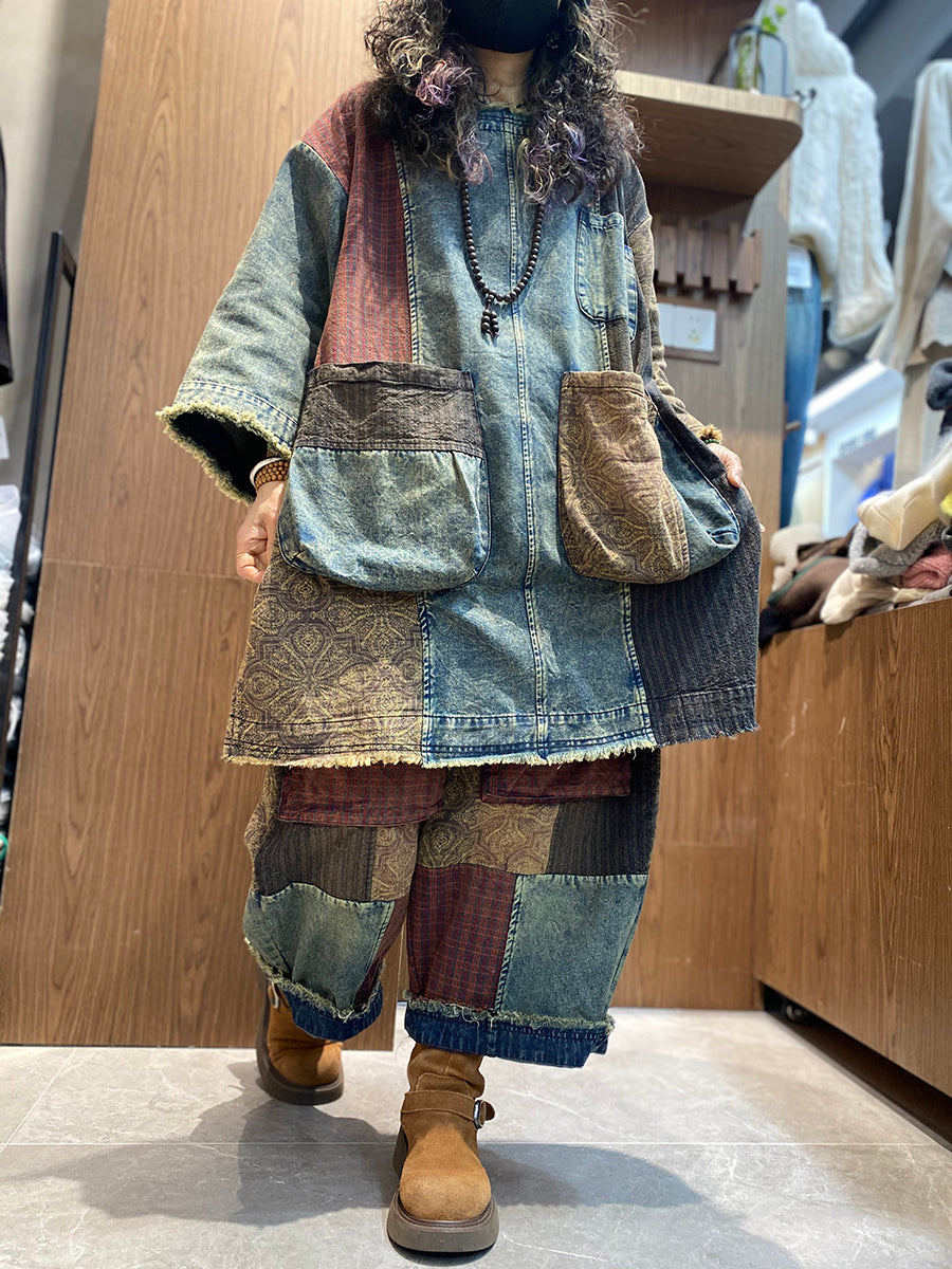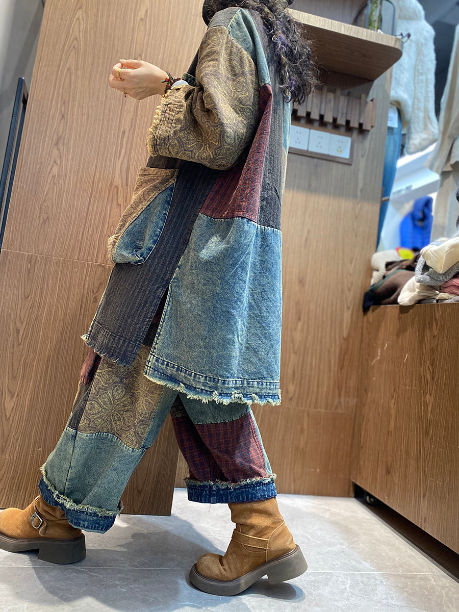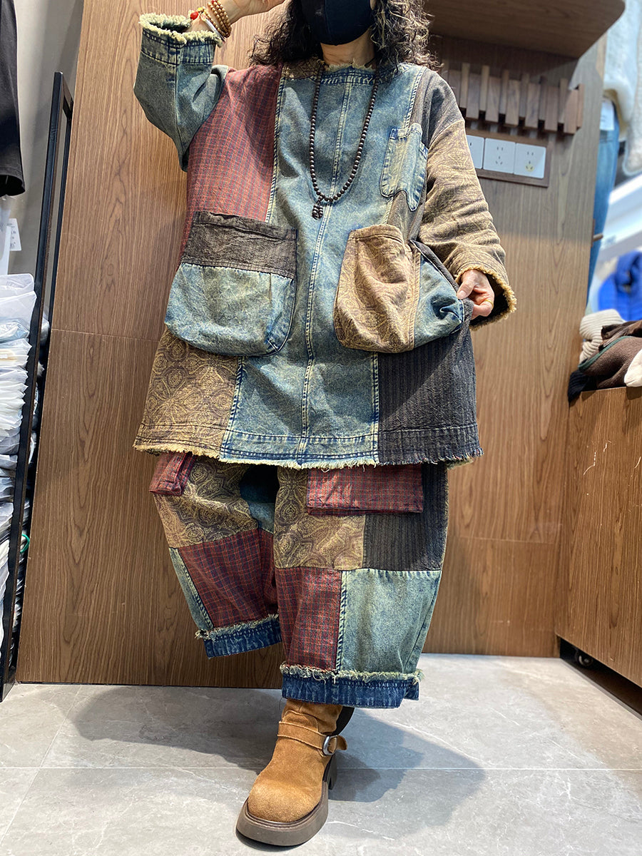Dámské jarní retro patchworkové prošívané obleky s výstřihem do O