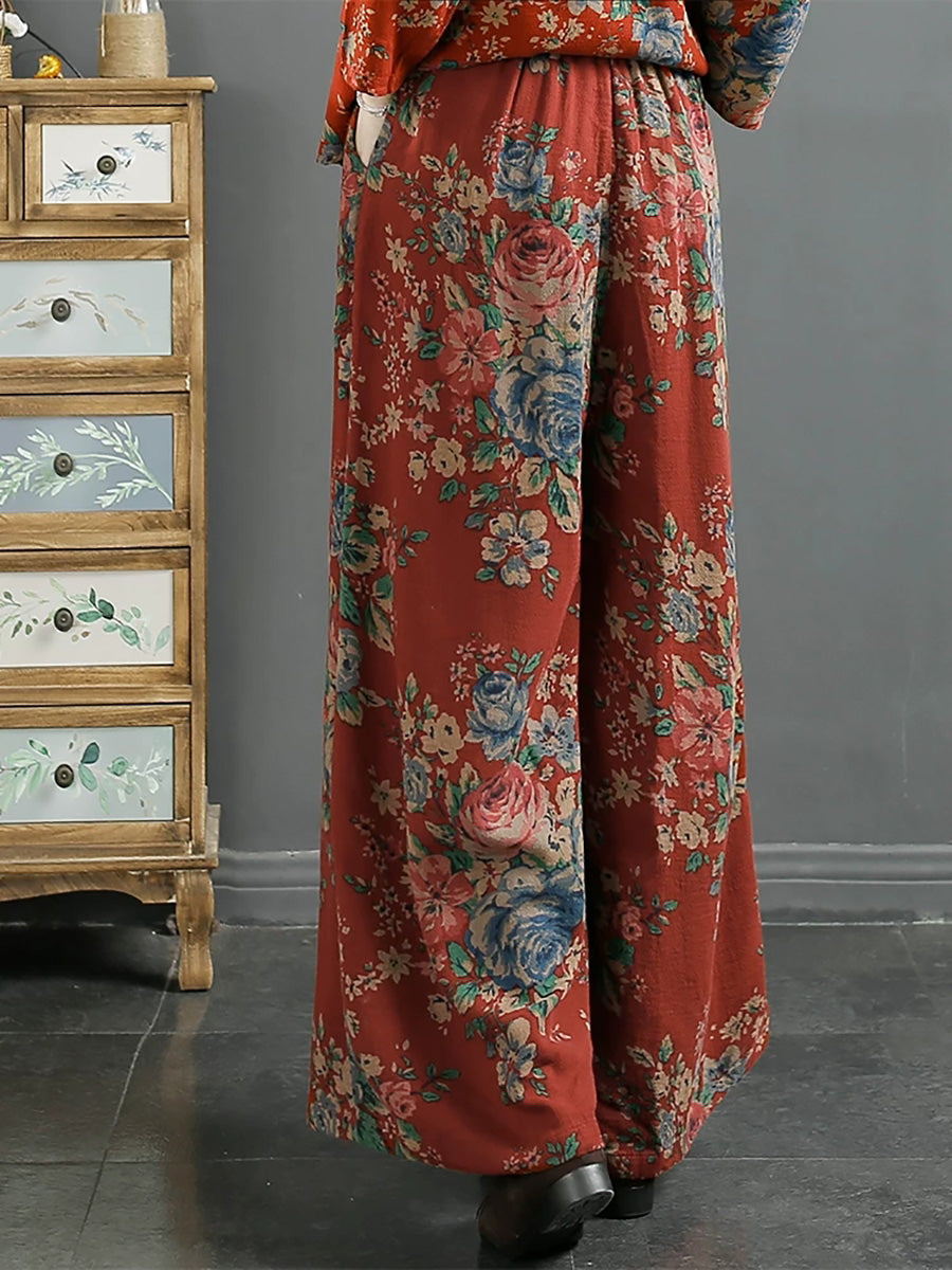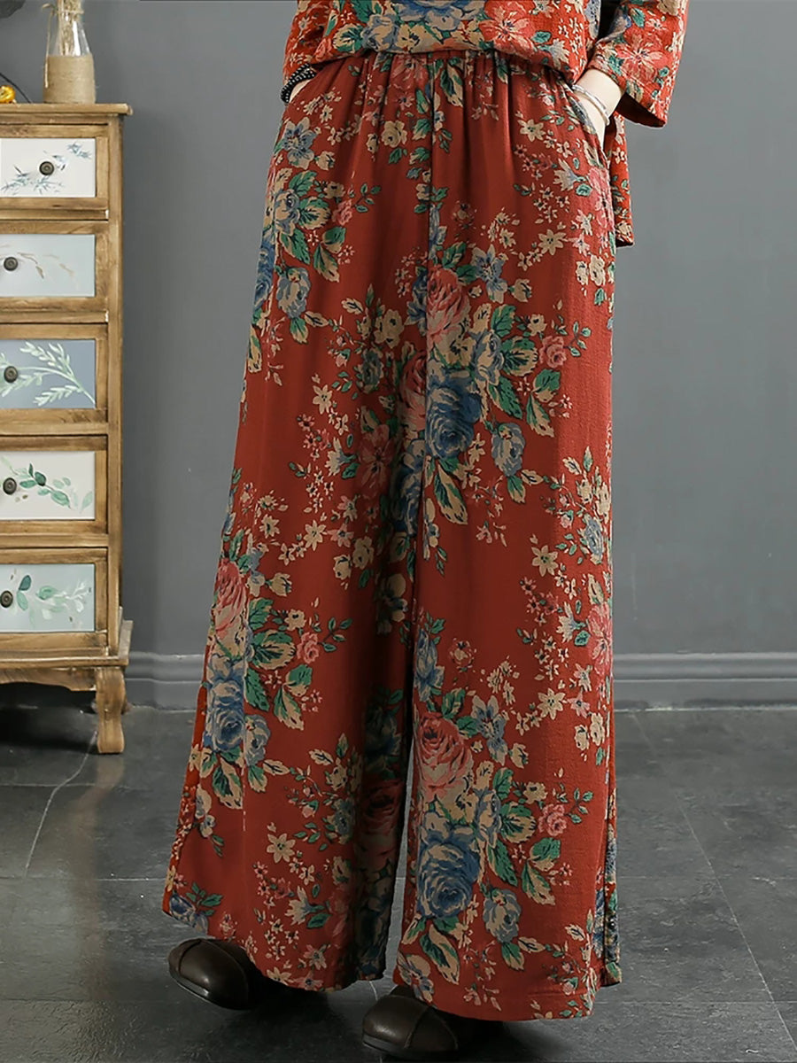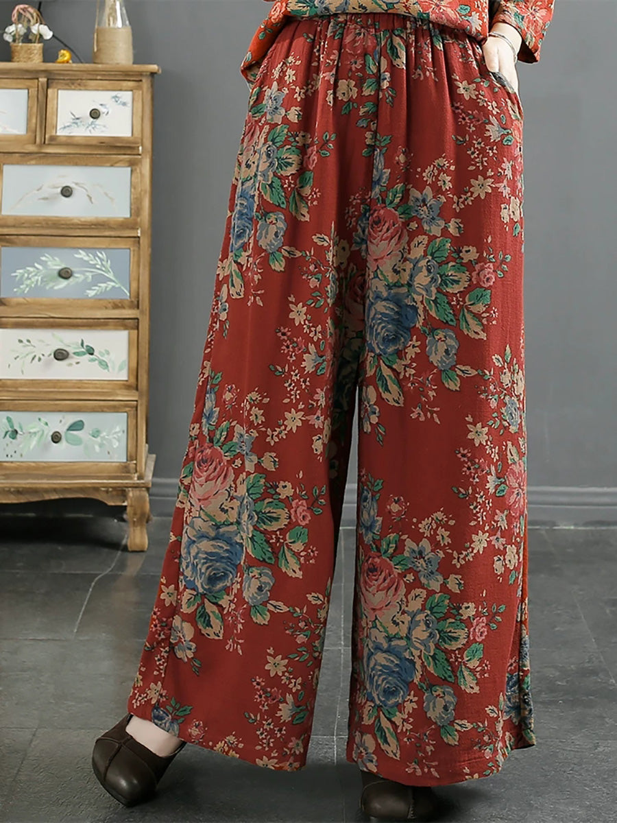 Dámské jarní vintage květinové bavlněné kalhoty se širokými nohavicemi