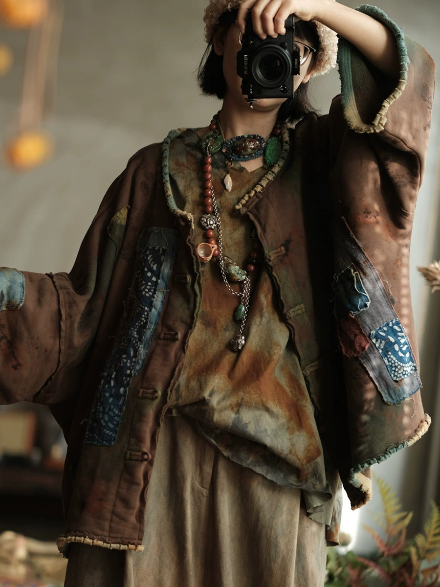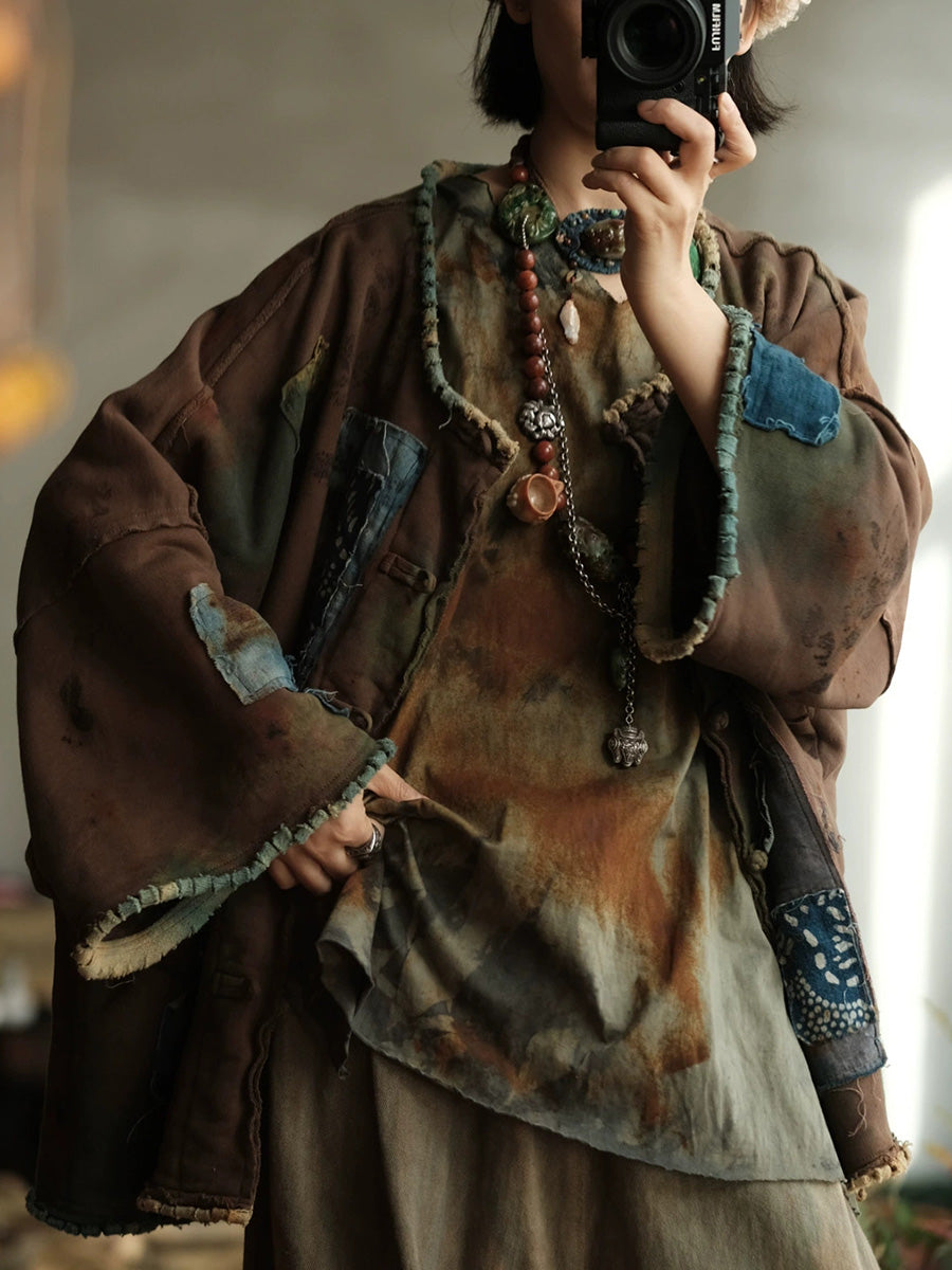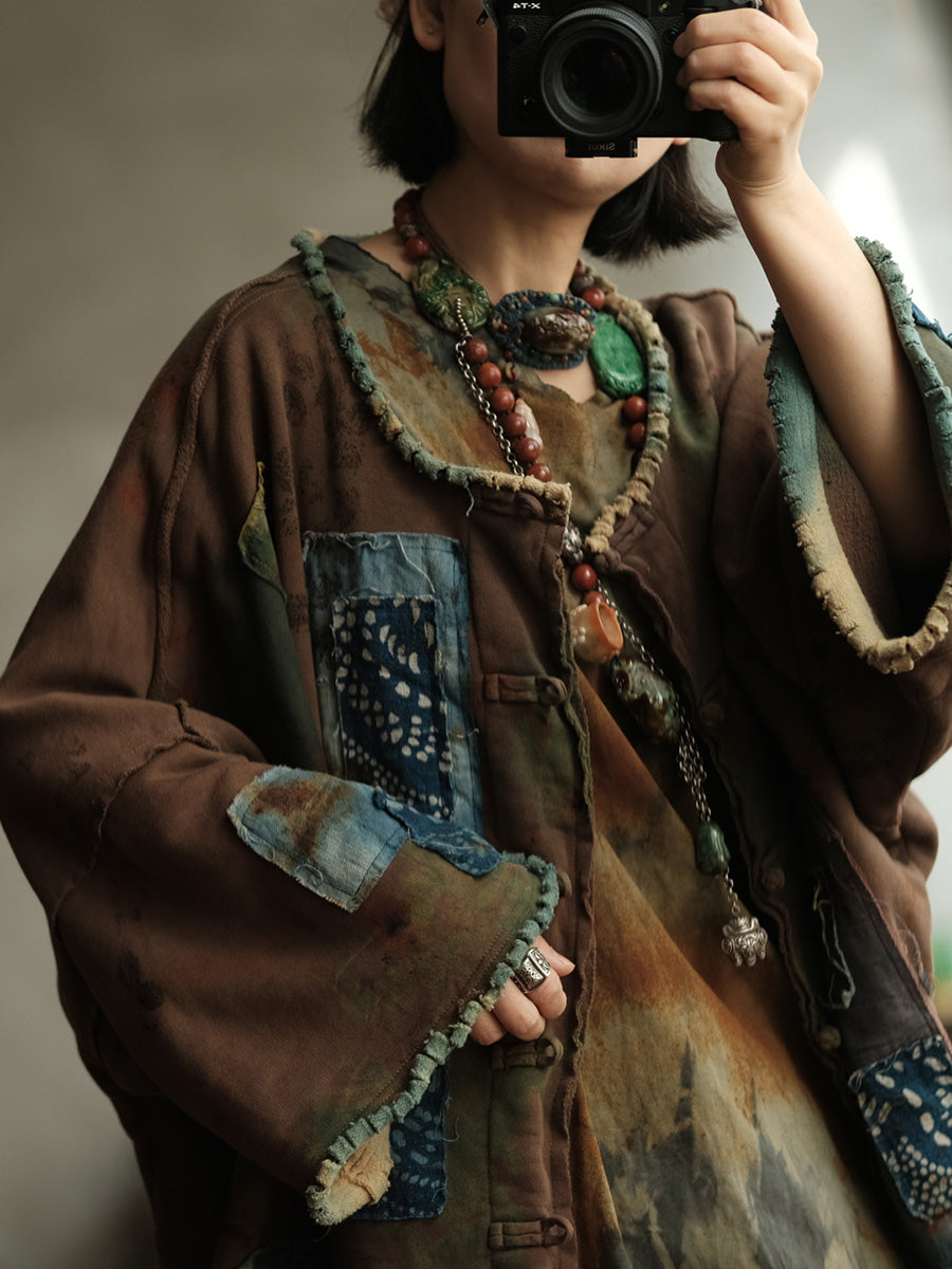 Dámský jarní vintage patchworkový kabát s výstřihem do O-neck