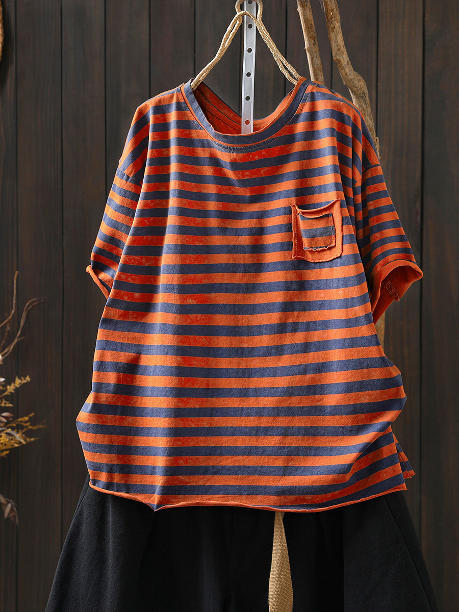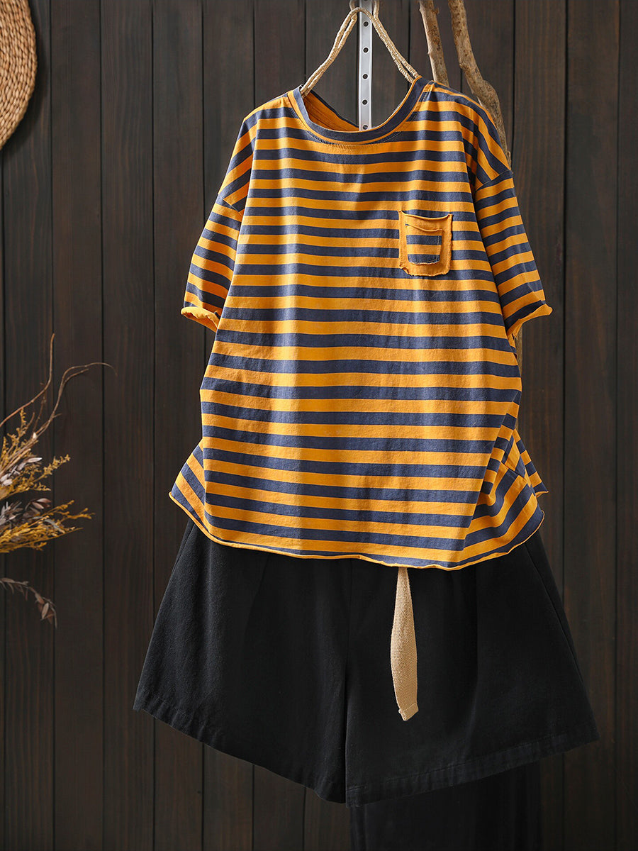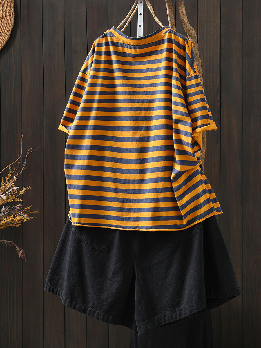 Dámské letní umělecké bavlněné pruhované tričko s výstřihem do O-neck