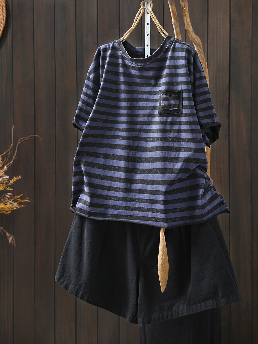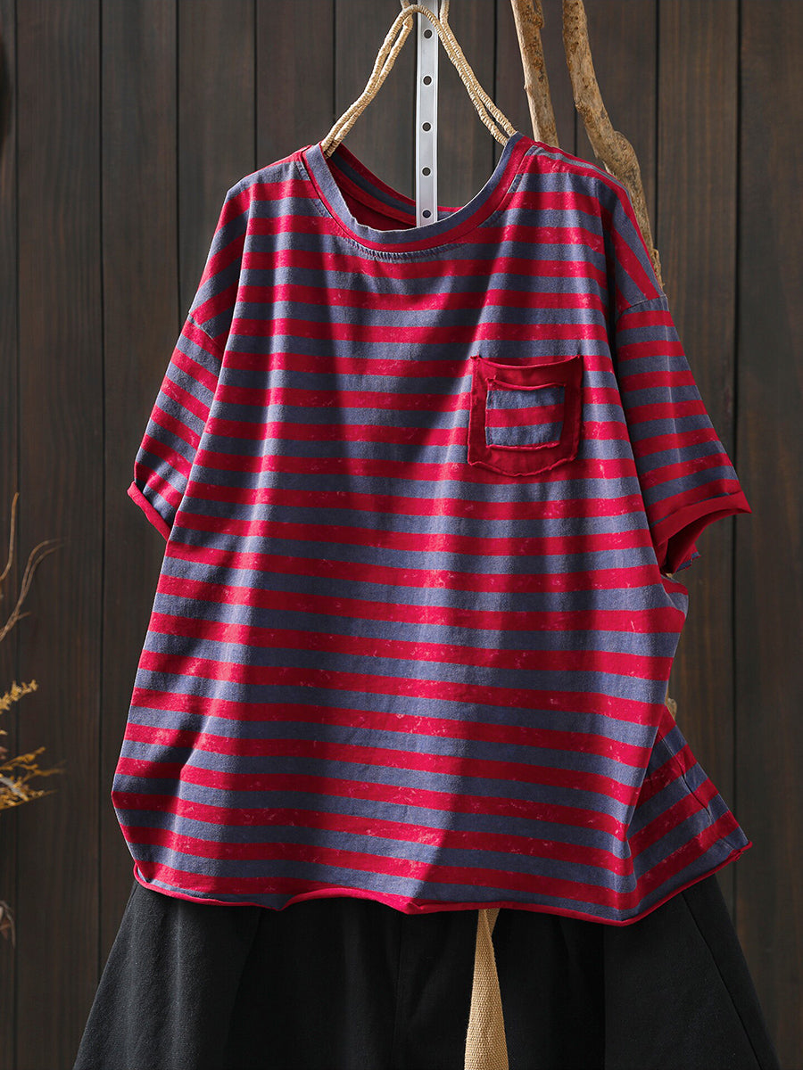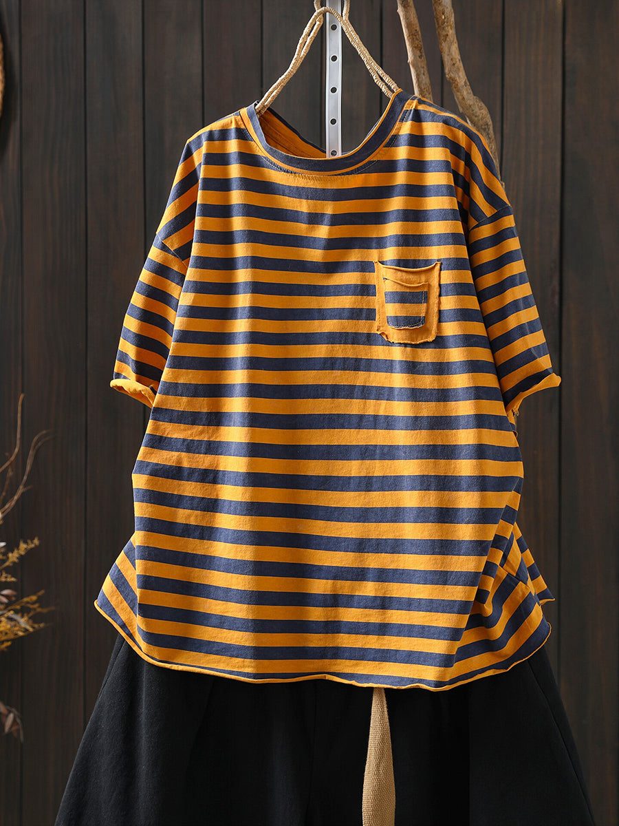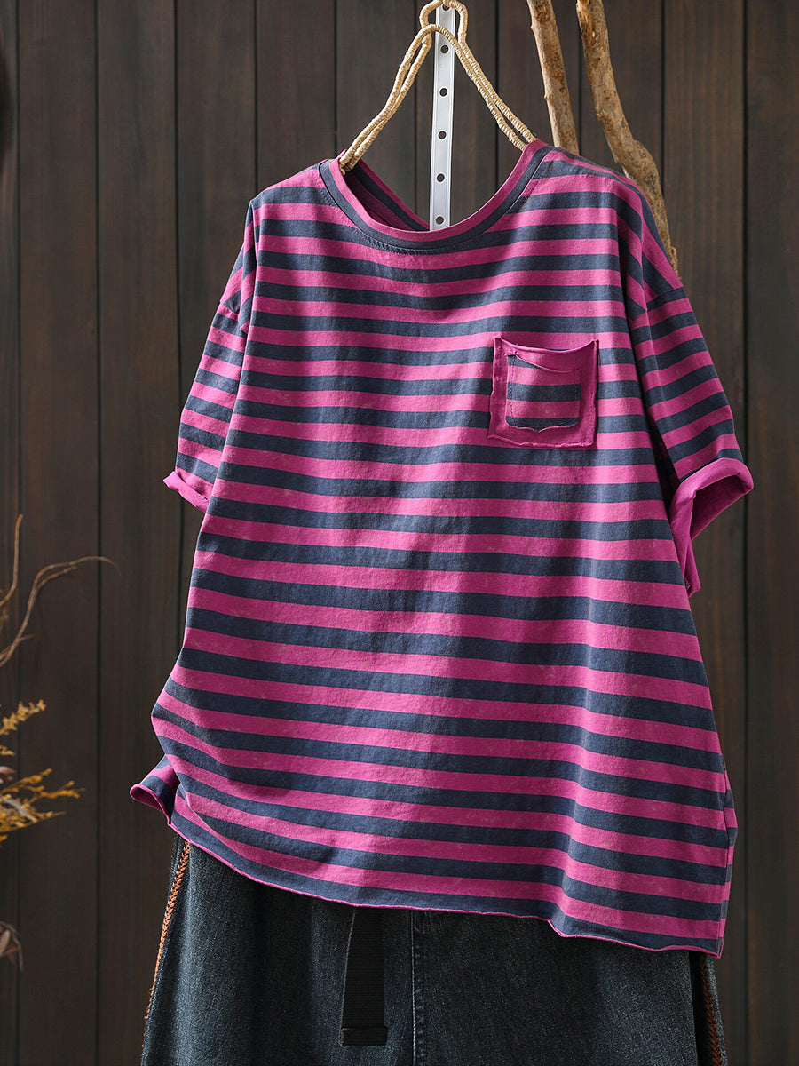Dámské letní umělecké bavlněné pruhované tričko s výstřihem do O-neck