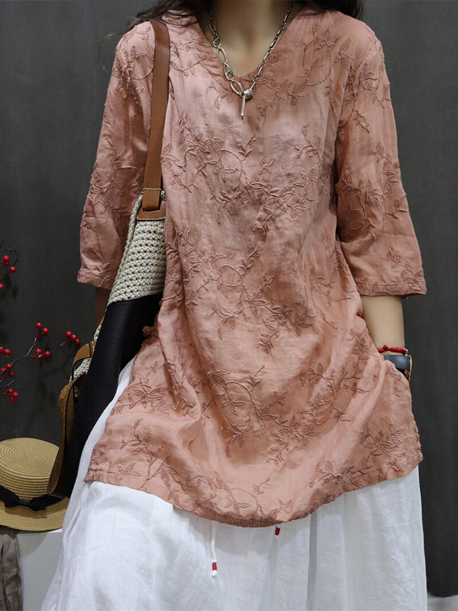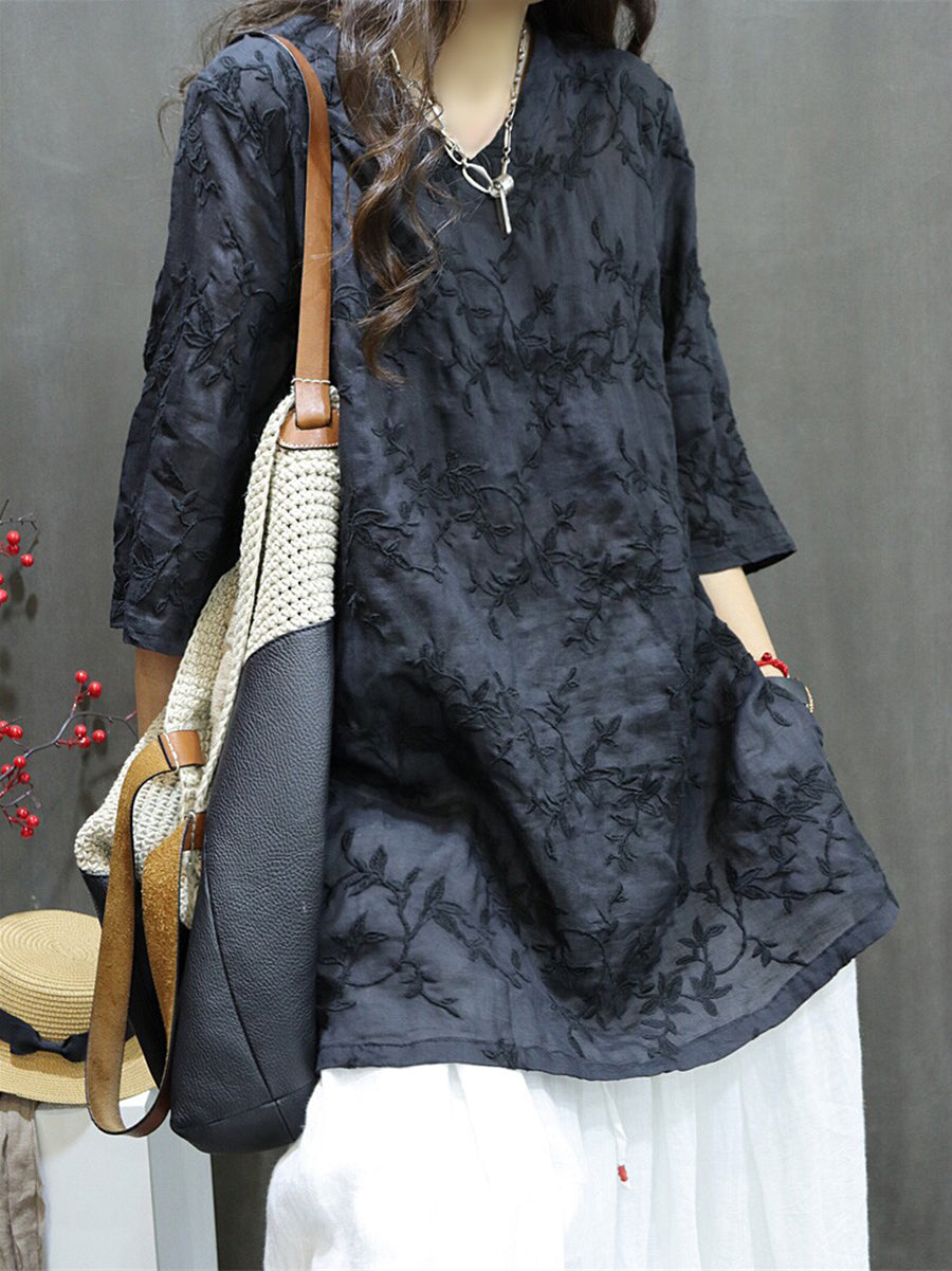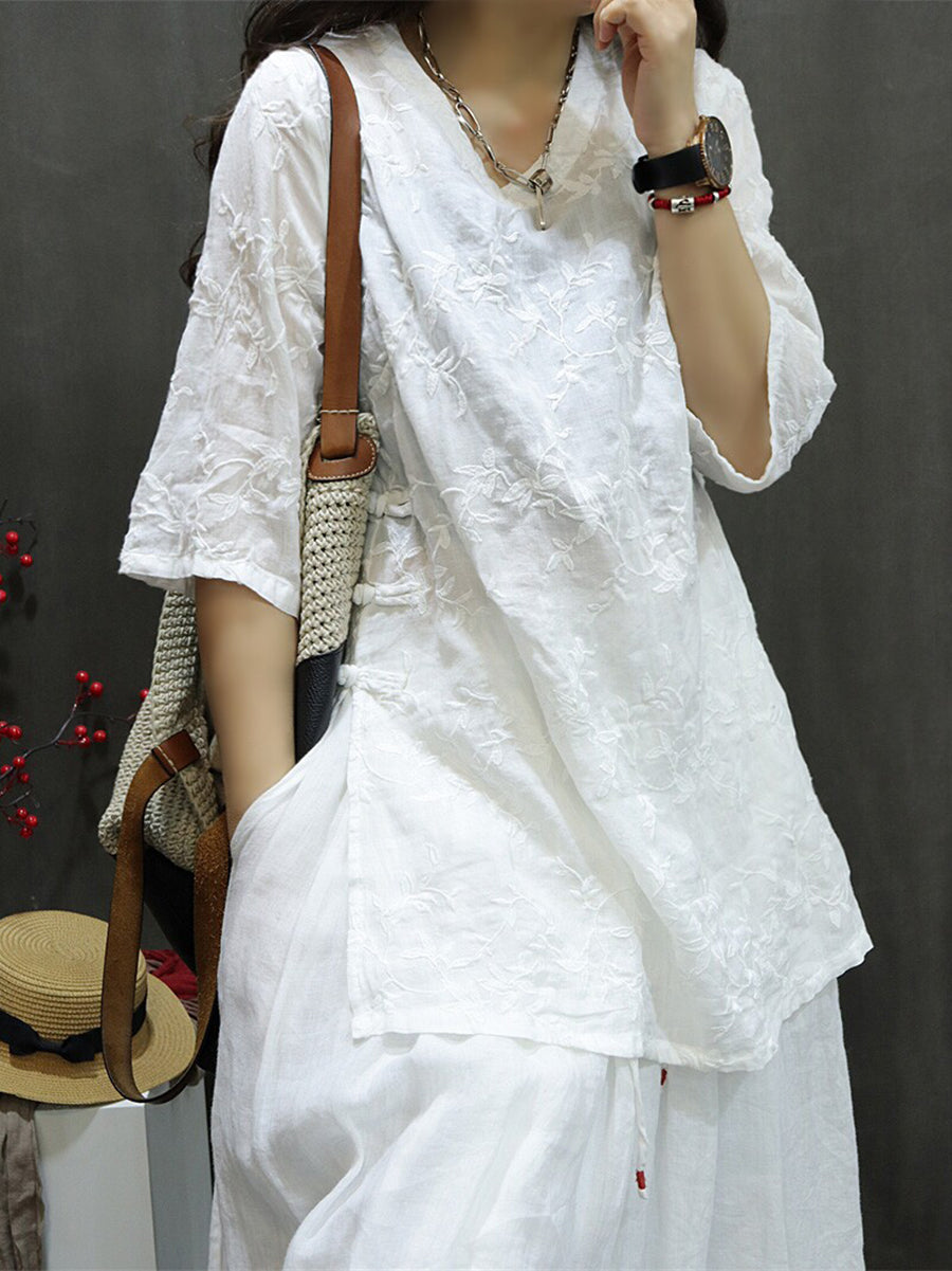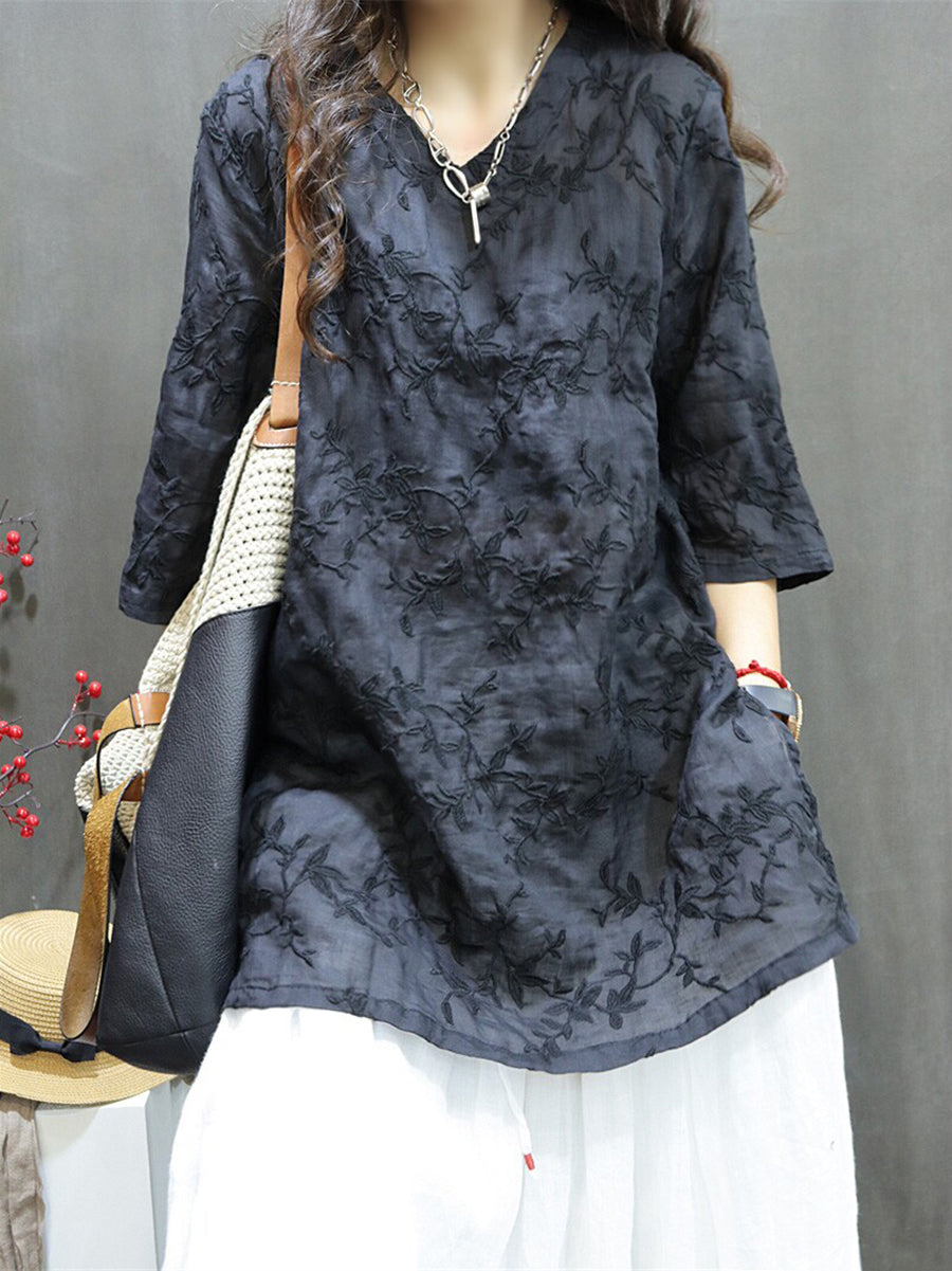 Dámská letní umělecká výšivka, 100% ramie, halenka s výstřihem do V