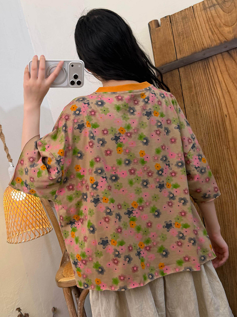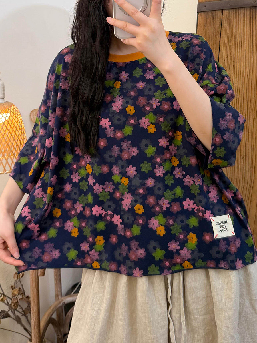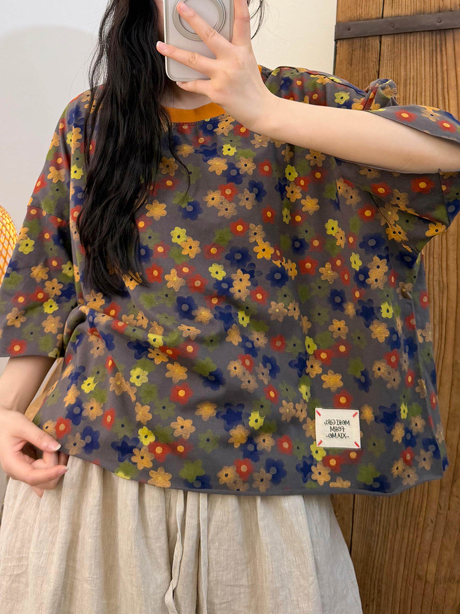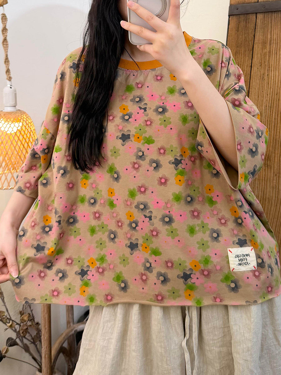 Dámské letní umělecké květinové tričko s výstřihem do O-neck