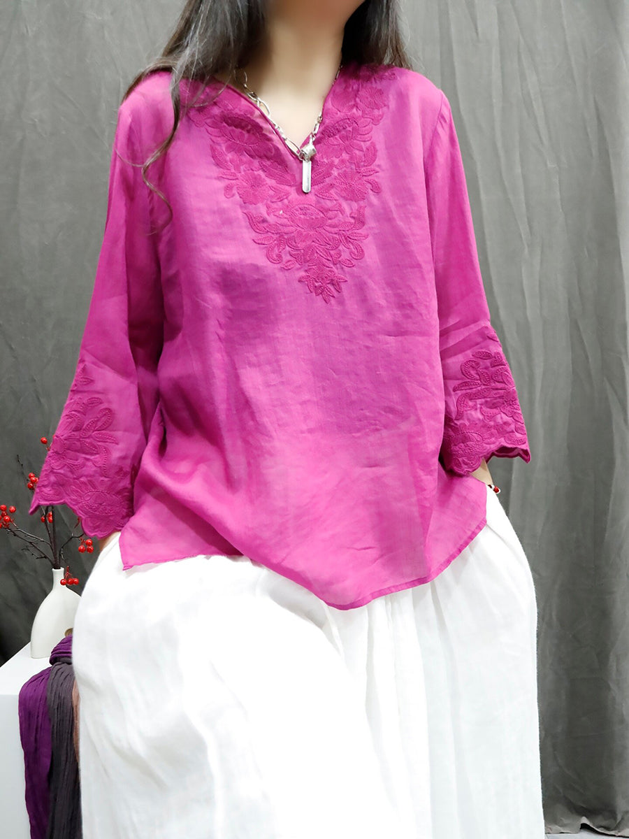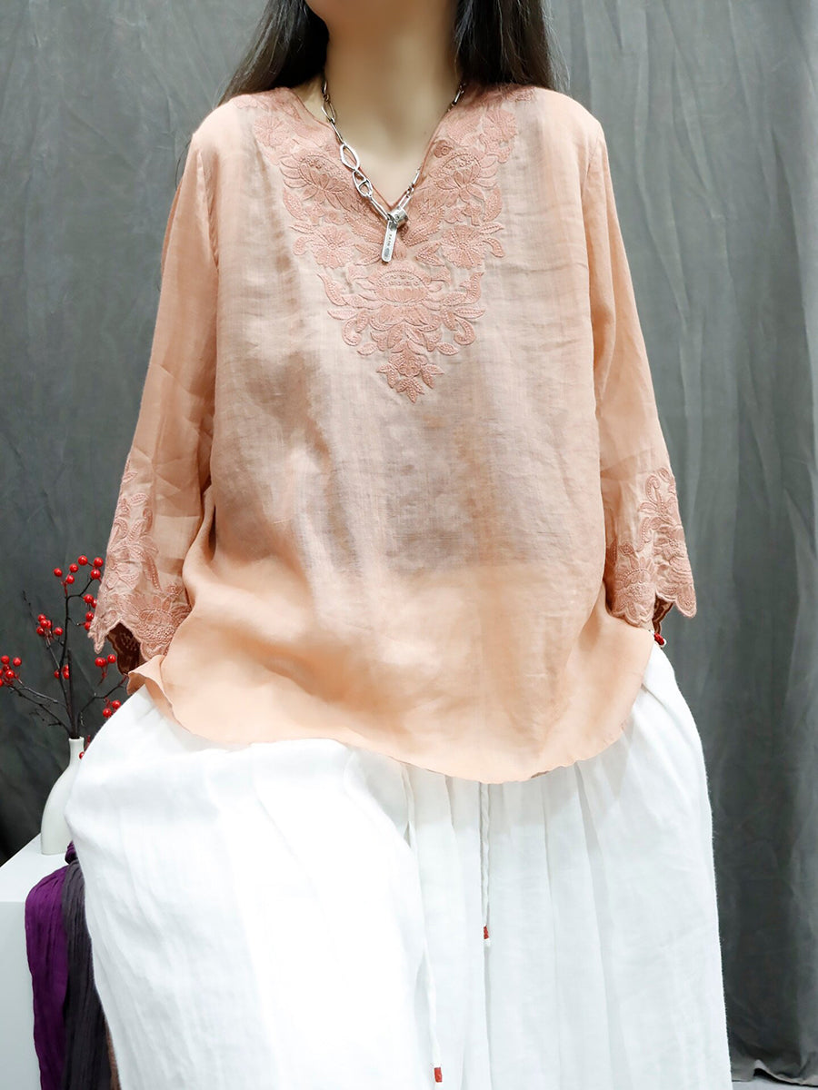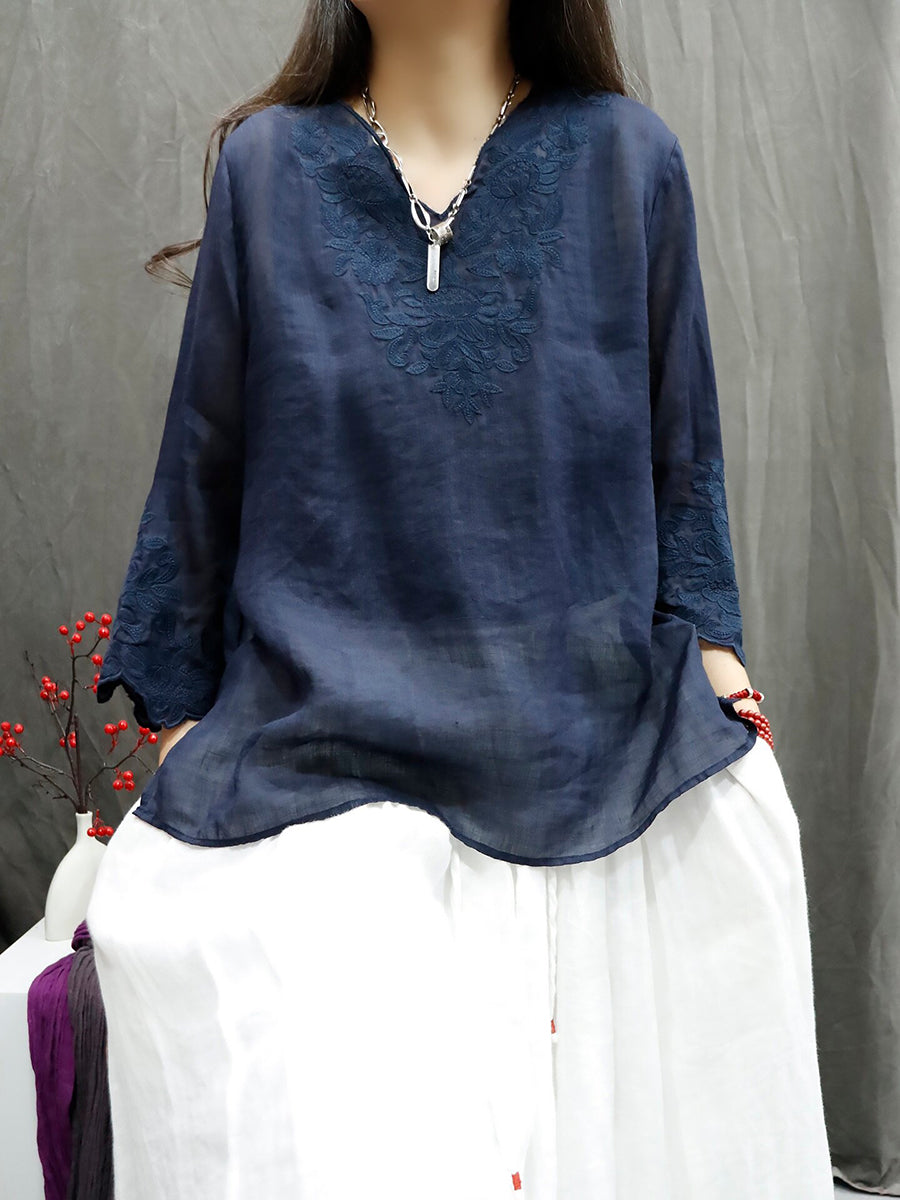 Dámské letní umělecké tričko s výstřihem do V, 100% ramie, čistou barvou a výšivkou