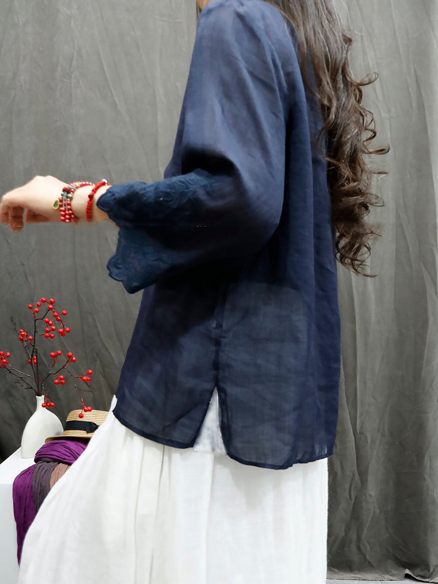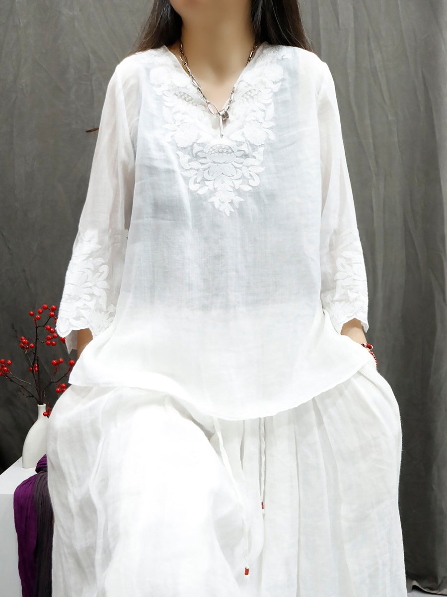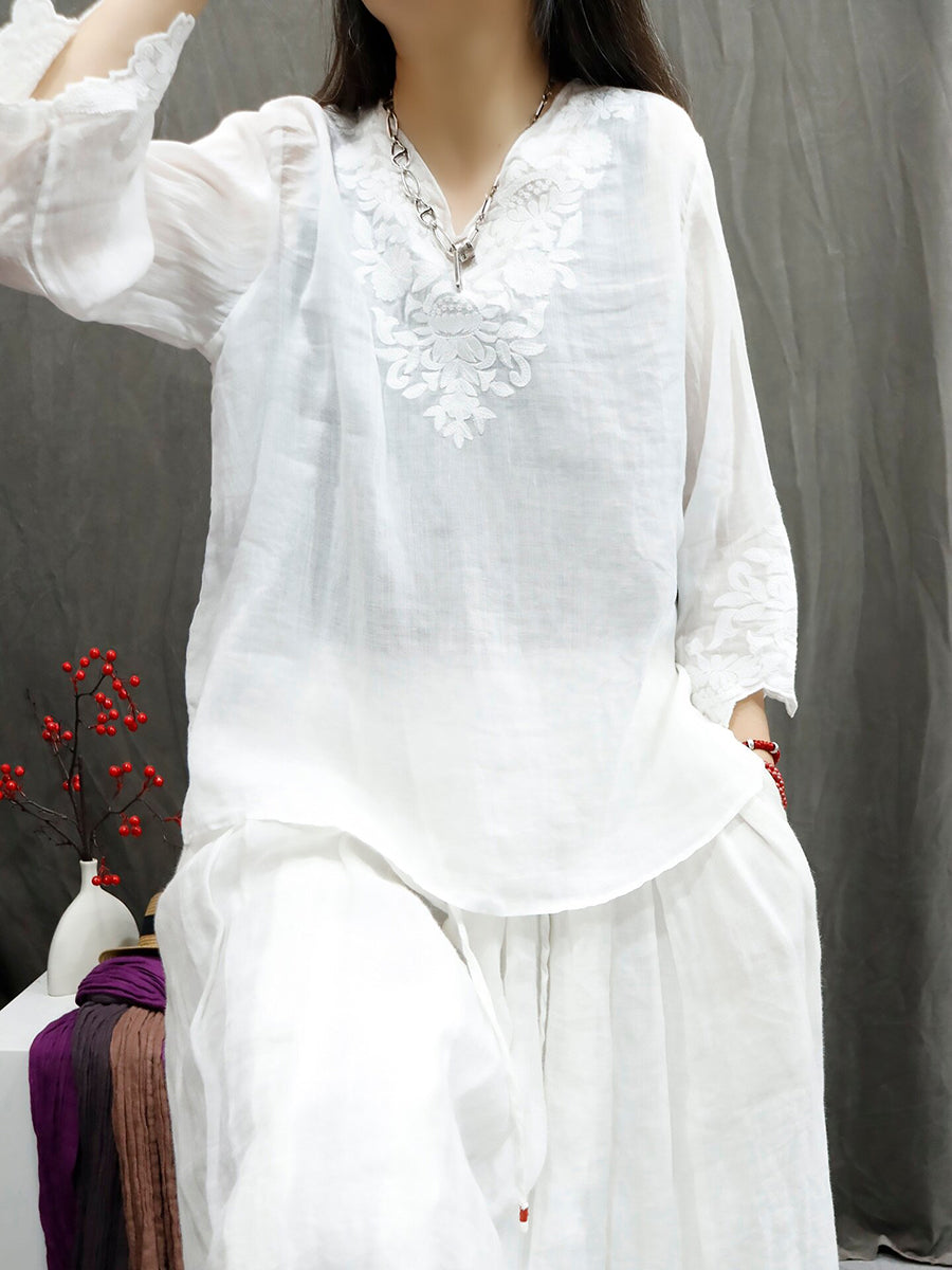 Dámské letní umělecké tričko s výstřihem do V, 100% ramie, čistou barvou a výšivkou