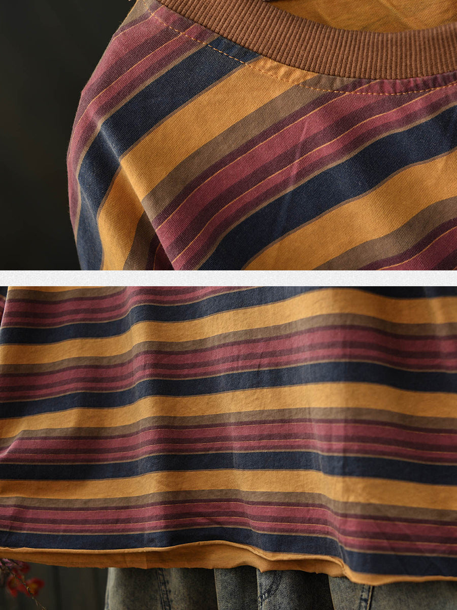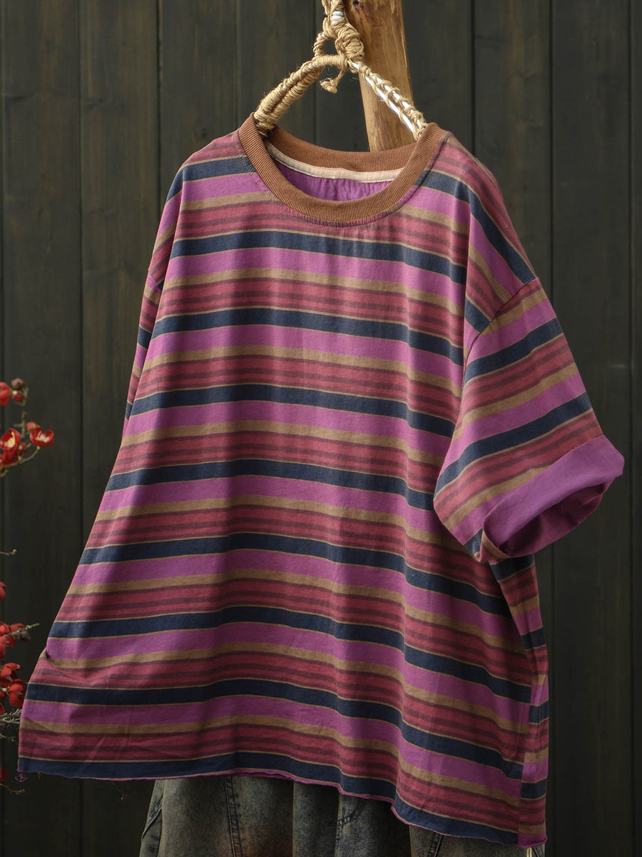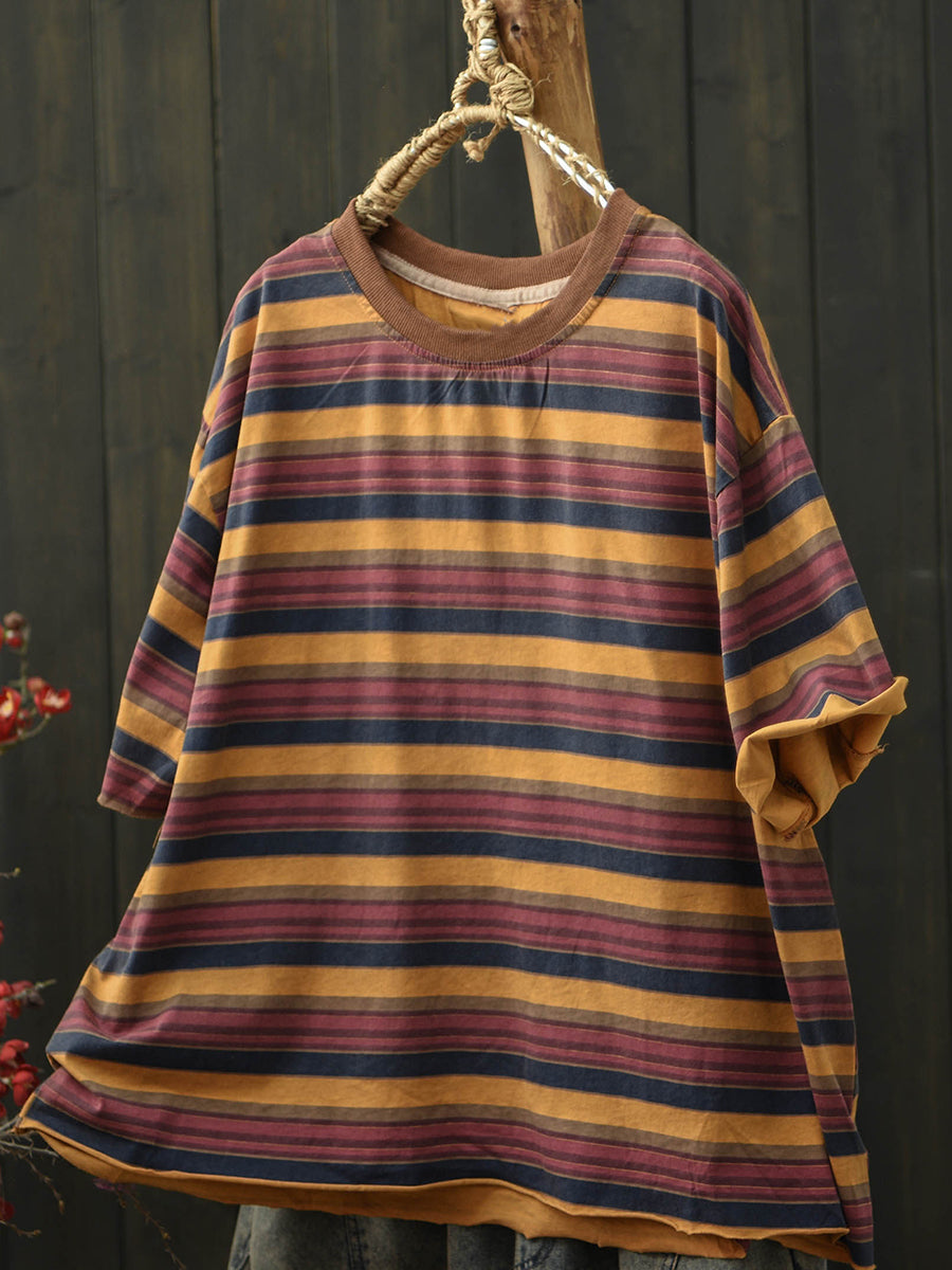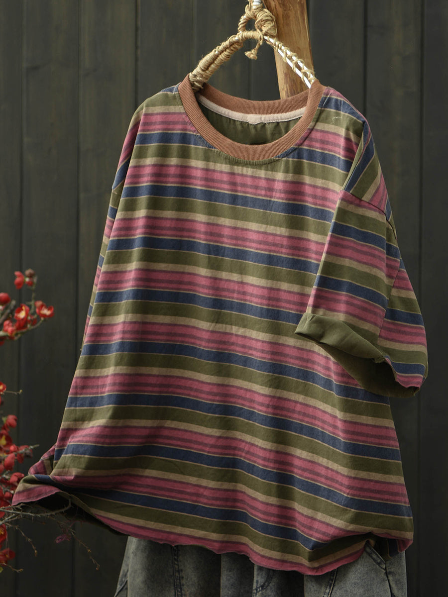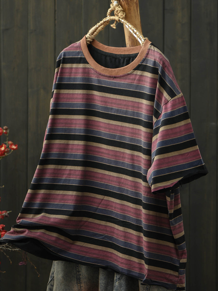 Dámské letní ležérní bavlněné tričko s pruhy a výstřihem do O-neck