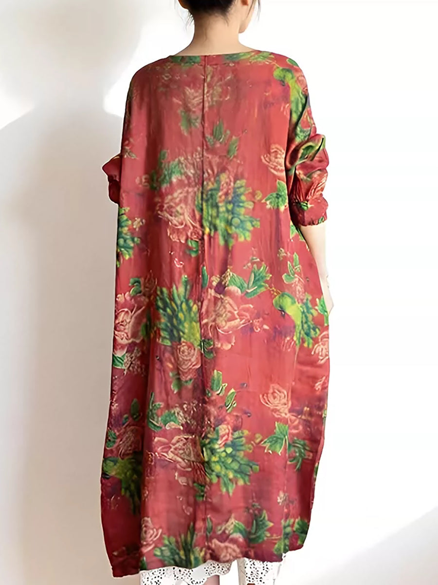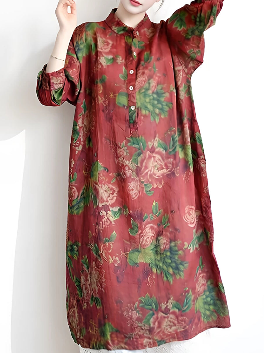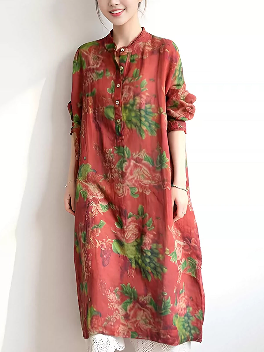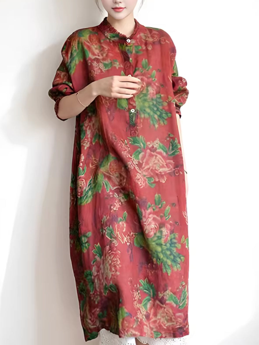 Tyto šaty jsou vyrobeny ze 100% ramie a mají stojáček a květinový vzor. Mají klasické rukávy po celé délce a sahají až ke kotníkům, takže jsou ideální na podzim i na jaro.