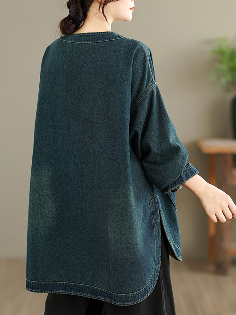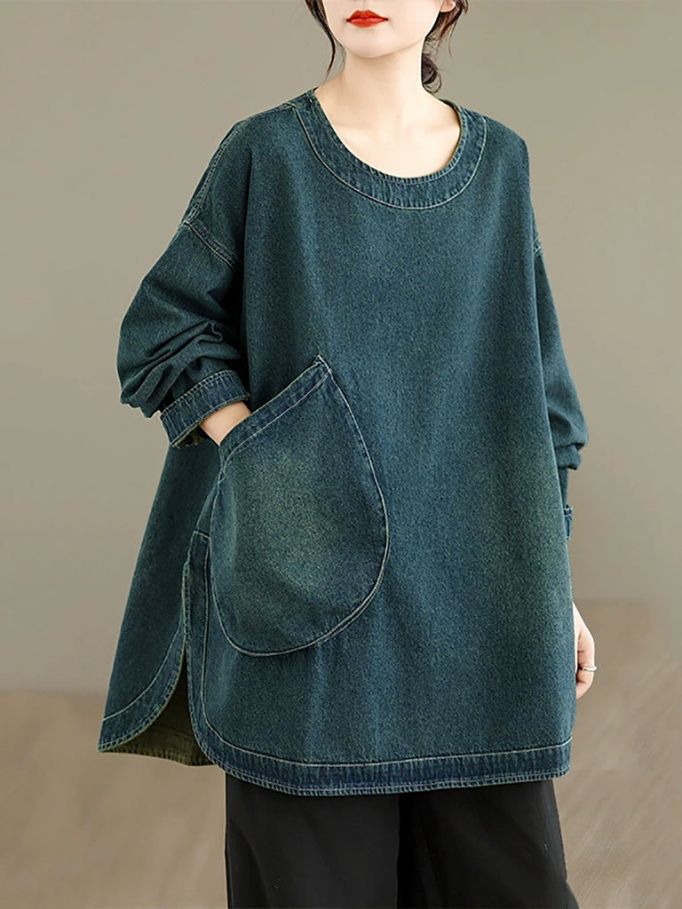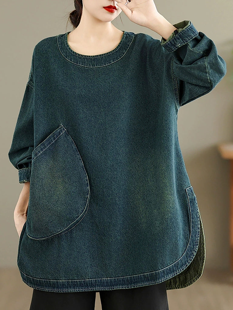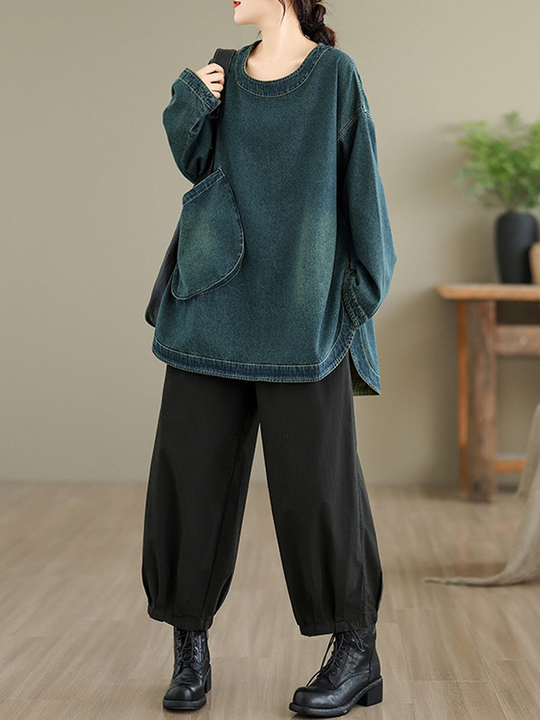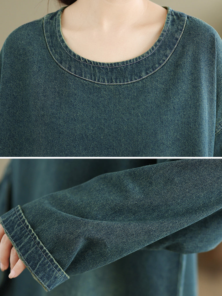 Dámské vintage podzimní čisté barvy džínové tričko s výstřihem do O-neck