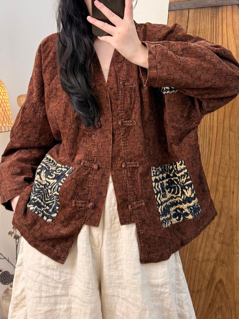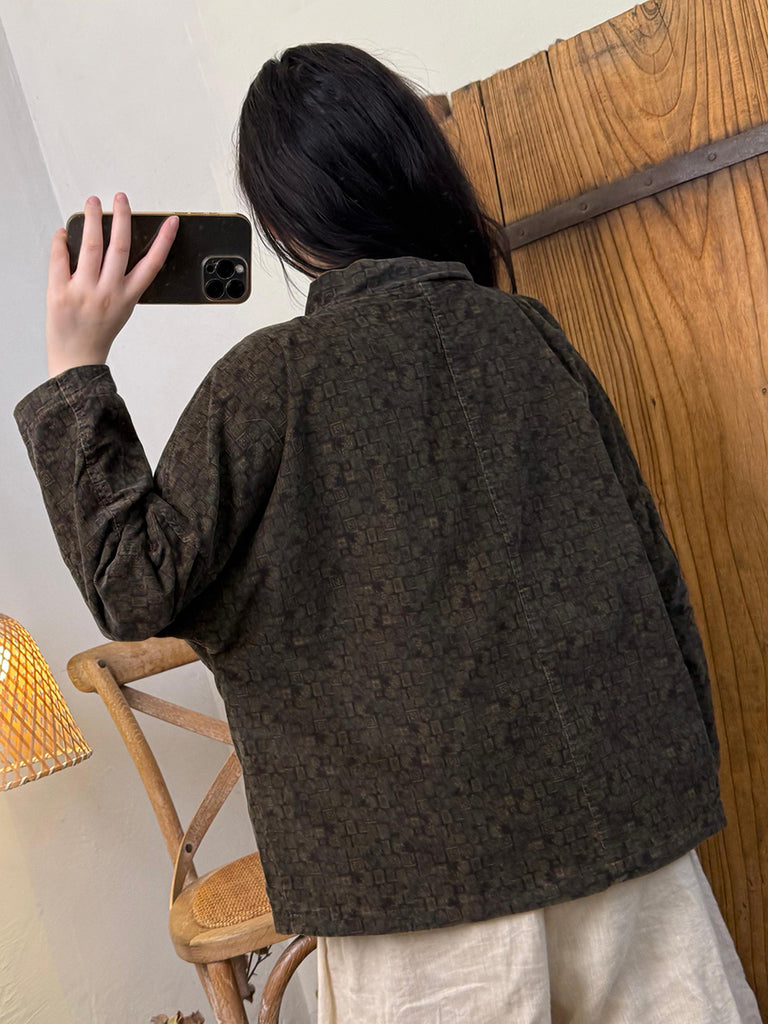 Dámská vintage podzimní čistě barevná bavlněná bunda s výstřihem do V