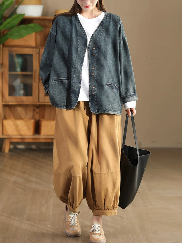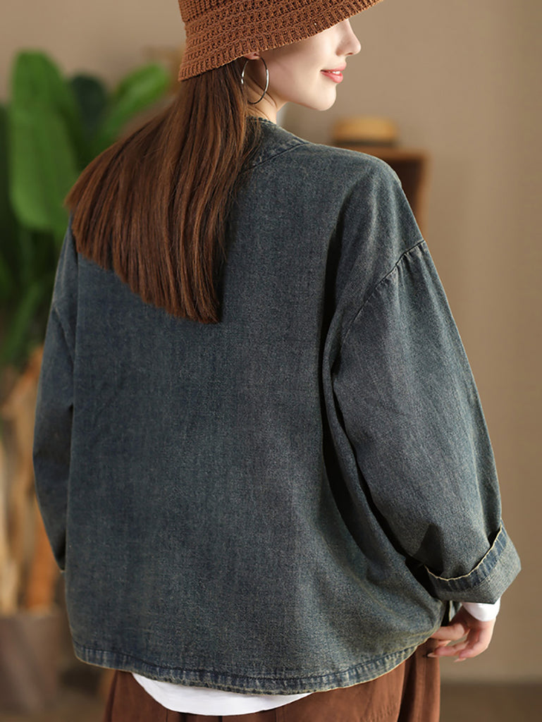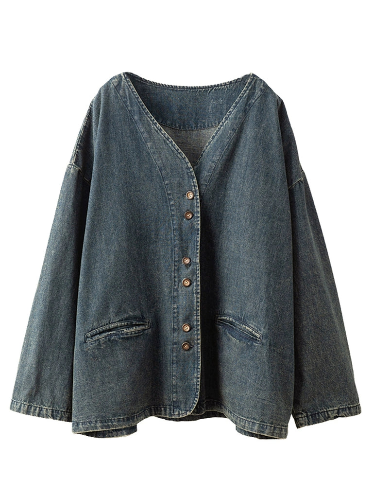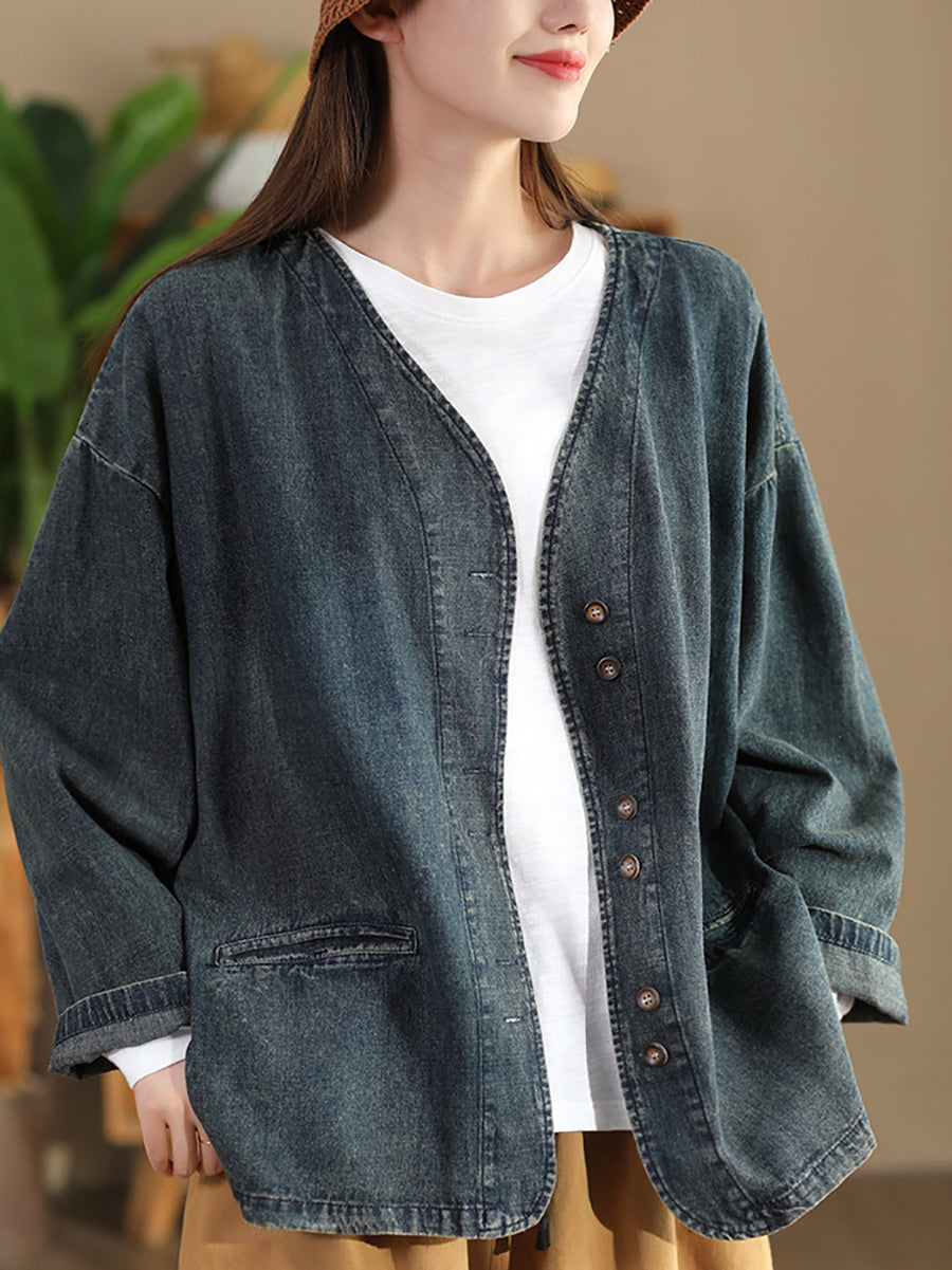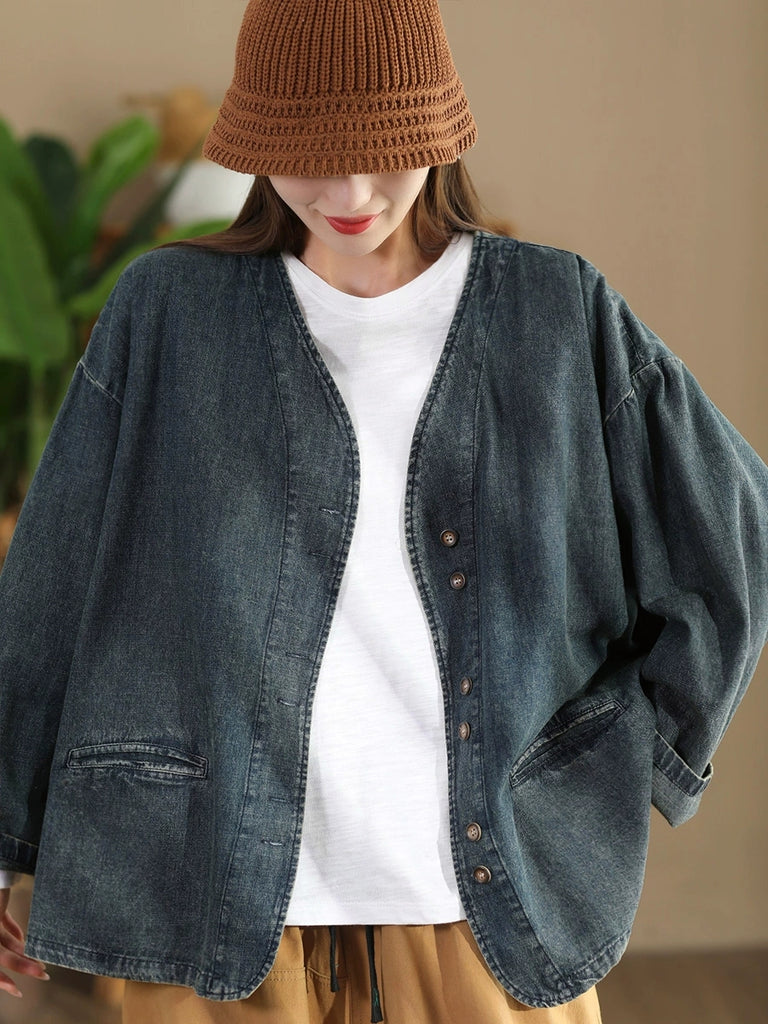 Dámská vintage podzimní čistě barevná džínová bunda s výstřihem do V