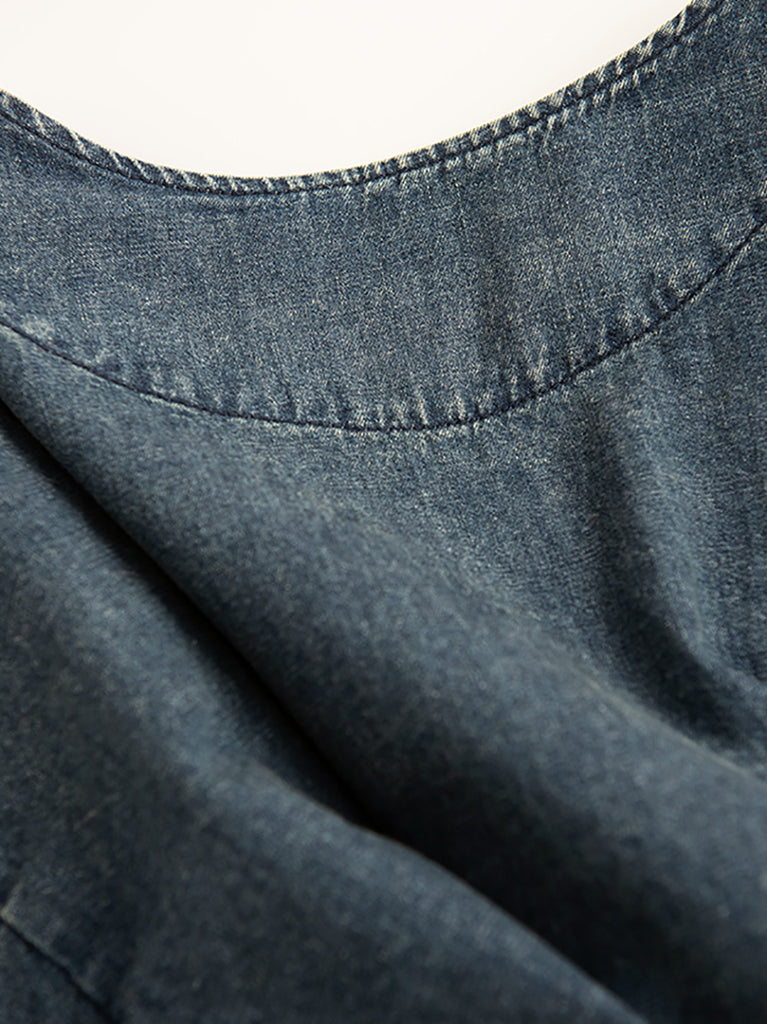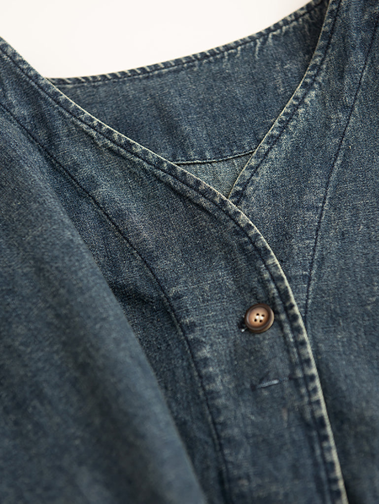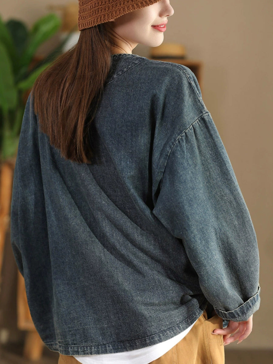 Tento dámský košilový kabát ve vintage stylu je vyroben z denimu a má klasický odklápěcí límec a plné raglánové rukávy. Je navržen v jednobarevném provedení, perfektně se hodí do přechodných ročních období jara a podzimu a kombinuje retro styl s praktickým pohodlím.