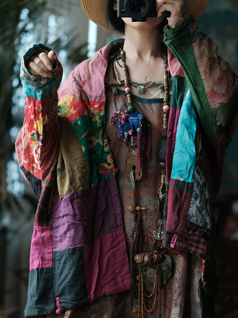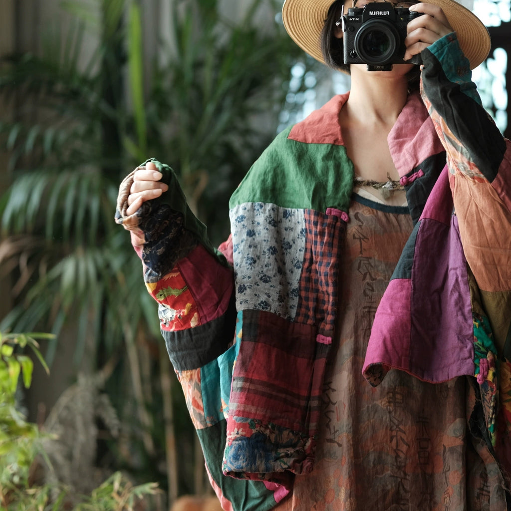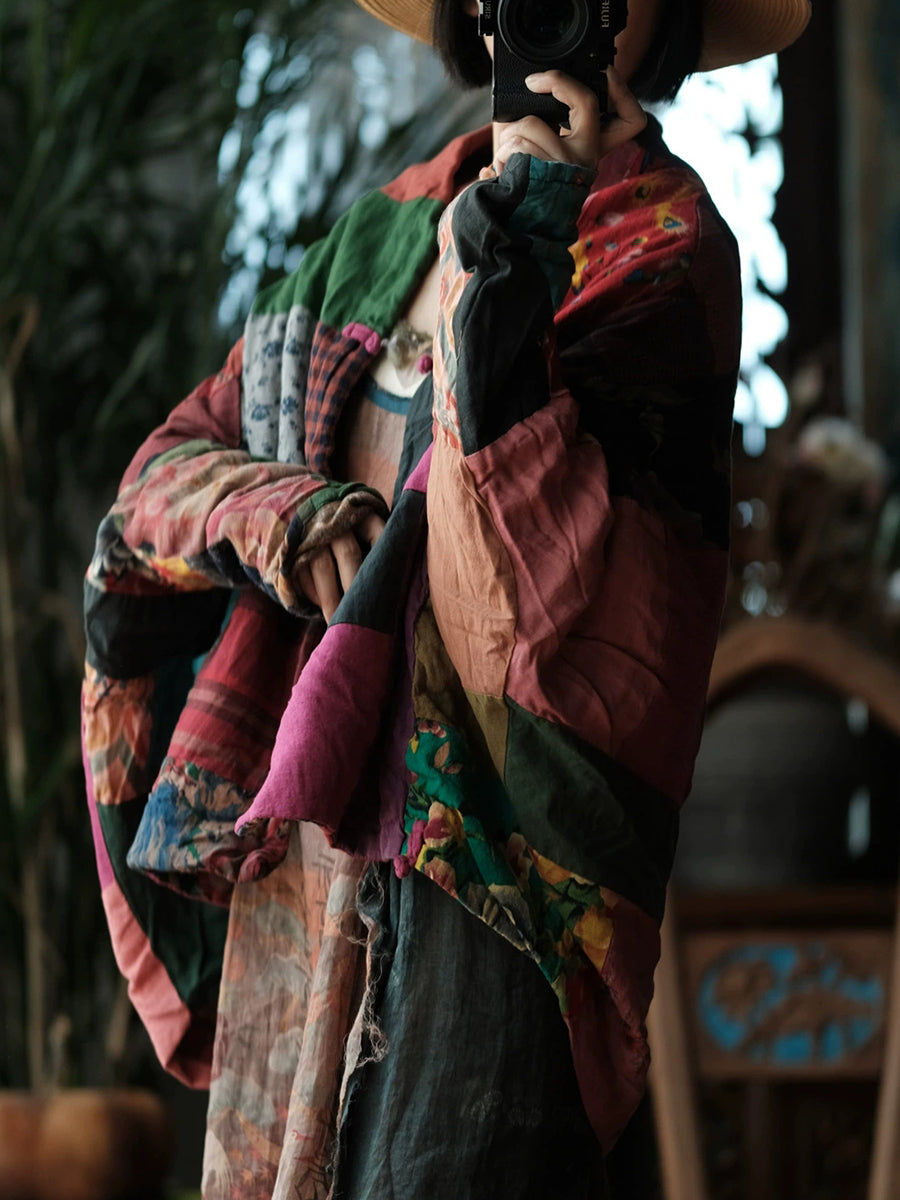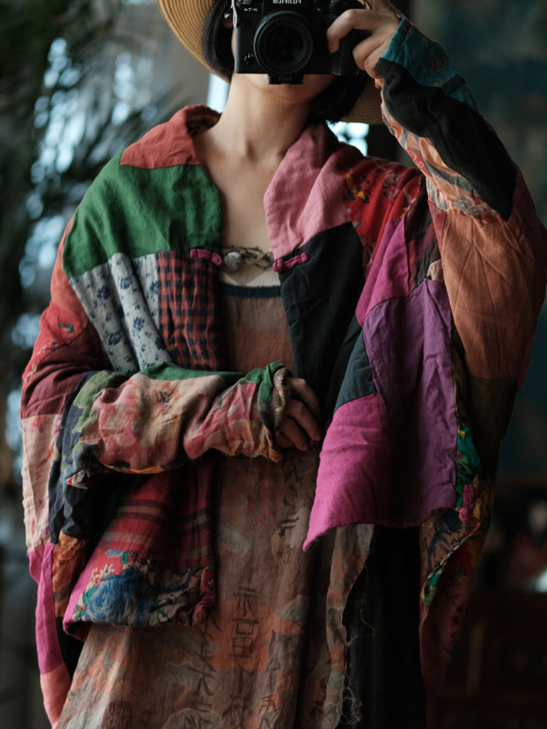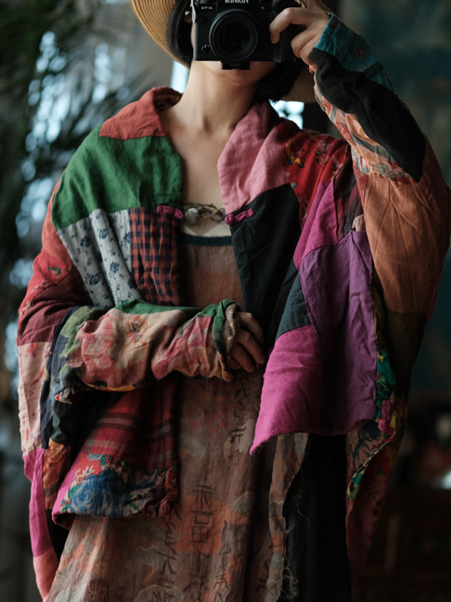 Dámský vintage patchworkový bavlněný prošívaný kabát s netopýřími rukávy