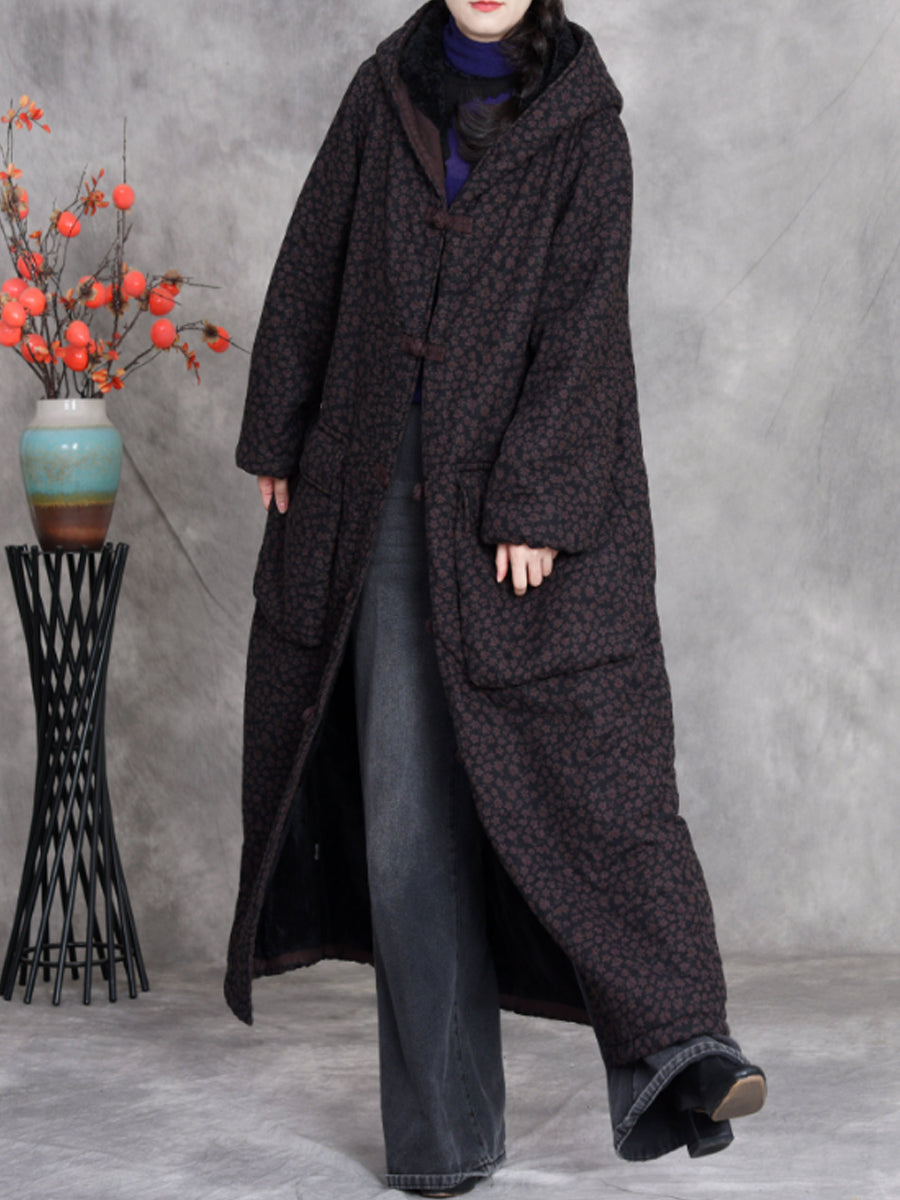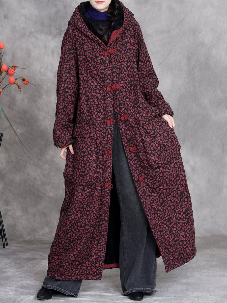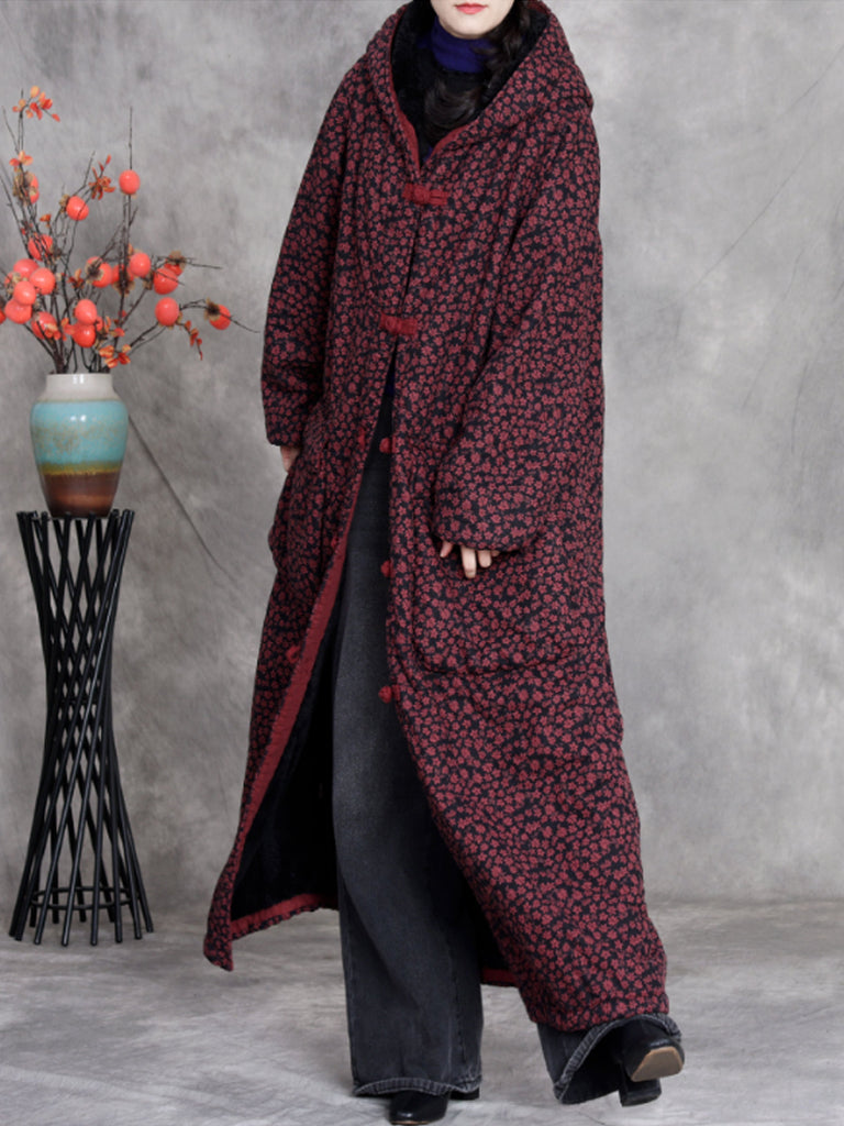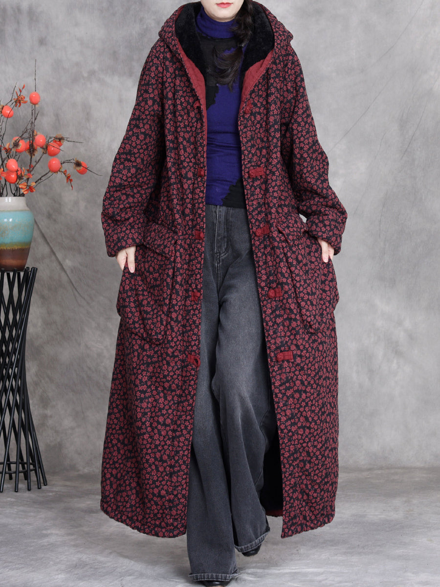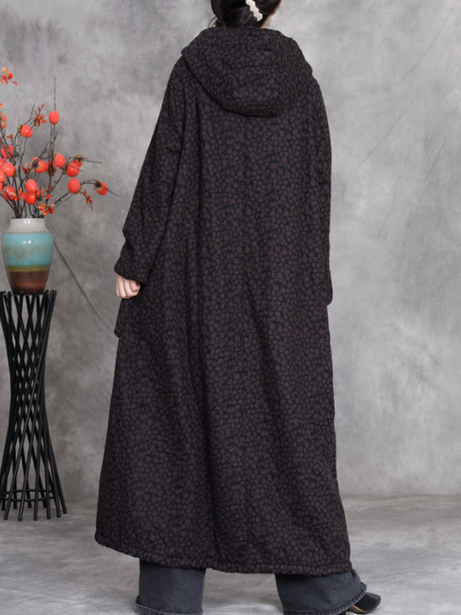 Dámský vintage zimní umělecký květinový fleecový kabát s kapucí