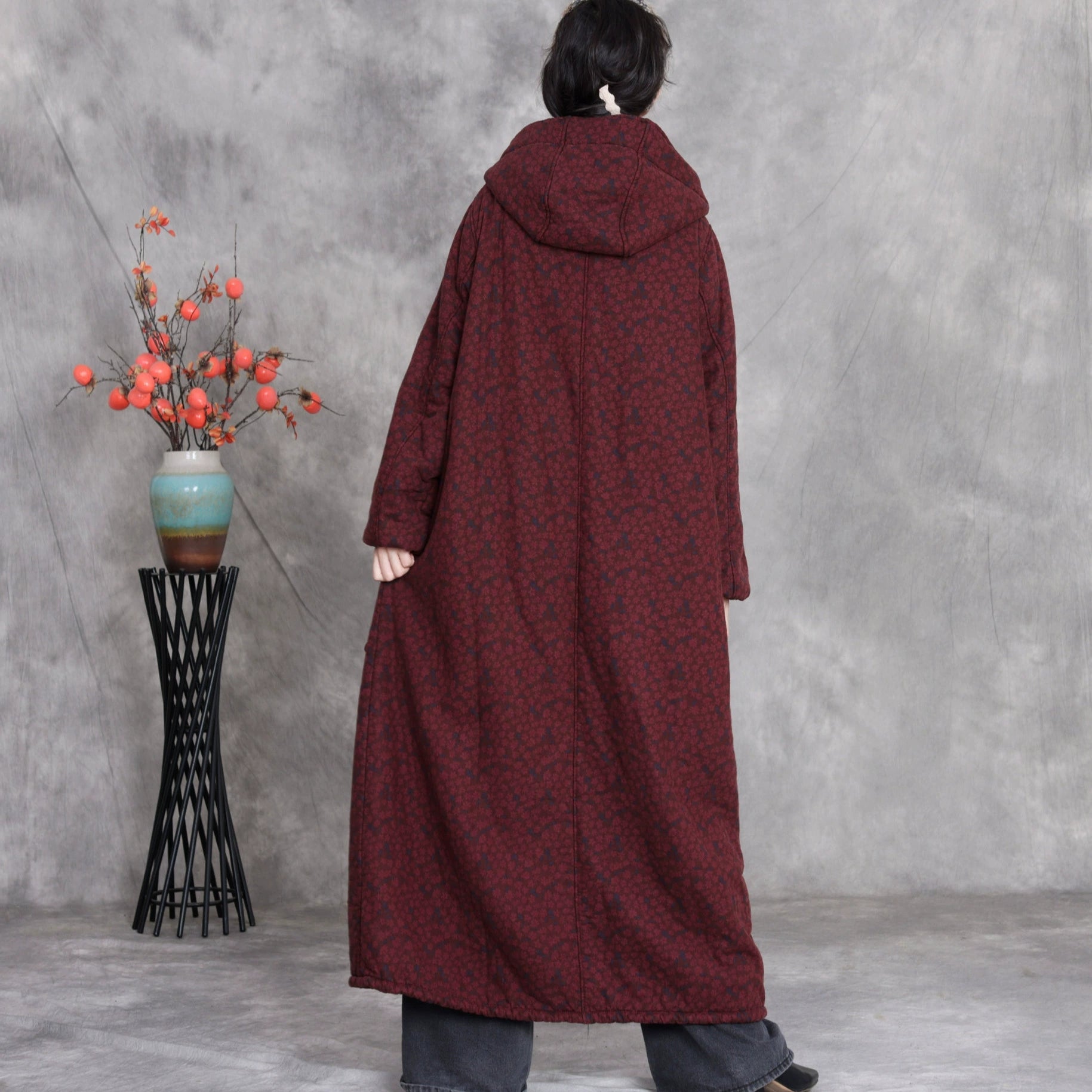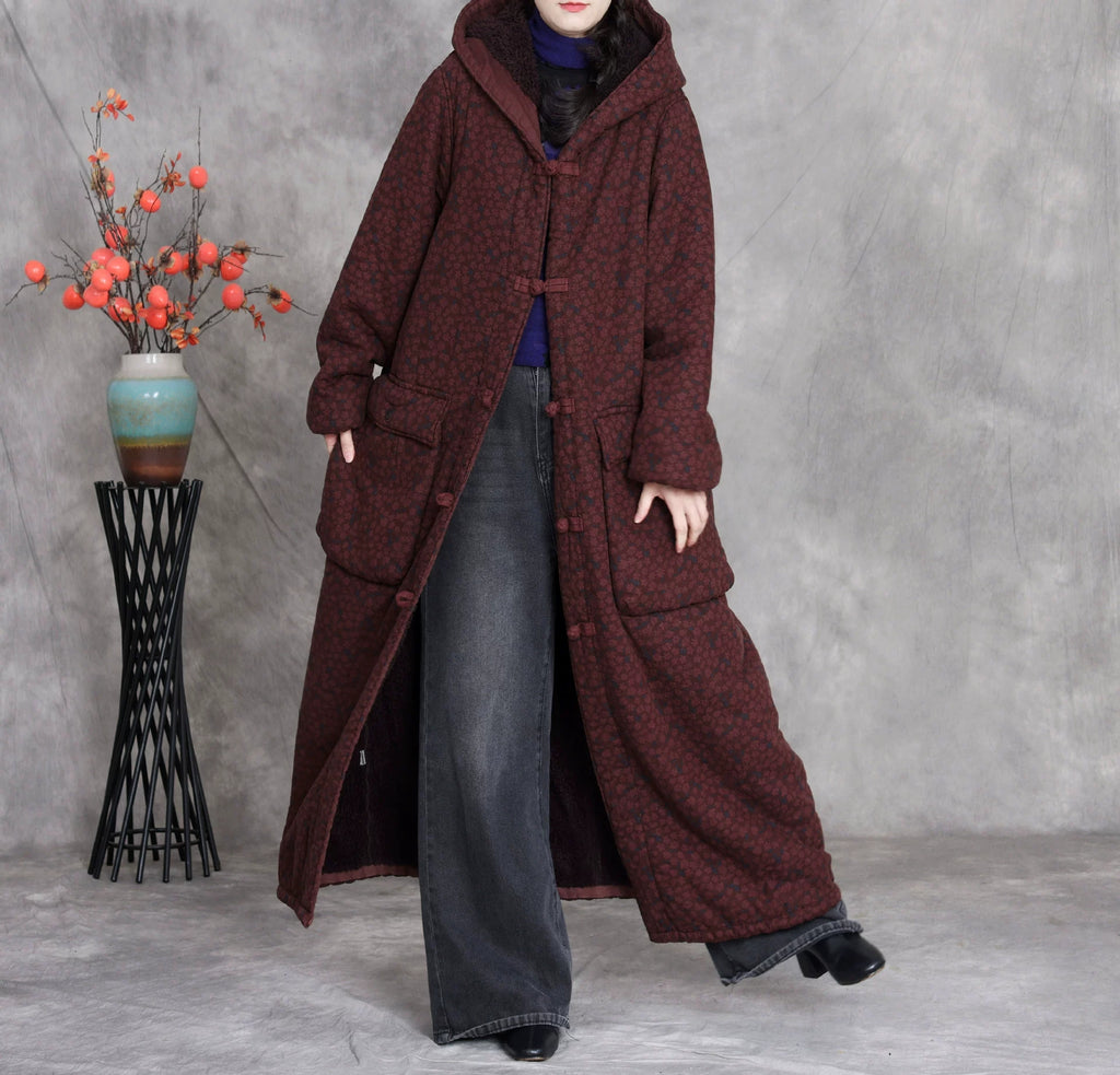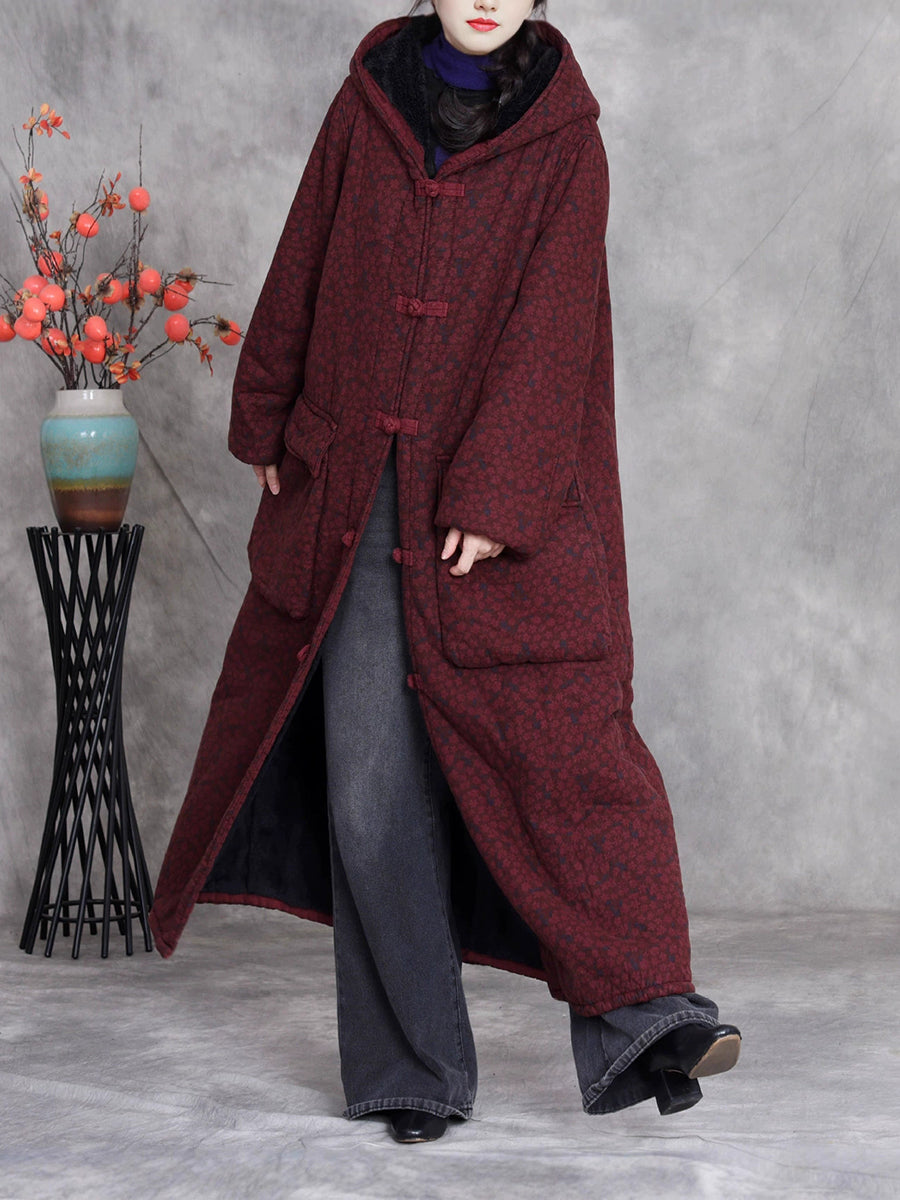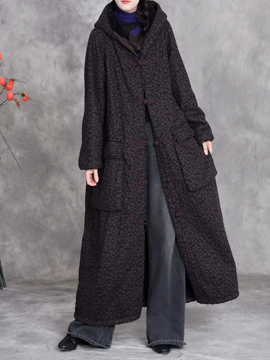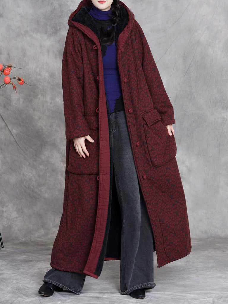 Dámský vintage zimní umělecký květinový fleecový kabát s kapucí
