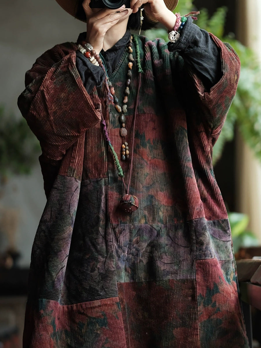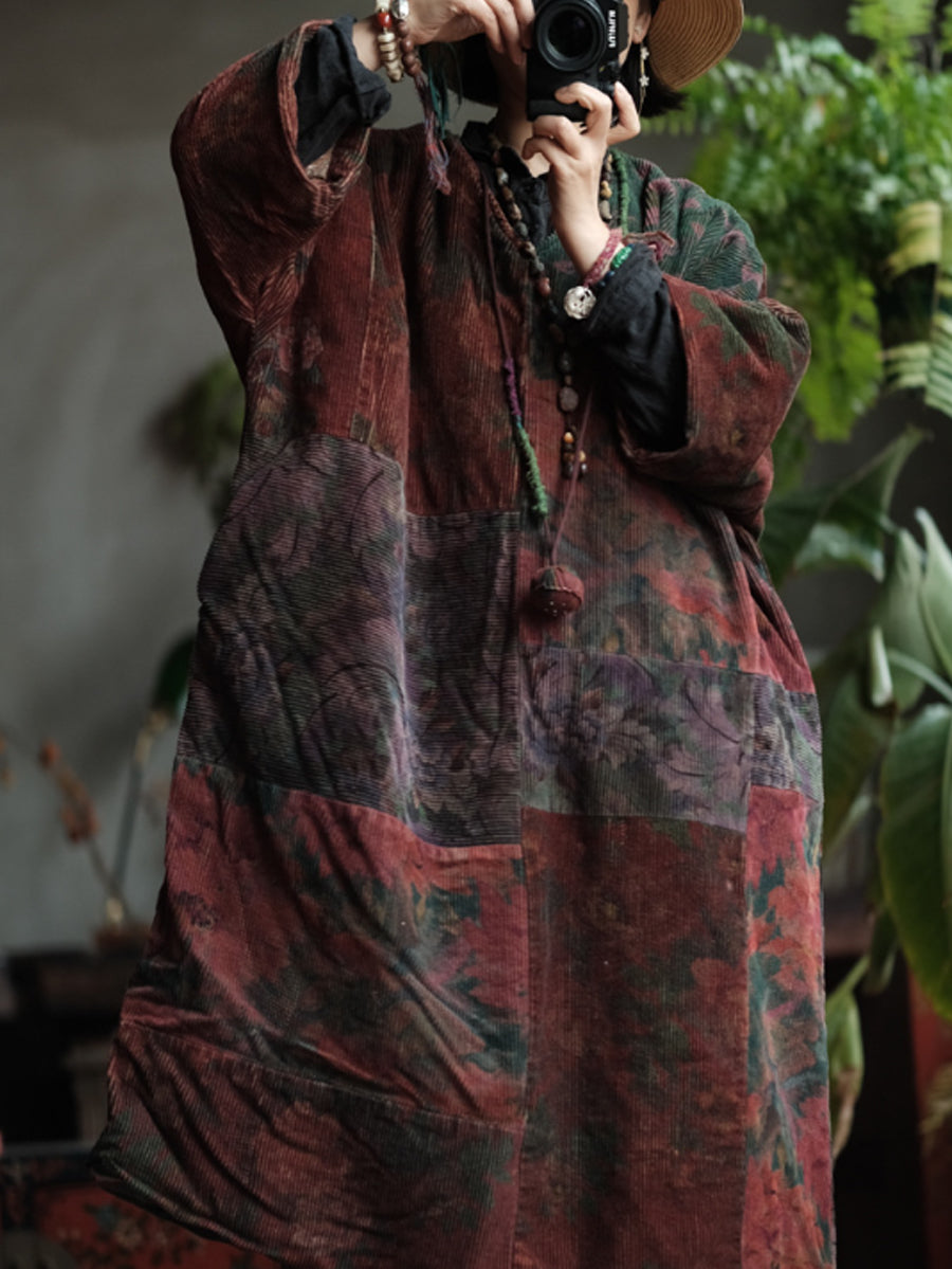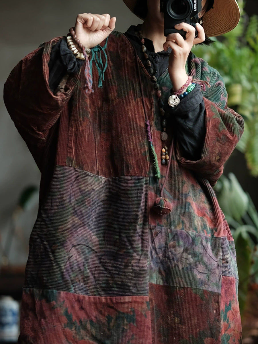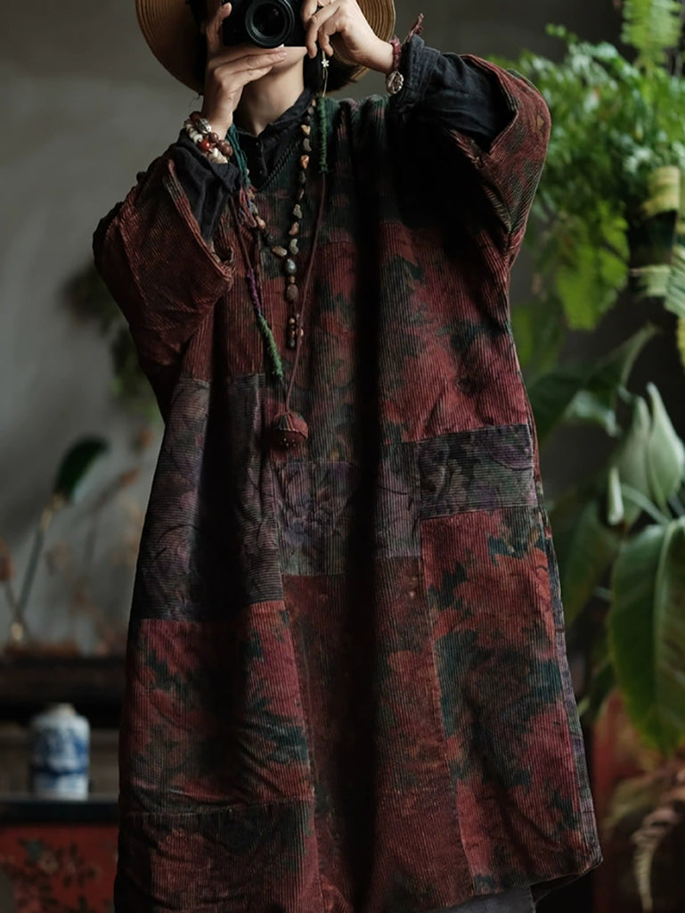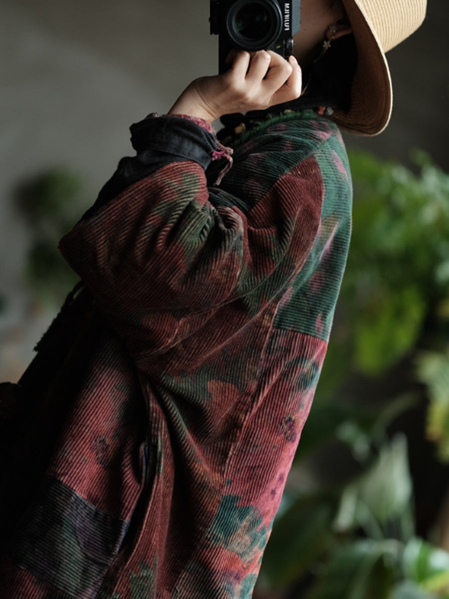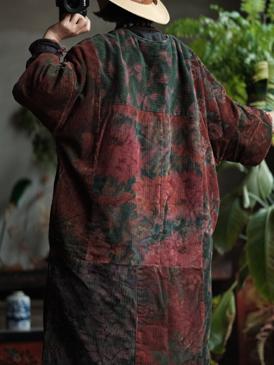 Dámský vintage zimní květinový bavlněný prošívaný kabát s výstřihem do V