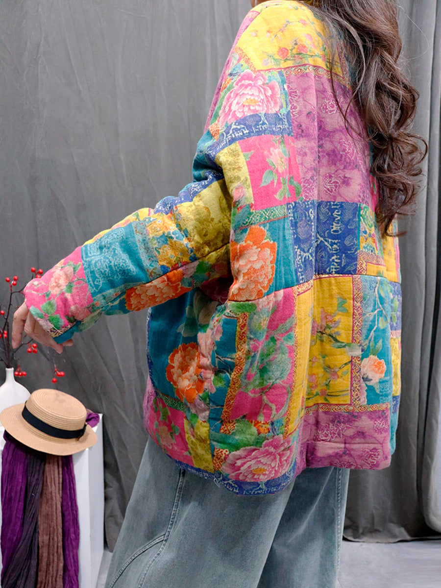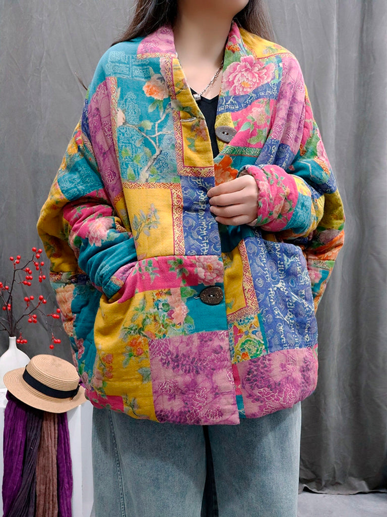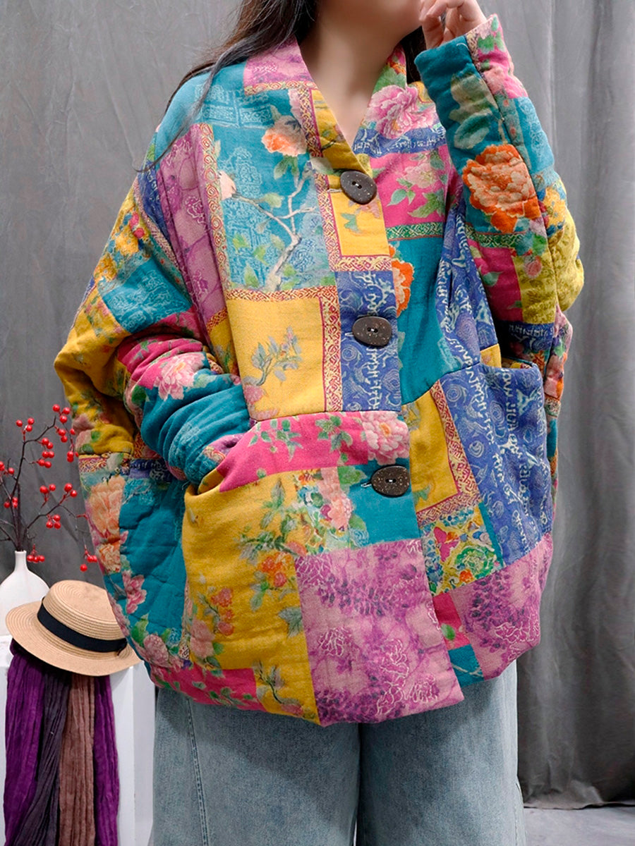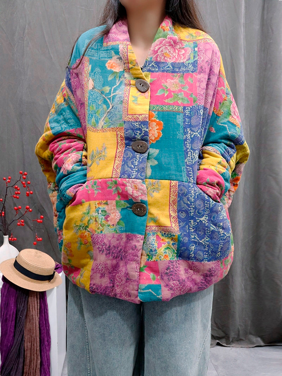 Dámský vintage zimní květinový patchworkový bavlněný kabát s výstřihem do V