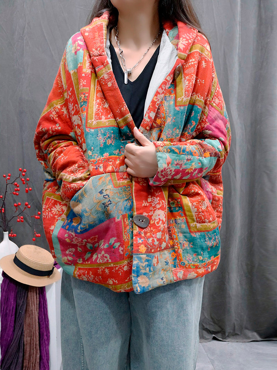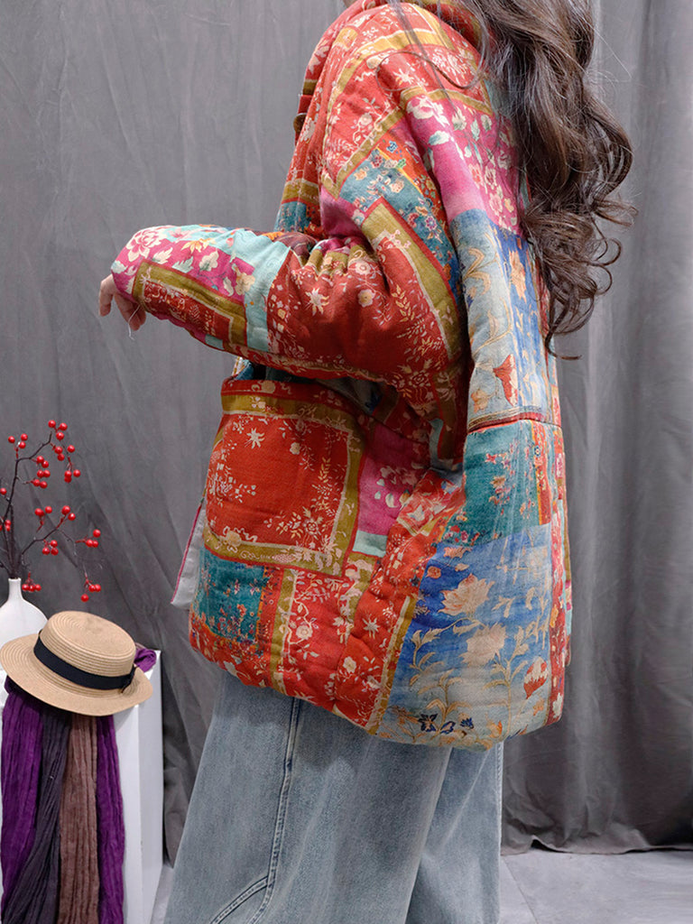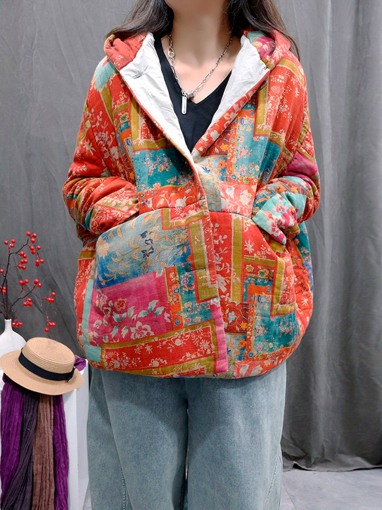 Dámský vintage zimní patchworkový bavlněný kabát s kapucí