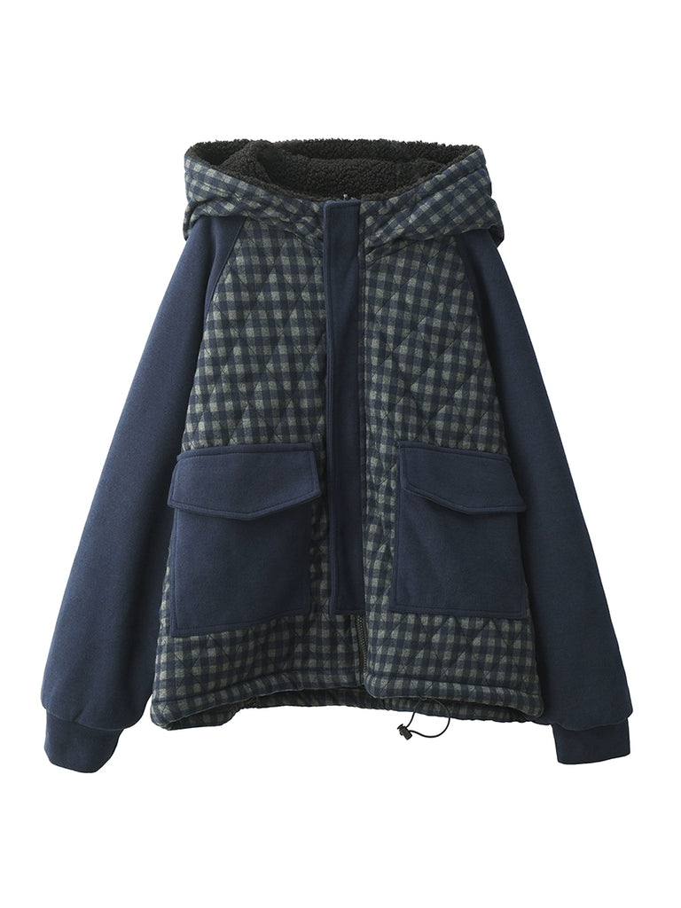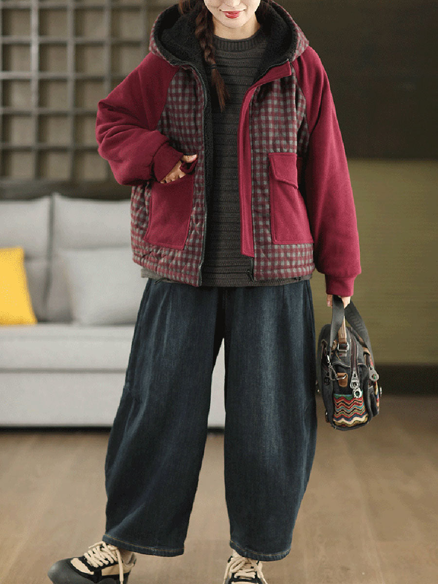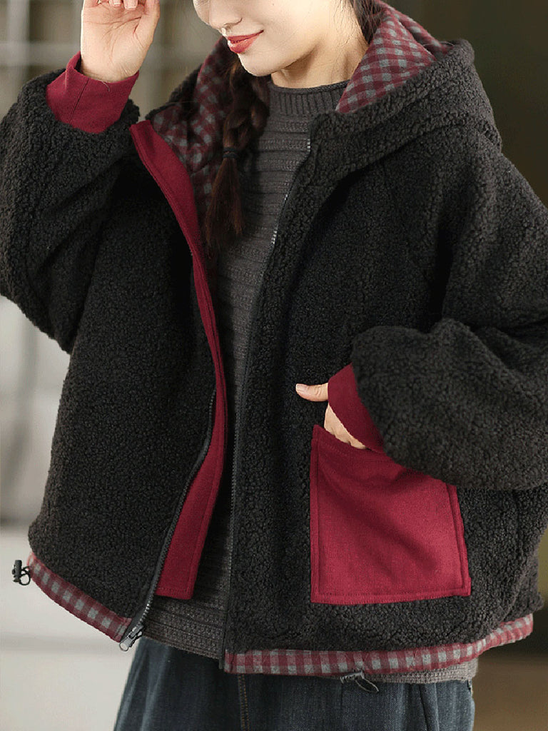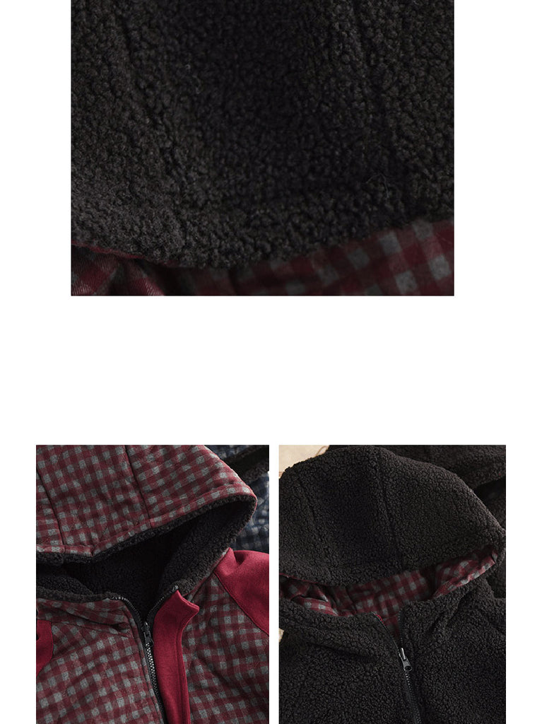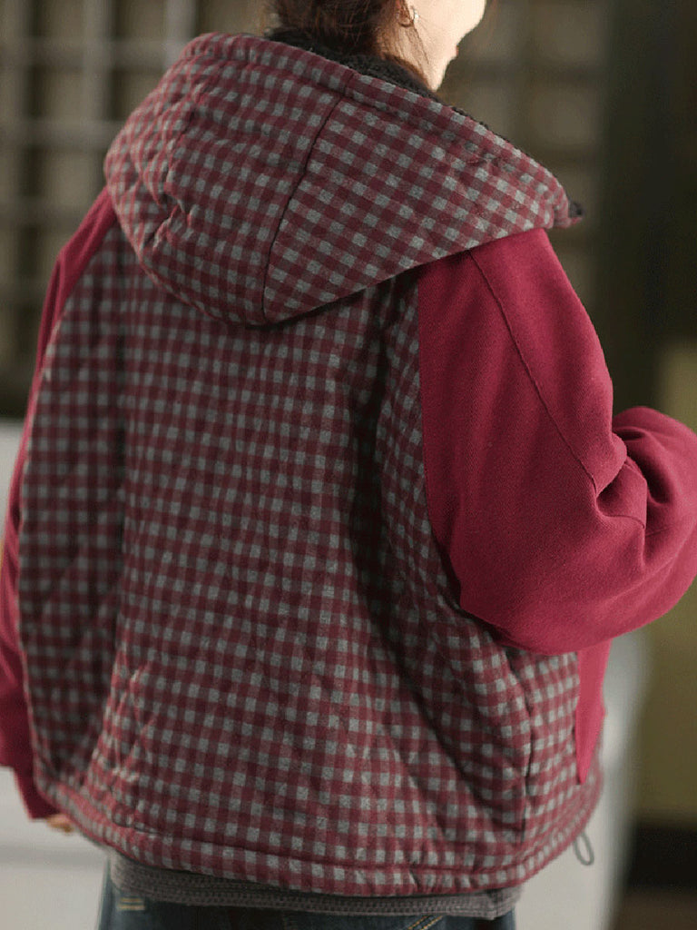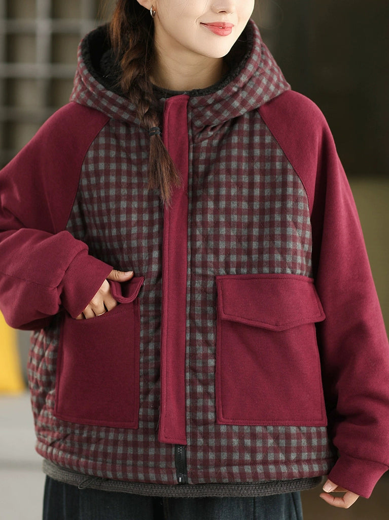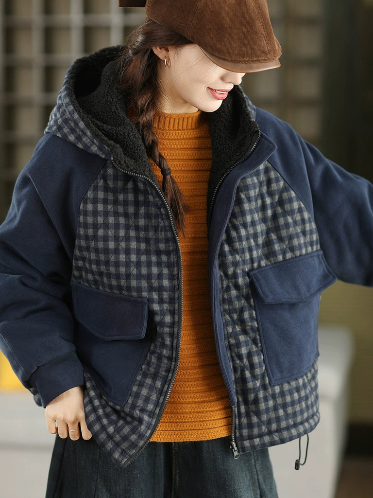Dámský zimní kostkovaný oboustranný kabát s kapucí a fleecovou podšívkou
