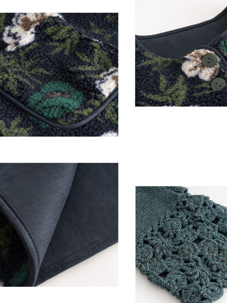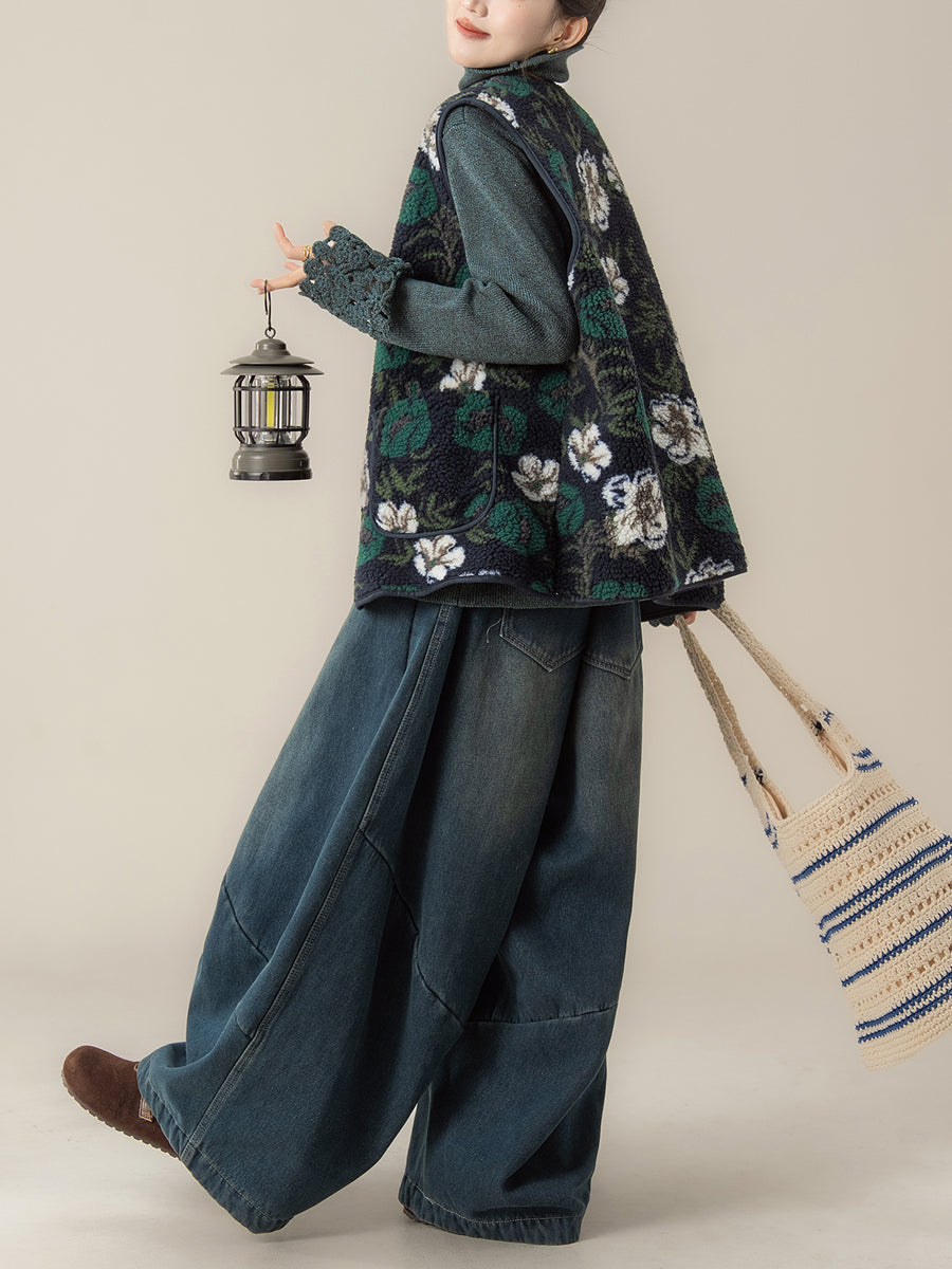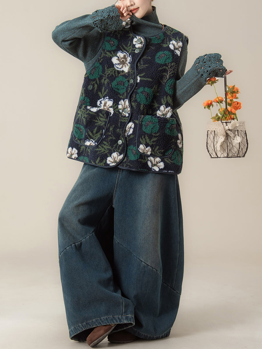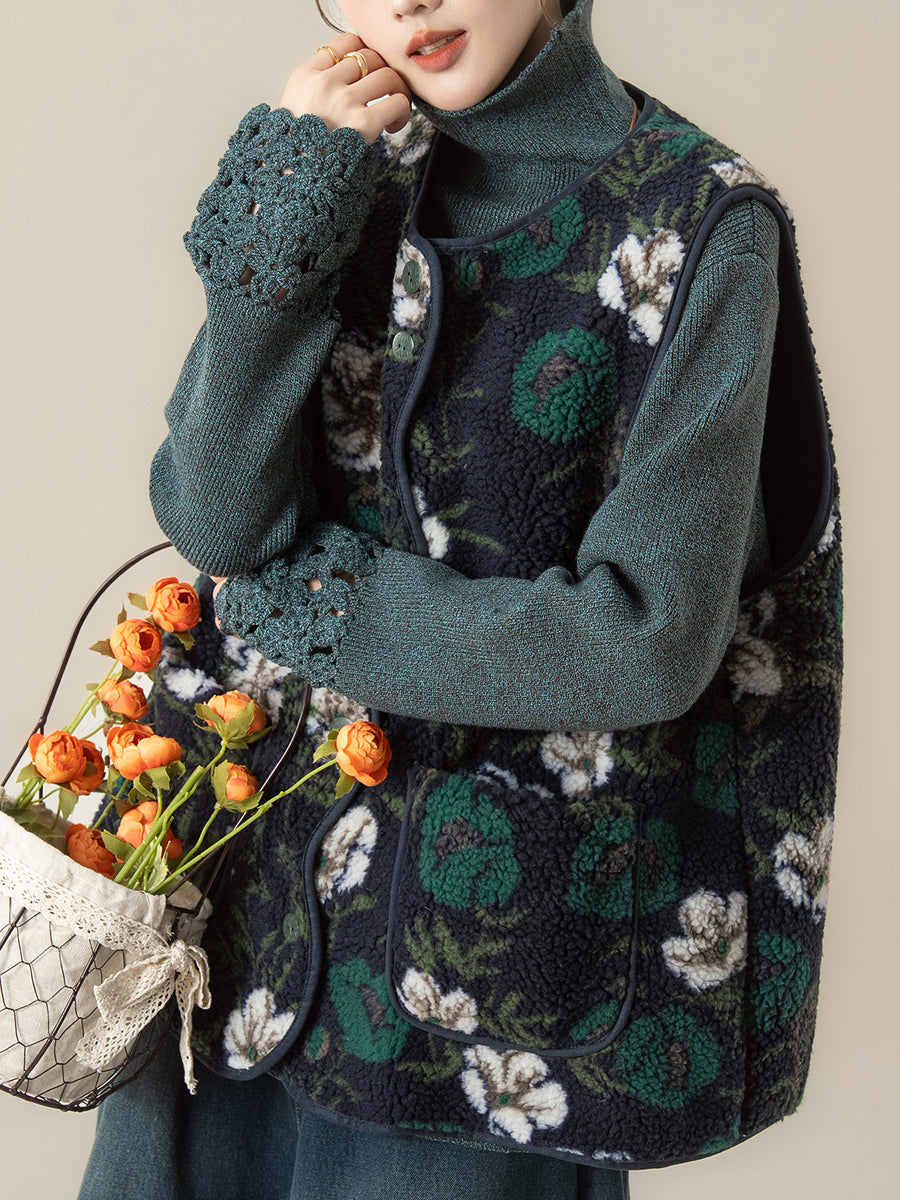 Dámská zimní umělecká květinová fleecová vesta s výstřihem do O-neck