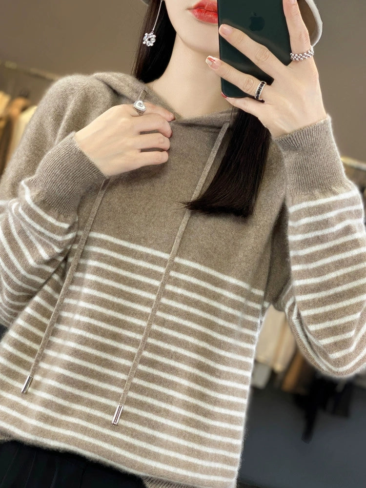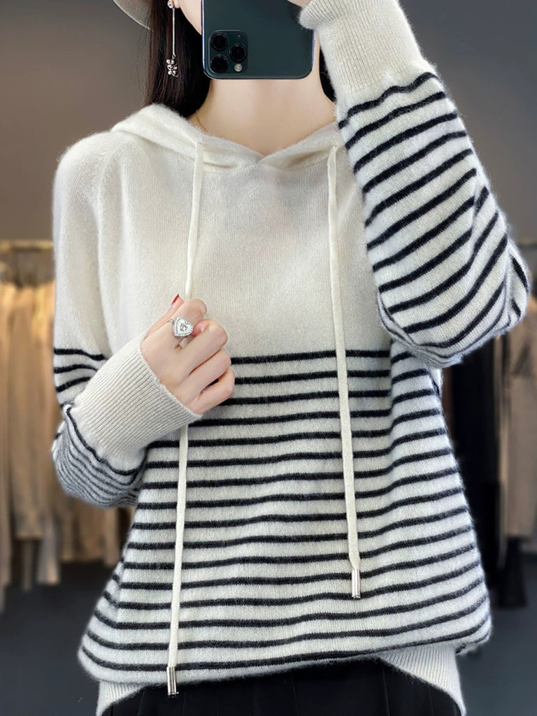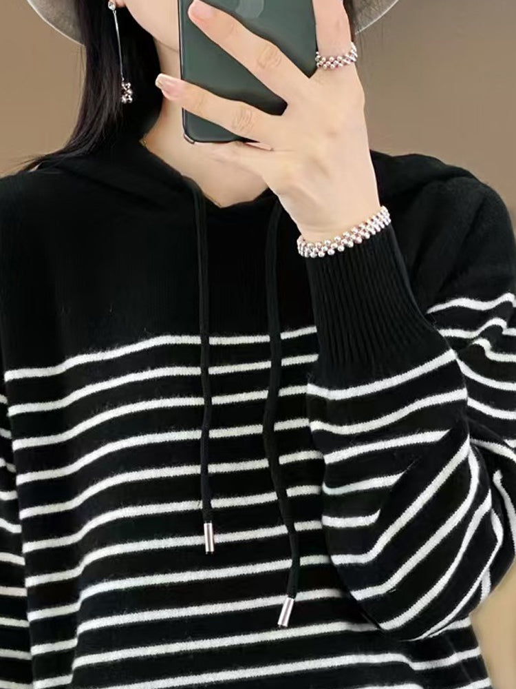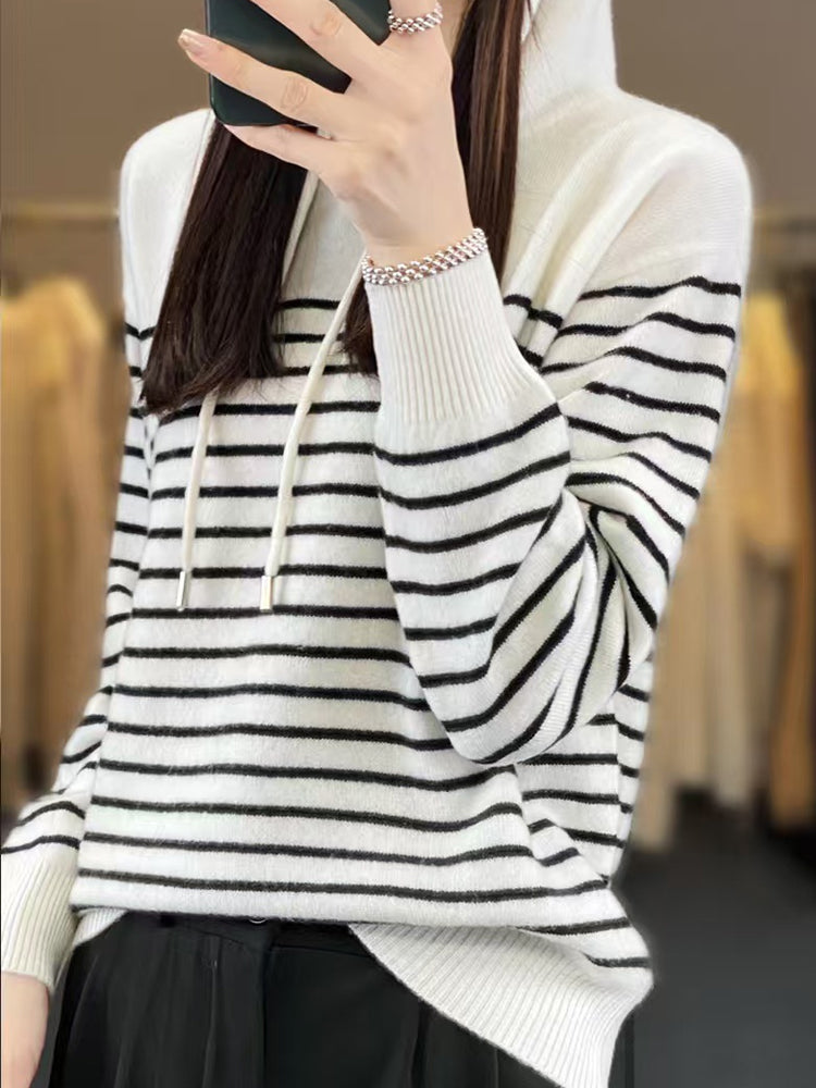 Dámský zimní ležérní pruhovaný svetr s kapucí