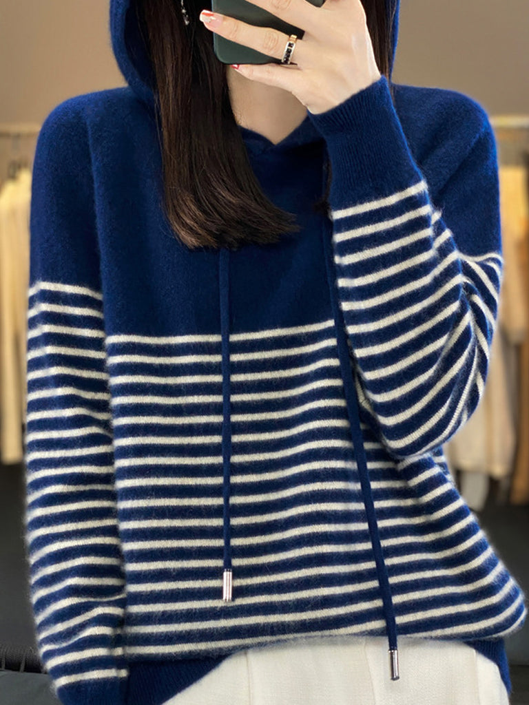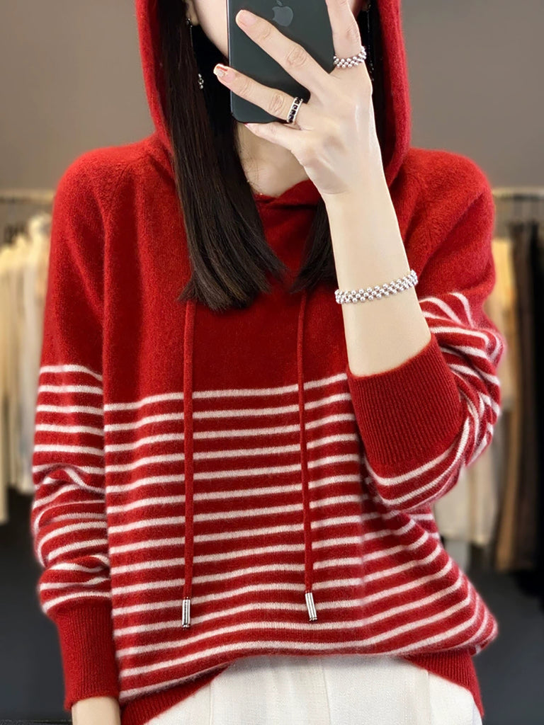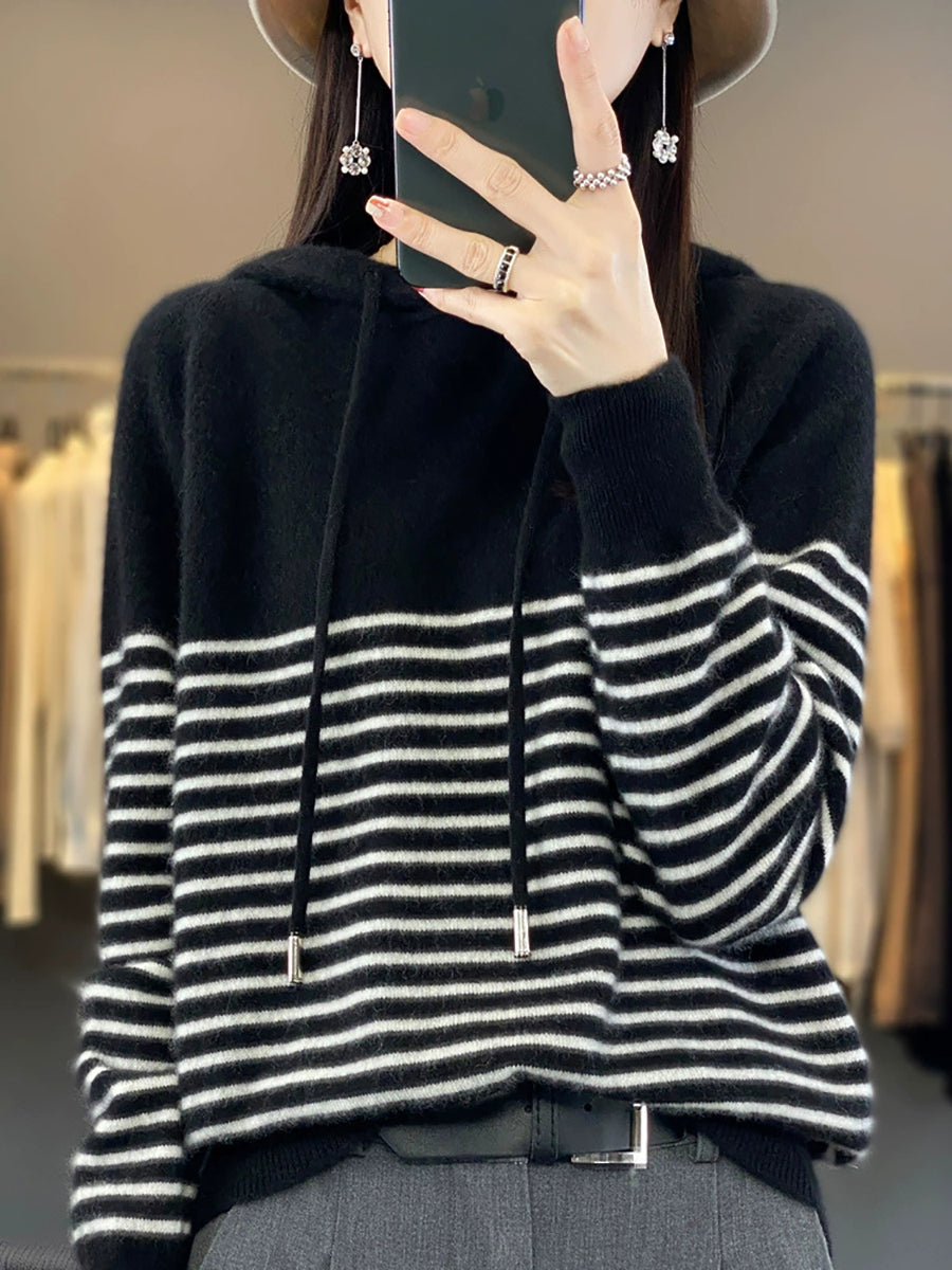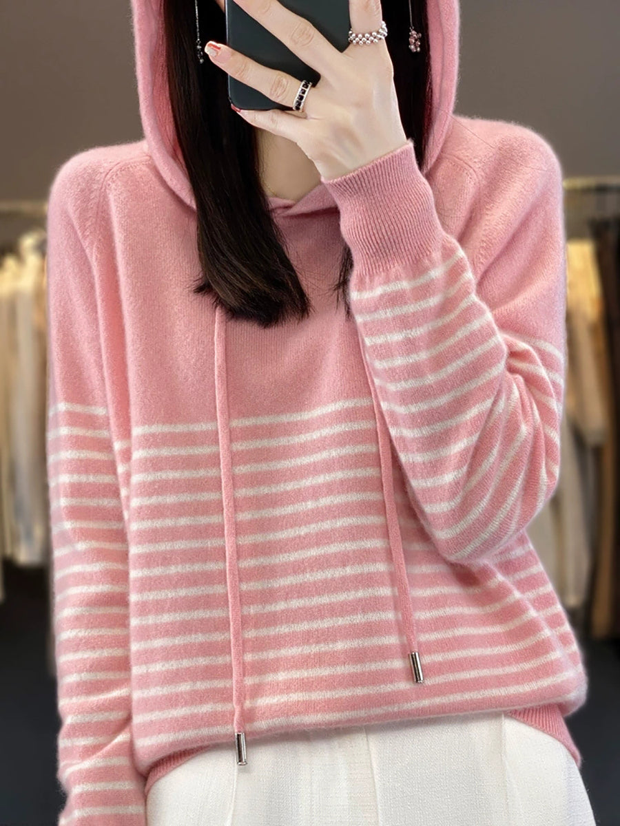 Dámský zimní ležérní pruhovaný svetr s kapucí