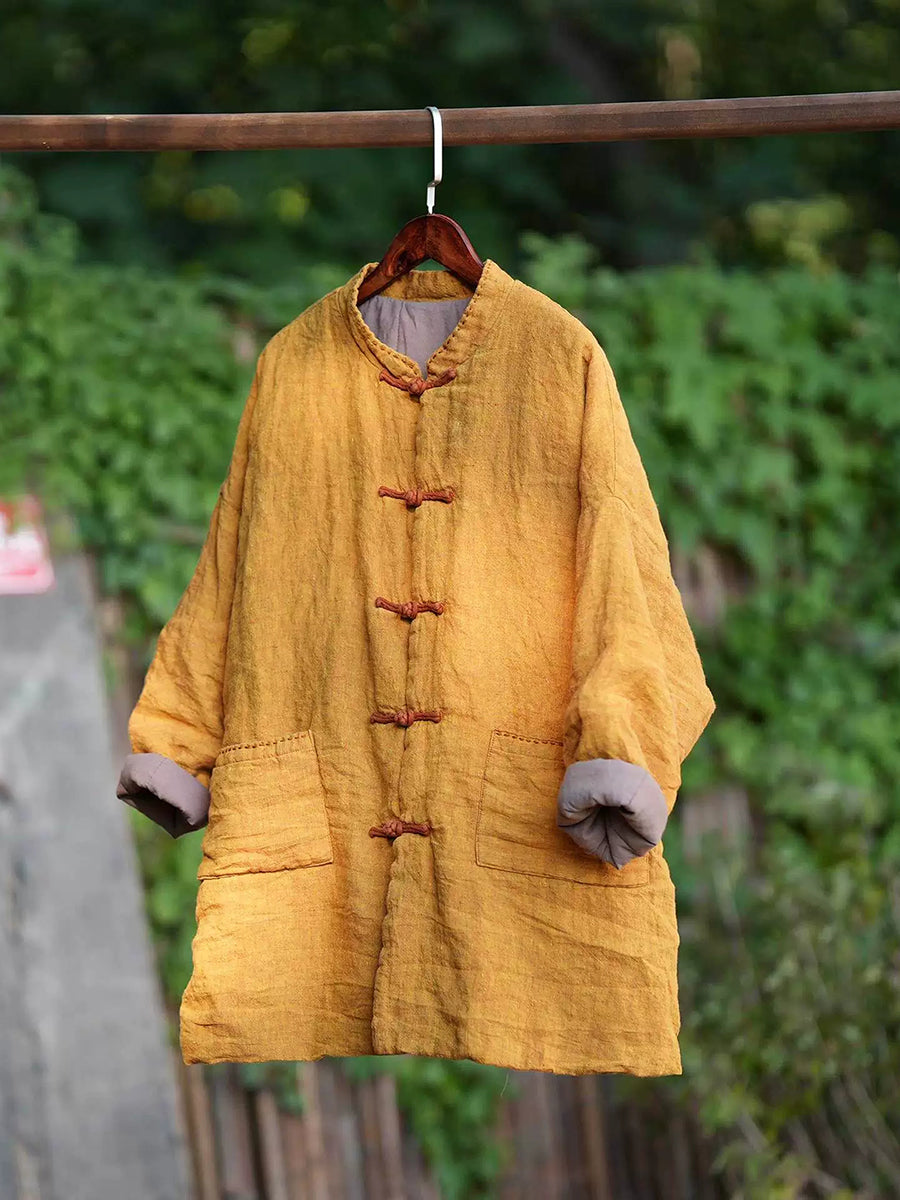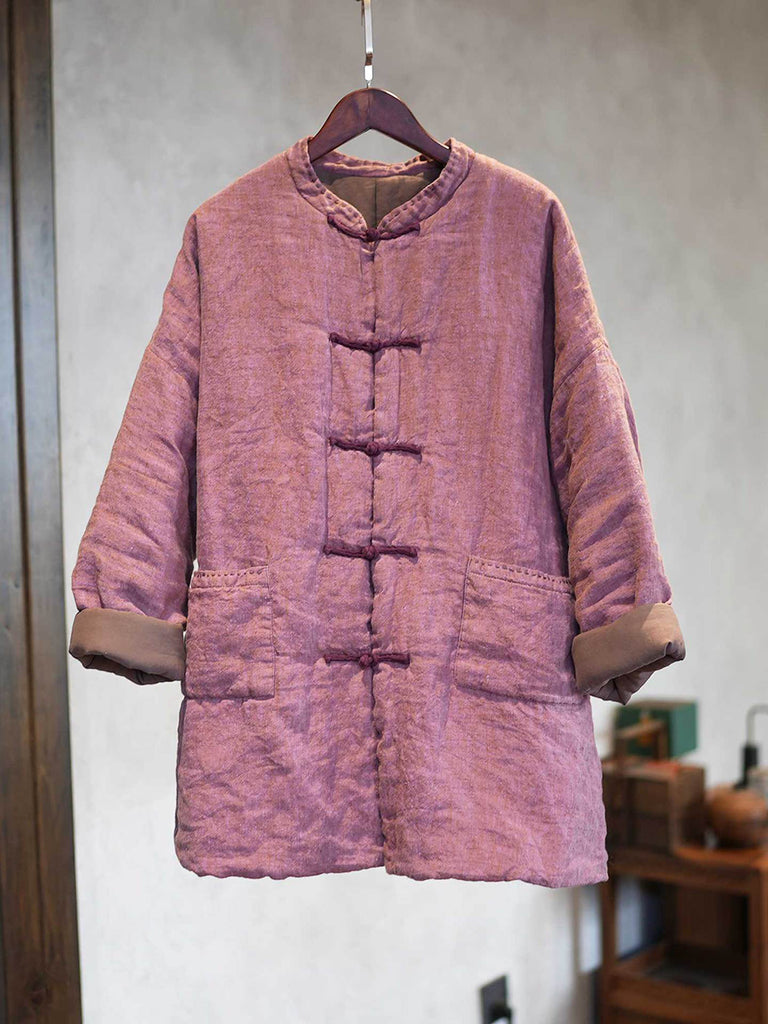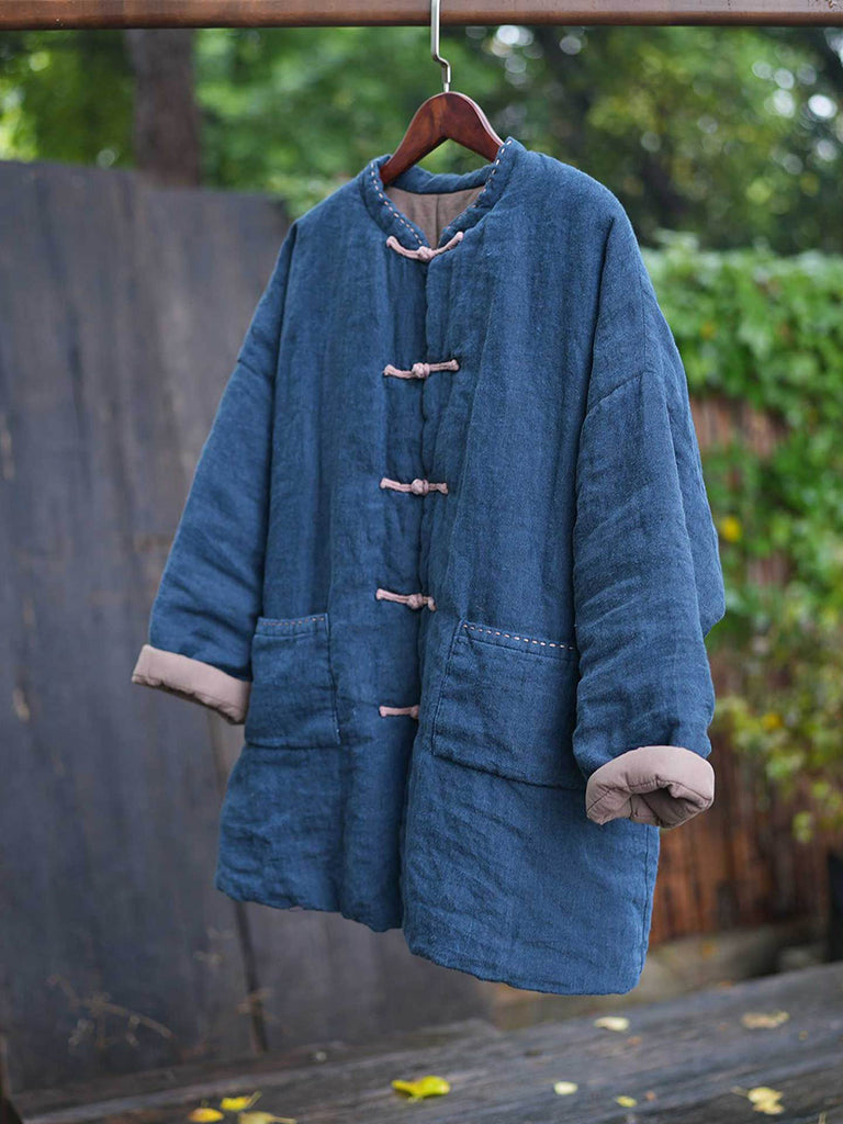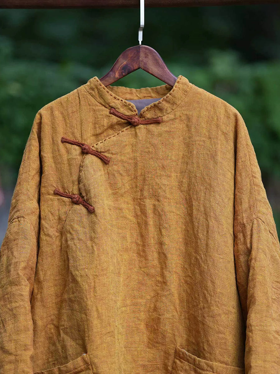 Dámský zimní etnický čistě barevný stojáček s límcem, lněný prošívaný kabát