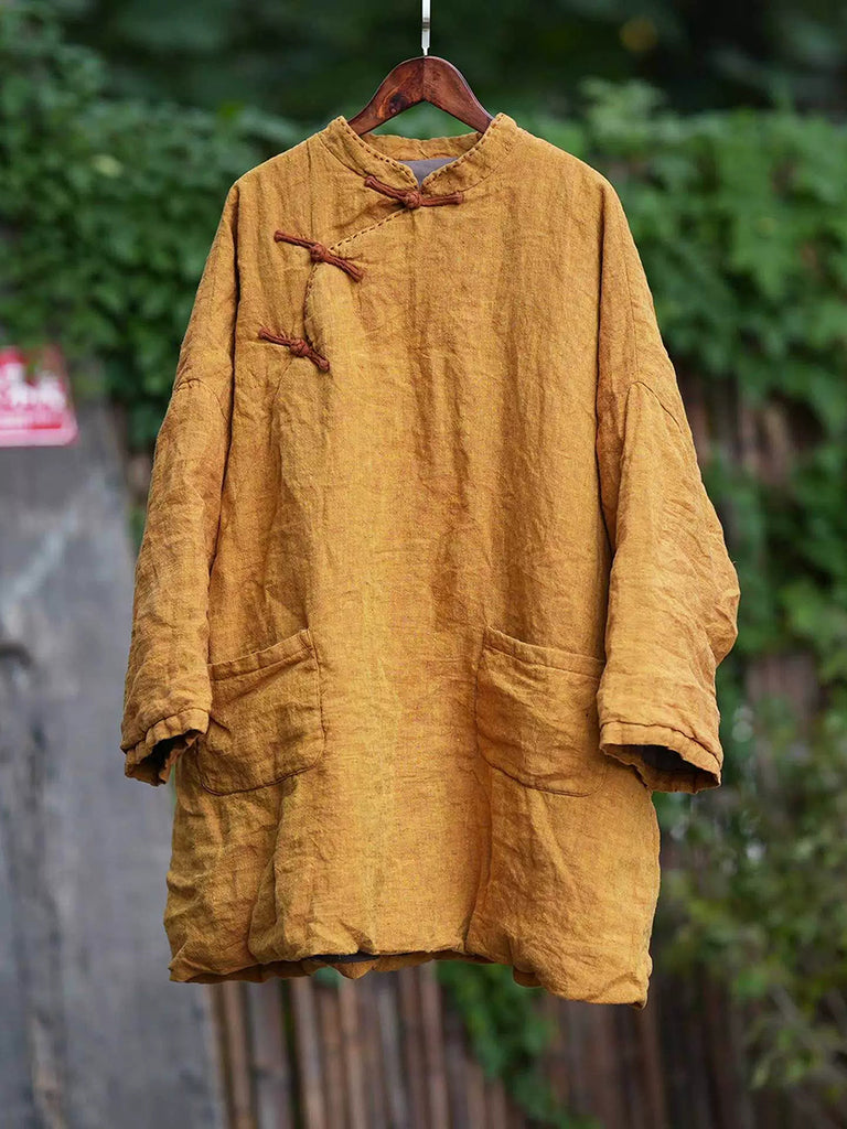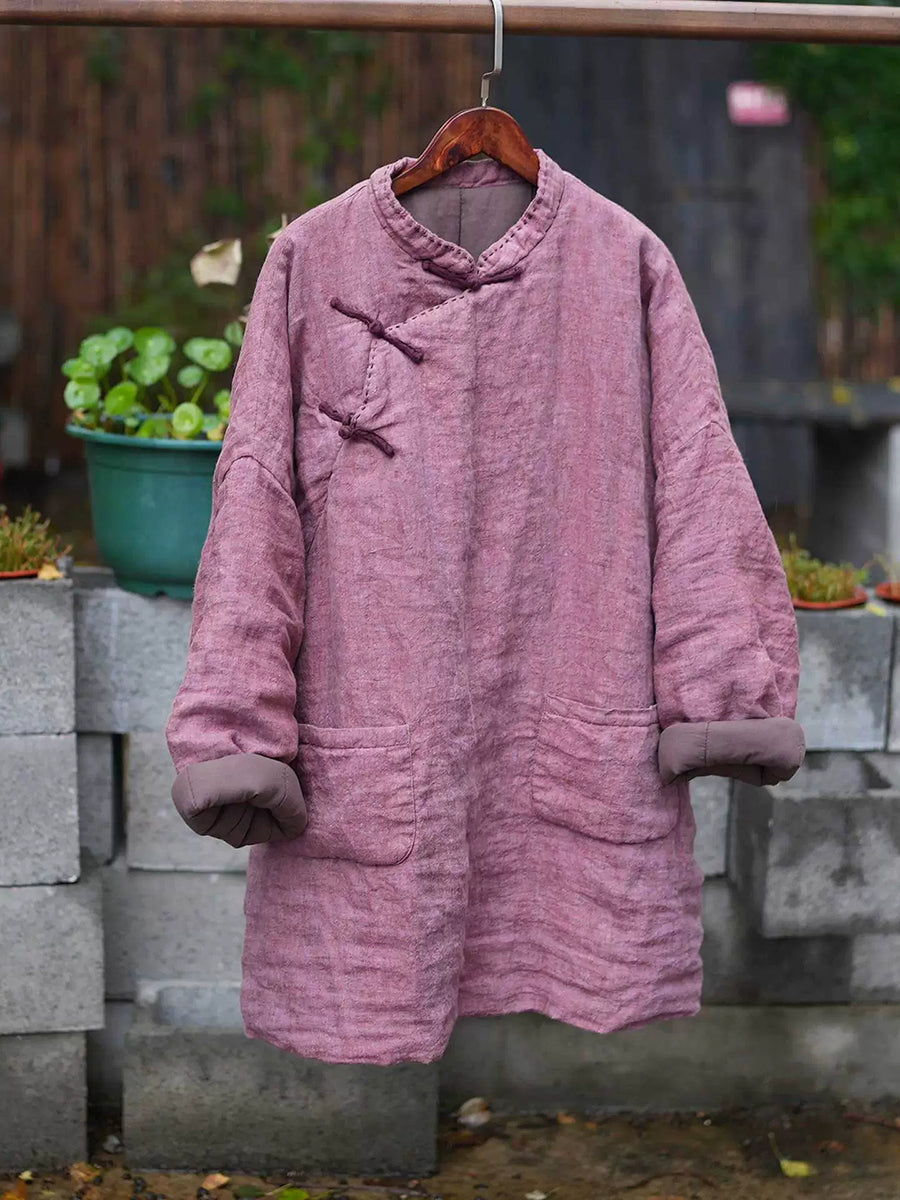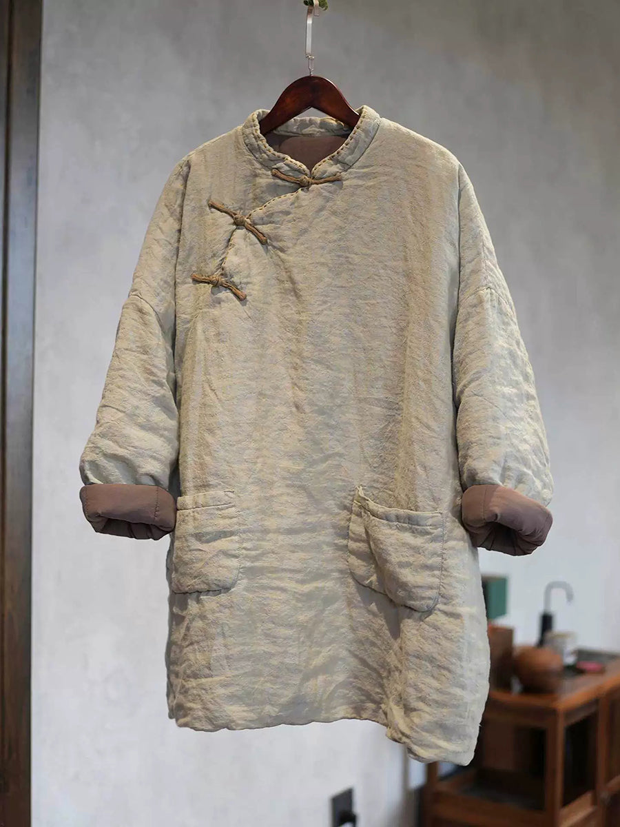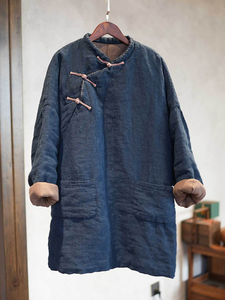 Dámský zimní etnický čistě barevný stojáček s límcem, lněný prošívaný kabát