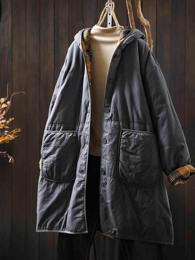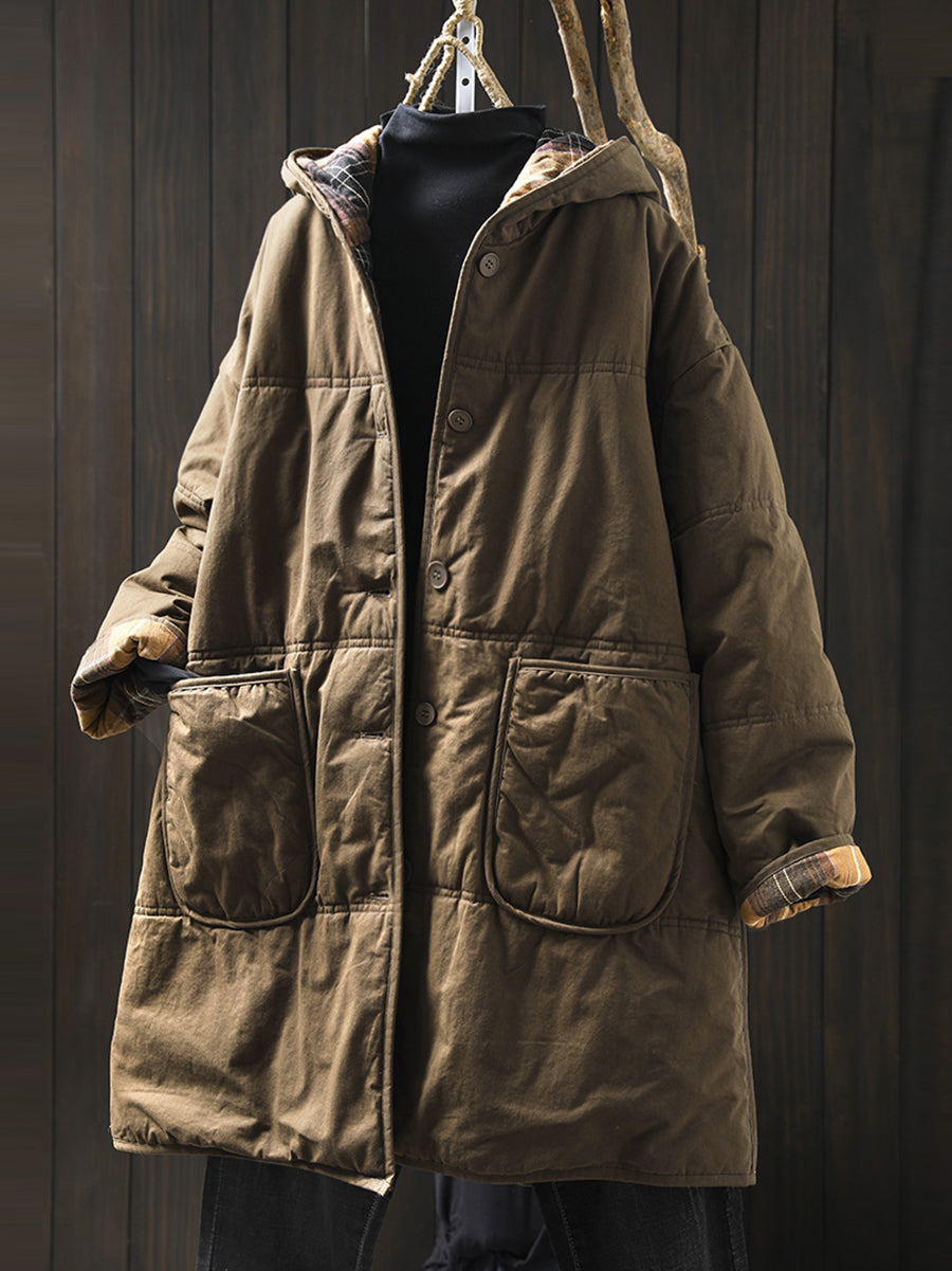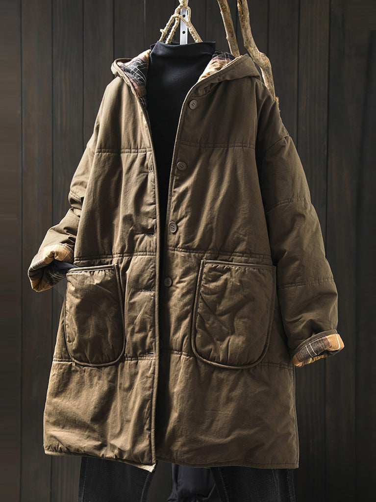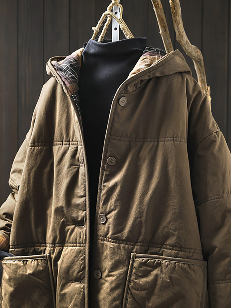 Tento kabát je navržen s kostkovaným vzorem a límcem s výstřihem do O a je vyroben z bavlněného materiálu. Plné raglánové rukávy mu dodávají retro vzhled, takže se skvěle hodí na zimní nebo podzimní období.