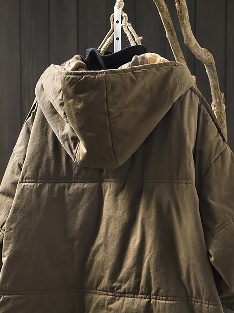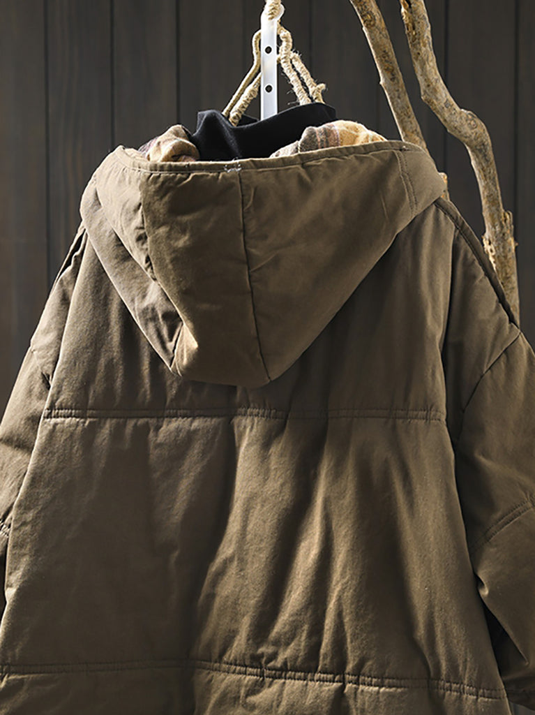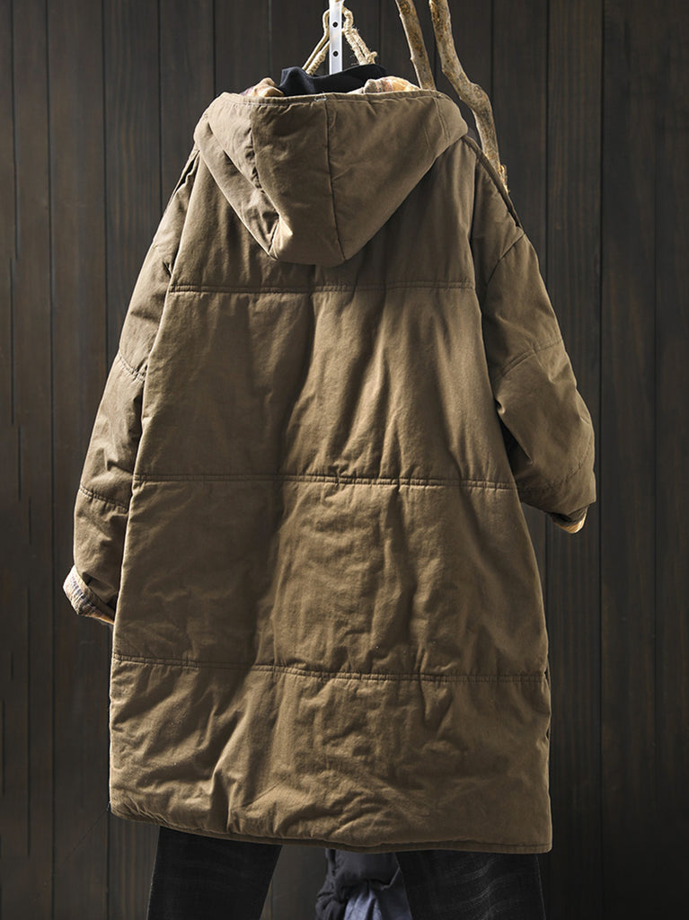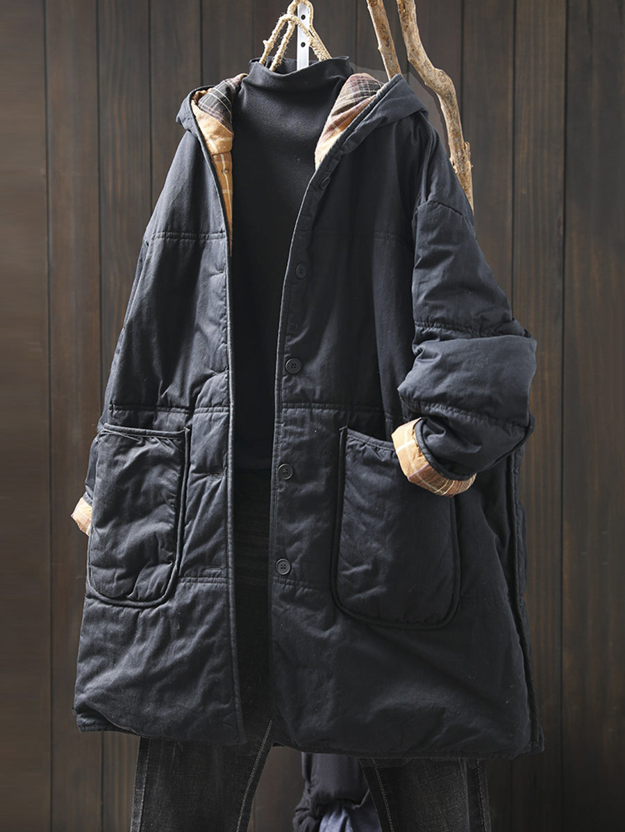 Tento kabát je navržen s kostkovaným vzorem a límcem s výstřihem do O a je vyroben z bavlněného materiálu. Plné raglánové rukávy mu dodávají retro vzhled, takže se skvěle hodí na zimní nebo podzimní období.
