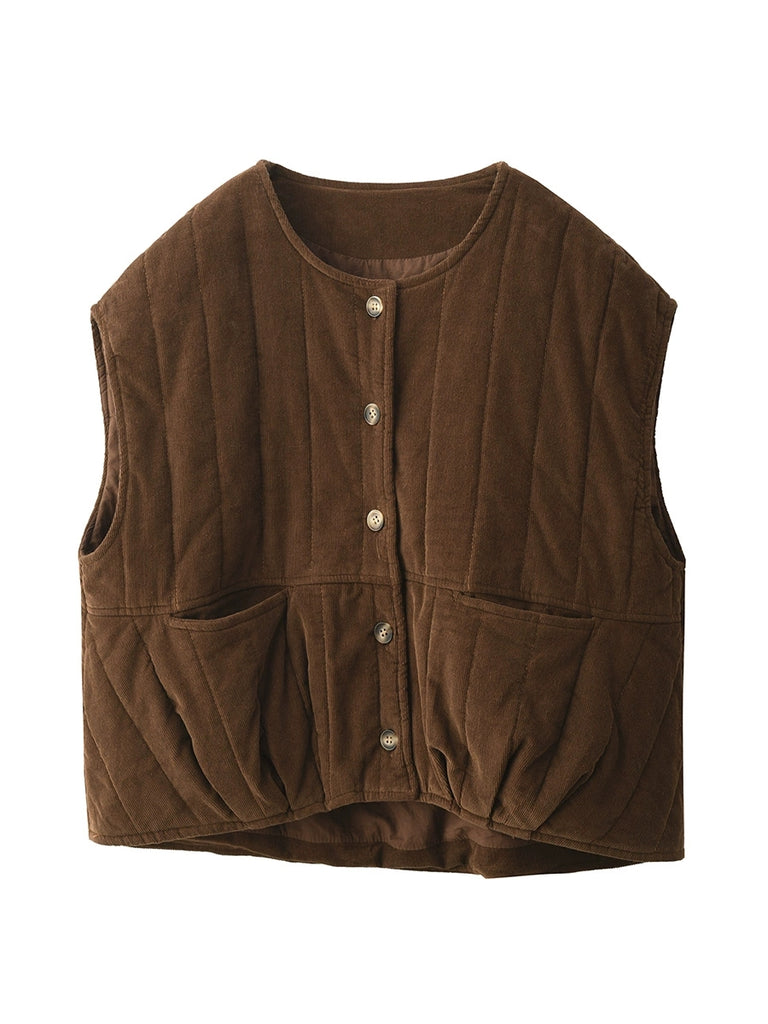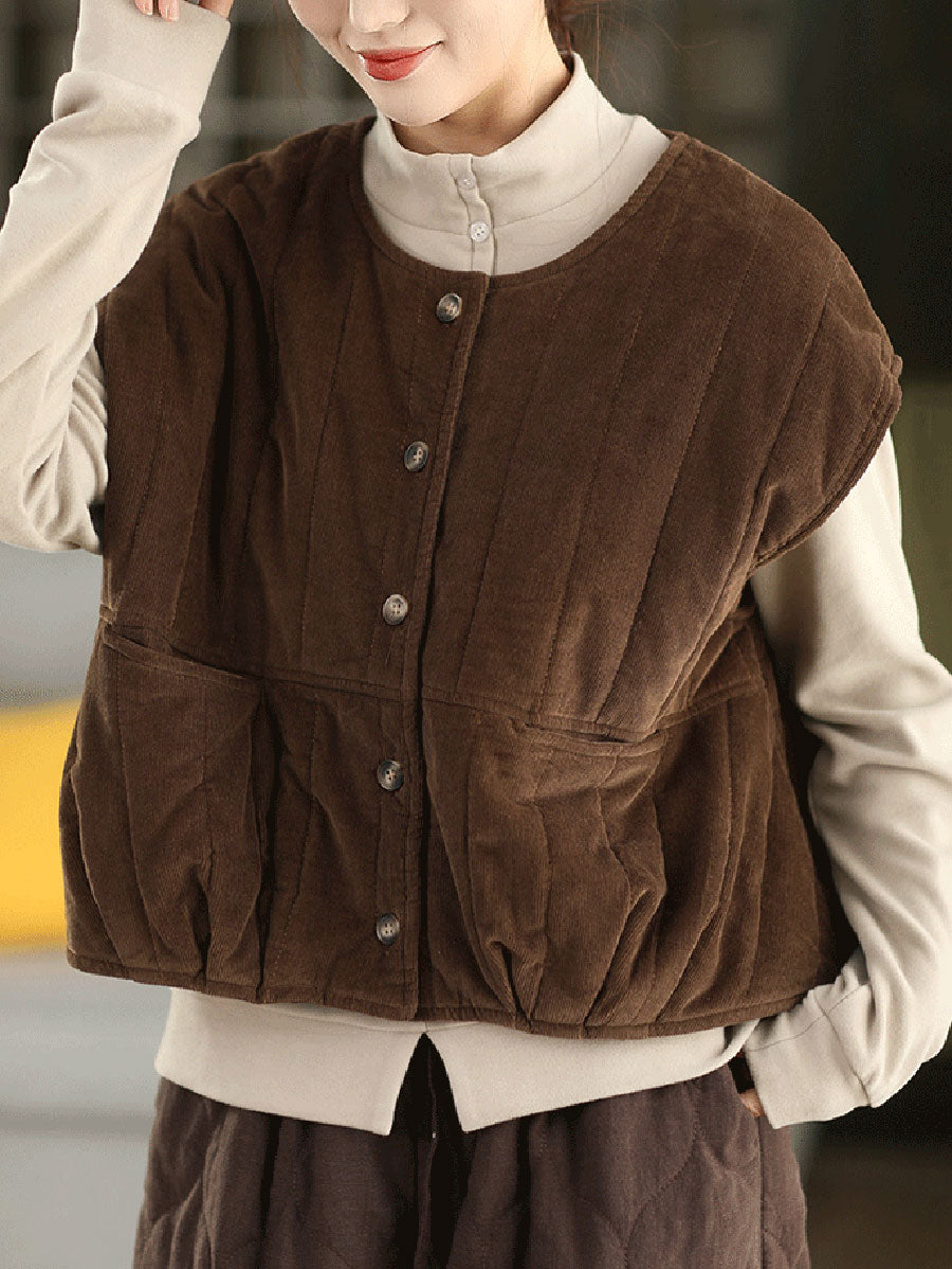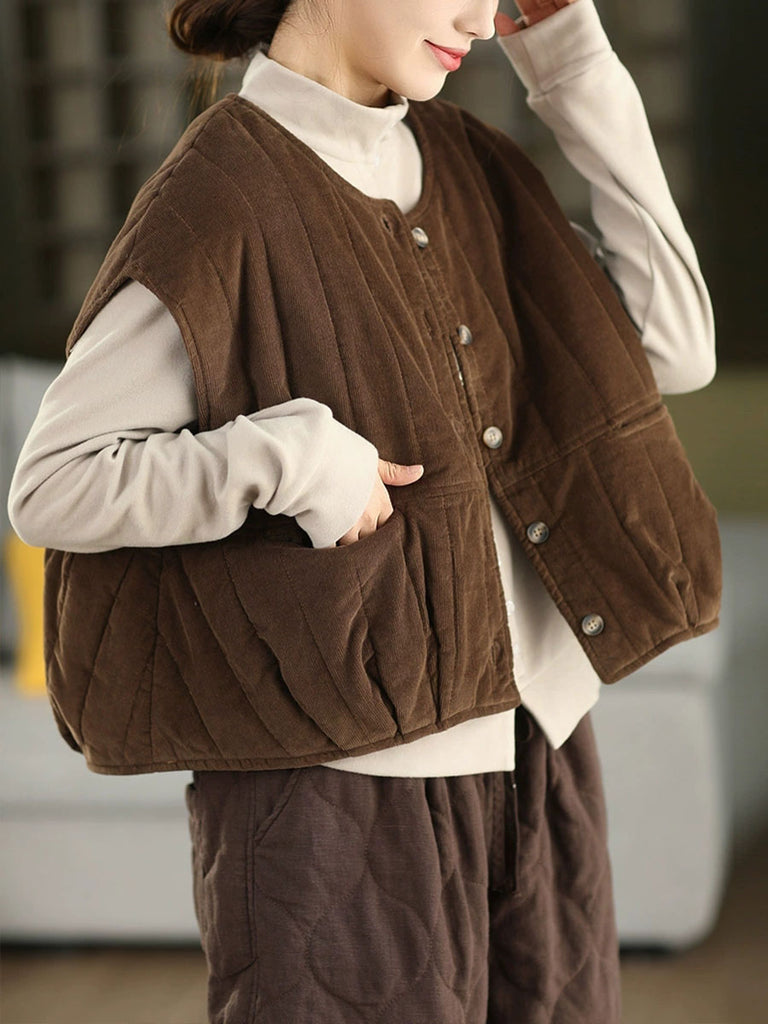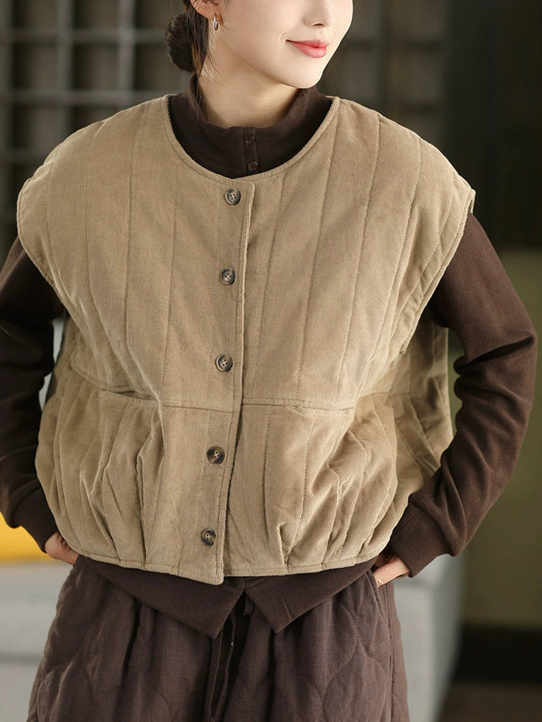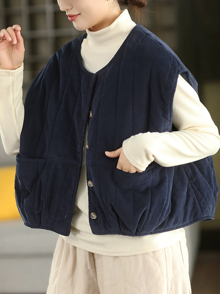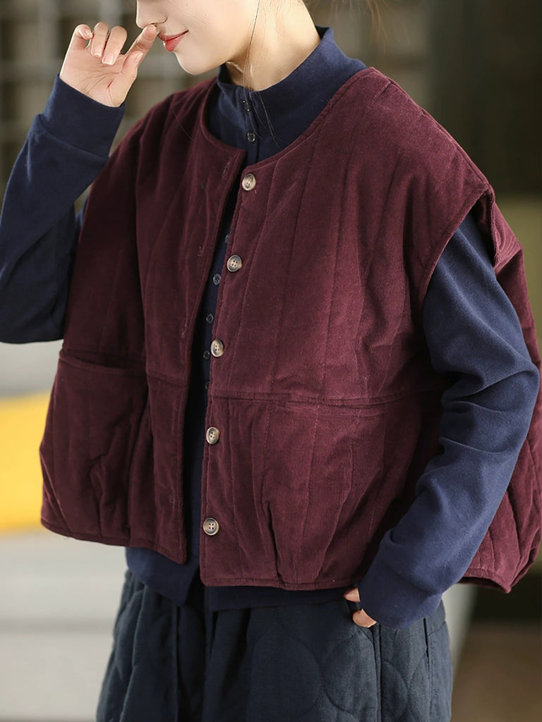 Dámská zimní vesta s čistě barevným výstřihem do O-neck z manšestru a prošívanou podšívkou
